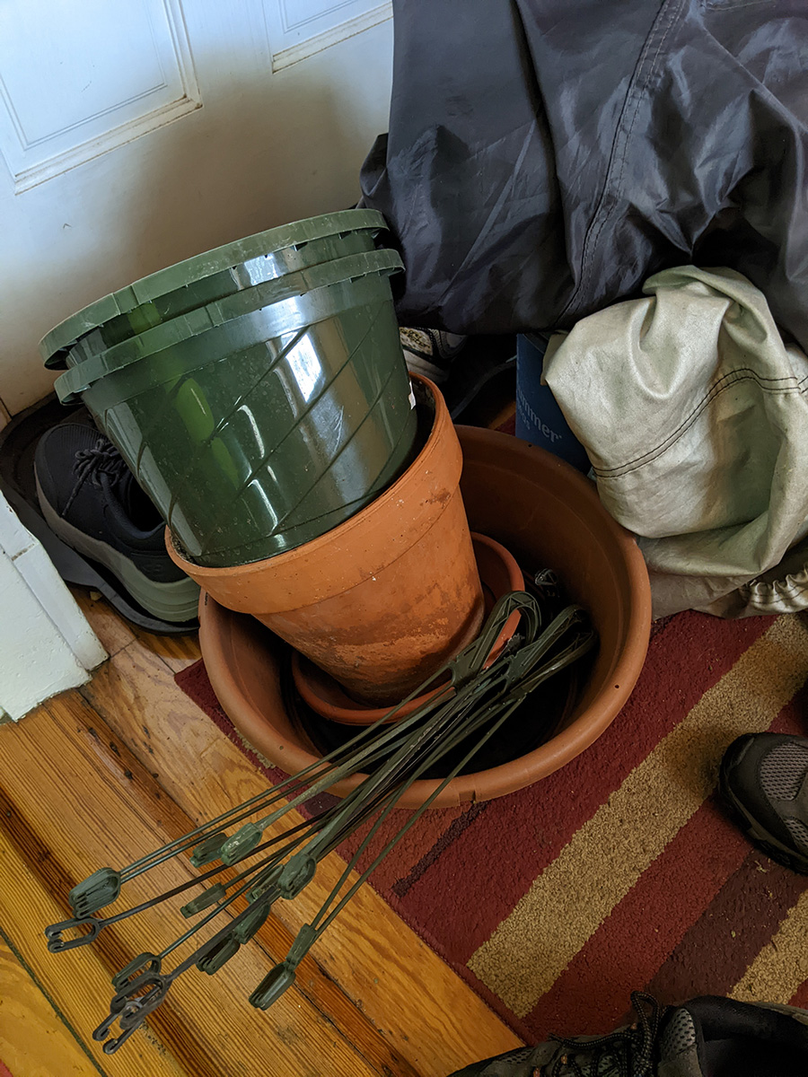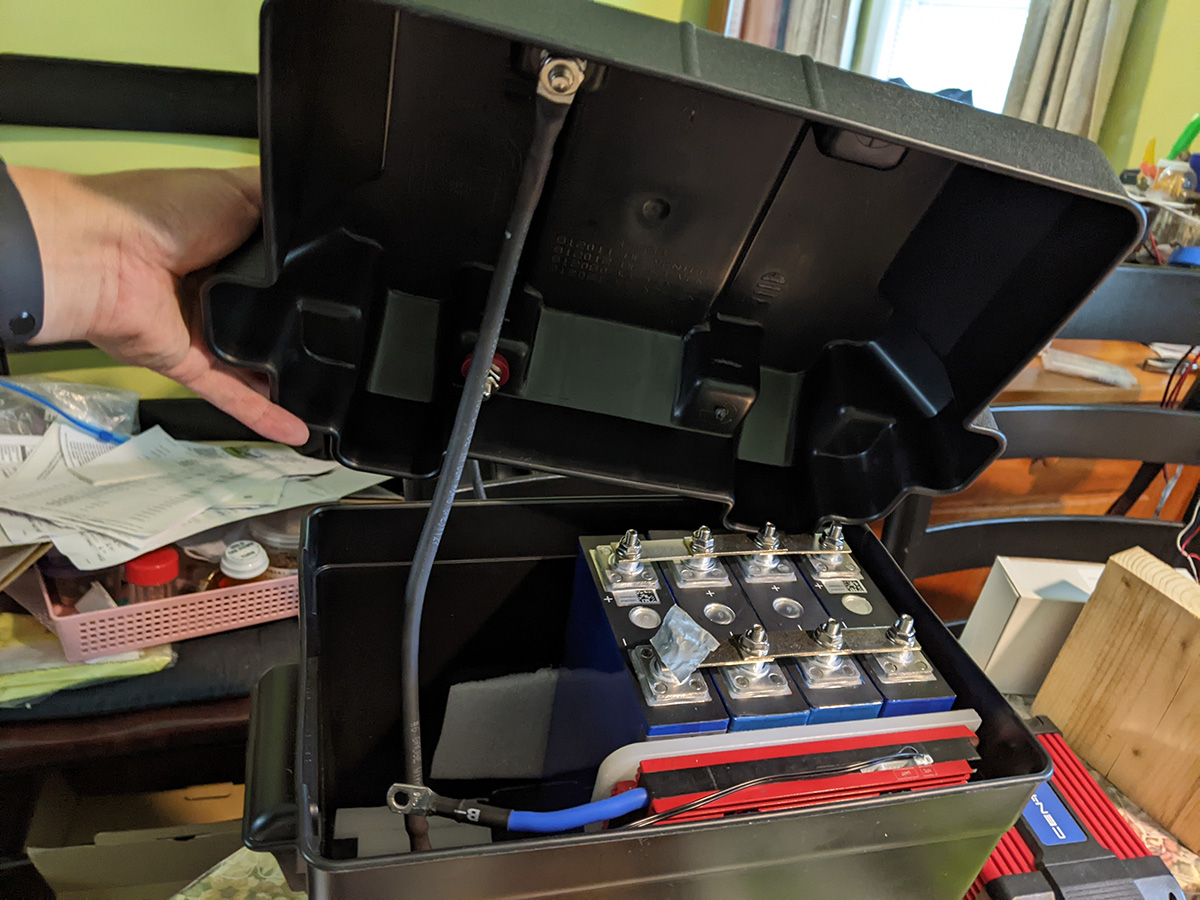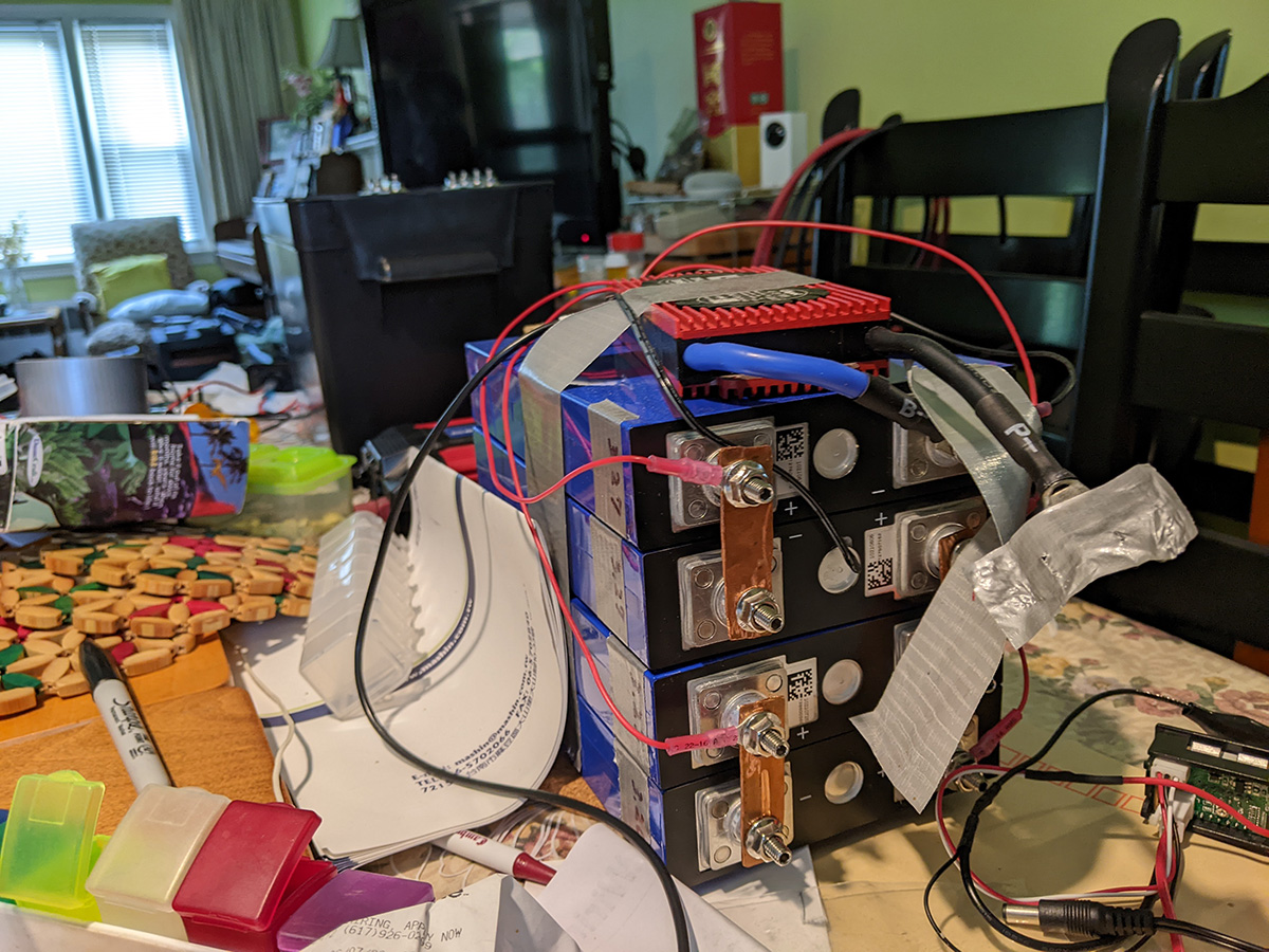 once the LiFePo4 cells have been charged to 3.60V, we can finally assemble the battery and put it to use. that also meant we needed to put back our backyard flexible solar panel. up until now, we've been charging the 12V 35Ah lead acid battery using a trickle charge, ever since some critter chewed up the solar panel wires. we ran into some problems however when i tried to read the outlet of the 100W solar panel with the multimeter and got zero. we tried the smaller 50W panel and that worked fine, so we opted to just use the 50W panel for the time being. while i pulled the red/black 12 gauge wire (copper clad aluminum) from the window to the solar panel hanging from the wall, my father was in the basement connecting all the wires: solar panel wires into our 100A in-line watt meter and power analyzer that goes into the MPPT solar charge controller which connects to the battery and also connects to the on-demand water pump. we tested it out, everything seems to be working. once the battery box is ready, all we need to do is swap out the battery and change the MPPT controller so it uses a lithium-based solar charging profile.