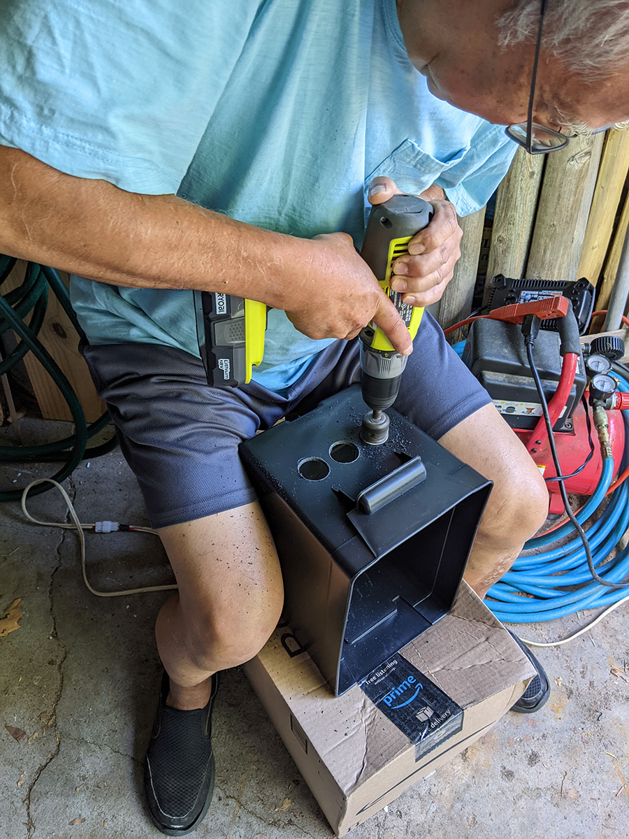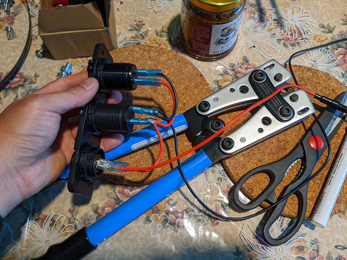 with the power supply cables made, we could assemble our battery box, but i wanted to top balance the LiFePo4 battery cells one last time before we attach the BMS. my father got the bench power supply and we slow trickle charged the cells to 3.6V. while that was happening, my father cut 3 holes in the plastic battery box so we could attach the 3 socket power panel: 2 quick charge 3.0 USB outlets, 1 12v cigarette lighter socket, and an on/off toggle switch. my father found a circular hole cutting drill bit that was the right size but it'd been heavily used in the past and all the teeth were gone. it still worked to cut the holes, but instead of actually cutting, it was more like drilling through the plastic through the force of friction. the power panel attached perfectly.