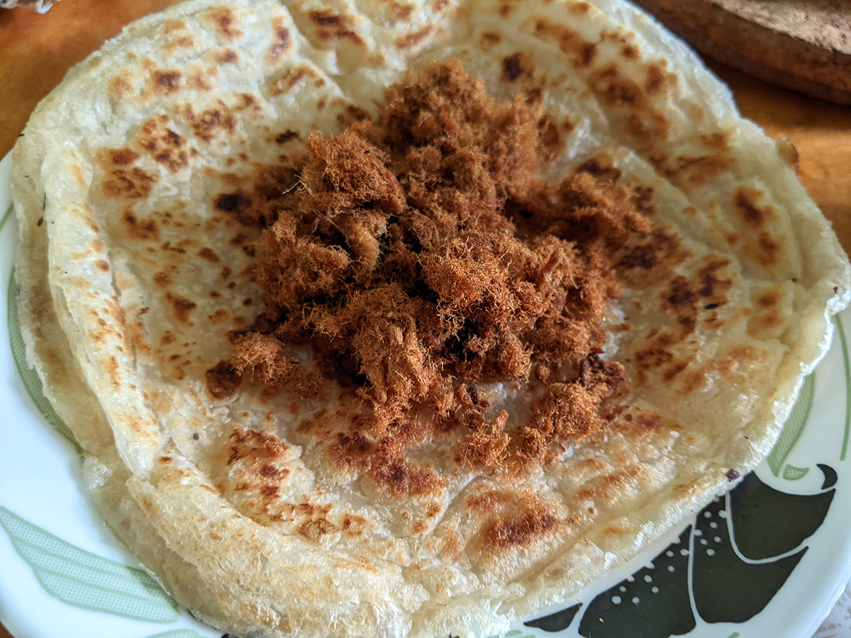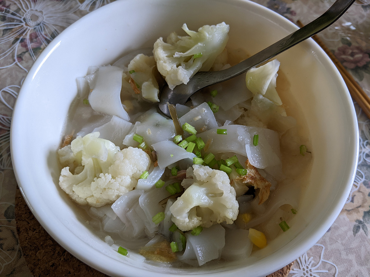 i had leftover thick noodles for lunch (the same thing i had yesterday) along with a pan-fried pancake stuffed with pork floss. originally we were going to make belgian waffles with bacon (grilled outside) but when my mother went to get the waffle mix, it was crawling with pantry beetles. she ended up doing a cleaning of the cupboard and tossed out several packages of flour mixes, all contaminated. suffice to say, we did not have waffles. my parents had finished eating and both had left the dining table while i still sat there enjoying my lunch in peace on a lazy sunday.