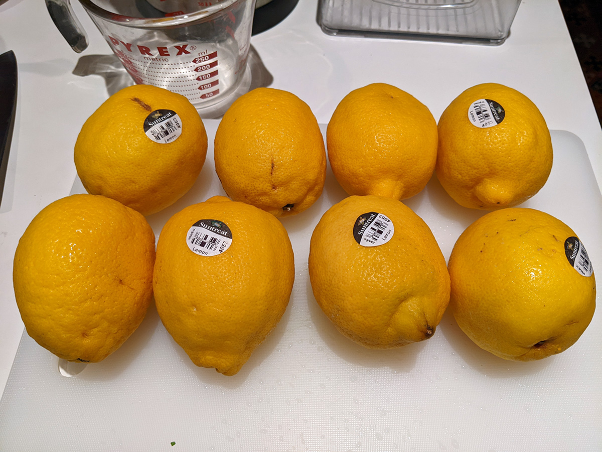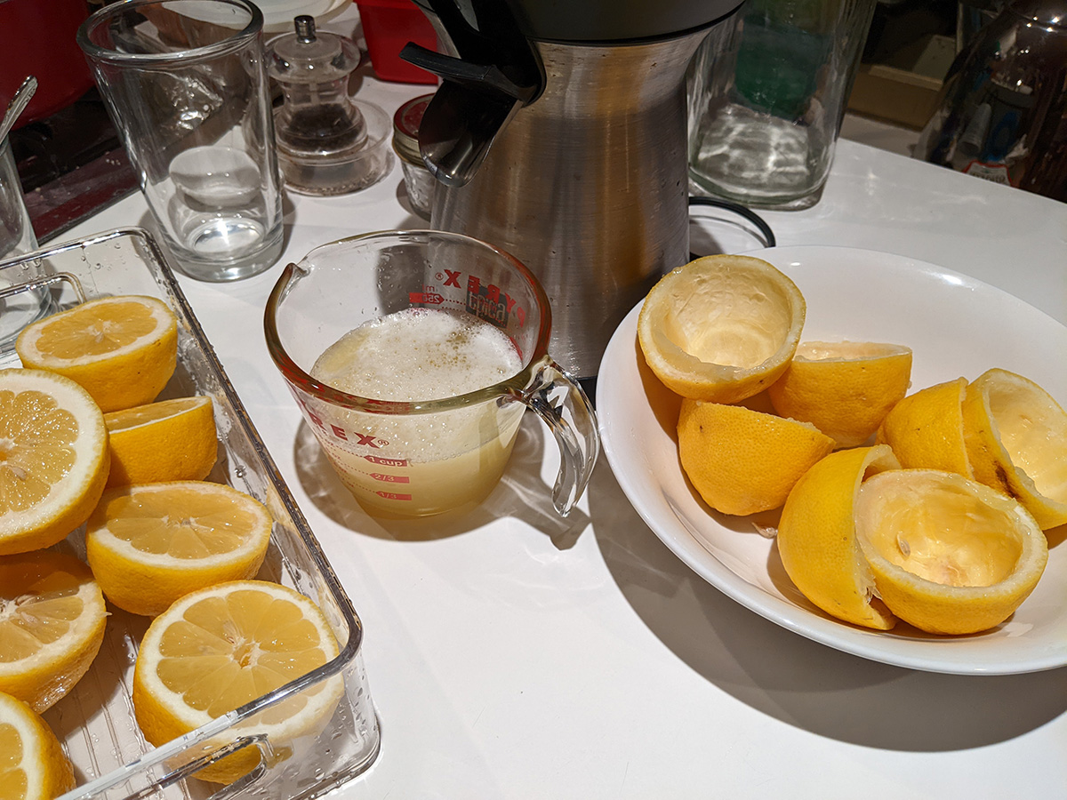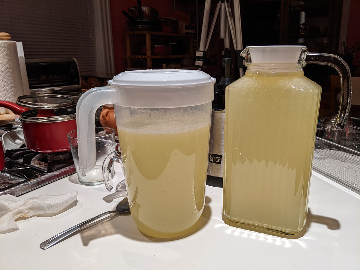 next up was homemade lemonade. i bought 8 lemons last friday from haymarket, and wanted to use them up before they go bad. i had a sugar syrup with 1-3/4 cups of sugar with 1 cup of water slow boiled on the stove. while that was happening, i halved the lemons and squeezed them with my electric juicer. 3-1/2 lemons yield 1 cup of juice. i ended up with 2-1/3 cups of lemon juice. the original recipe calls for 7 additional cups of water, which would make approximately 2 quart of lemonade (assuming 1-1/2 cups of juice), but because i had way more juice, i decided to add enough water to give me a gallon of lemonade, or two 2qt. containers. i filled my fancy glass pitcher, then filled the cheap plastic one i got from the dollar store. once again, the only normal reason to make lemonade is you have a lemon tree. all other reasons seem like a waste of time, and fresh lemonade tastes exactly the same as store bought lemonade.