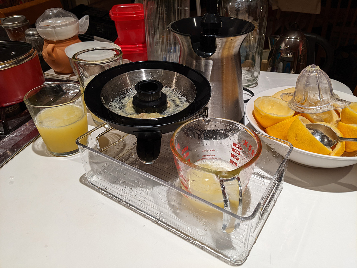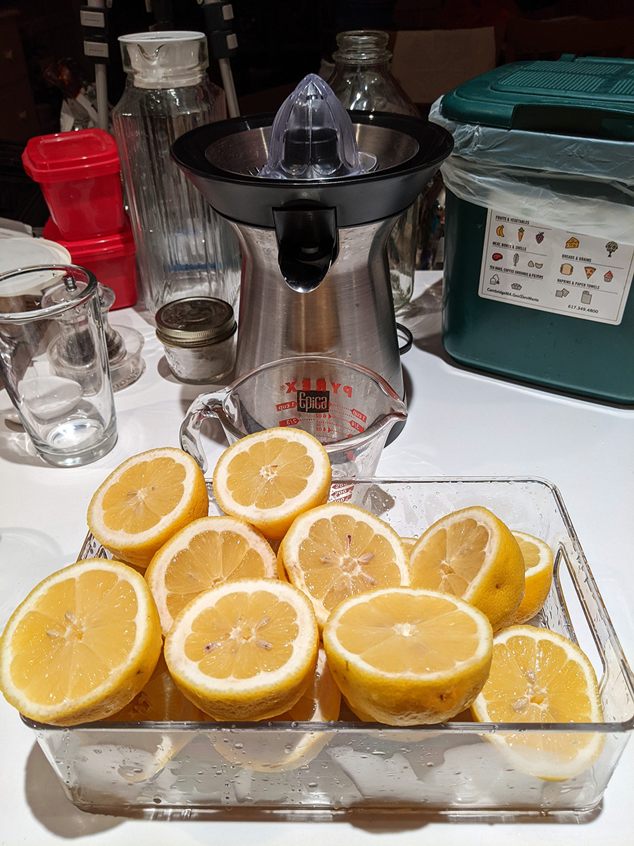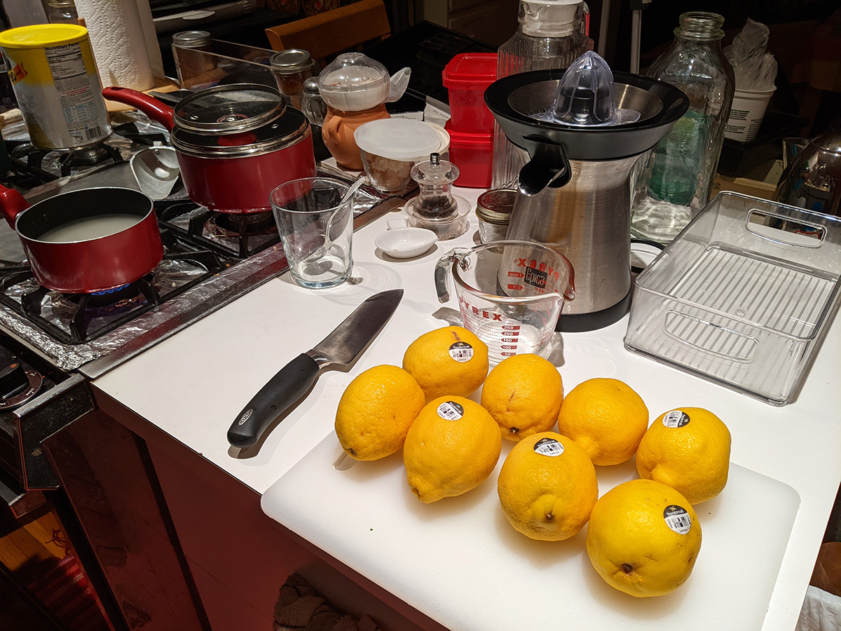 next up was homemade lemonade. i bought 8 lemons last friday from haymarket, and wanted to use them up before they go bad. i had a sugar syrup with 1-3/4 cups of sugar with 1 cup of water slow boiled on the stove. while that was happening, i halved the lemons and squeezed them with my electric juicer. 3-1/2 lemons yield 1 cup of juice. i ended up with 2-1/3 cups of lemon juice. the original recipe calls for 7 additional cups of water, which would make approximately 2 quart of lemonade (assuming 1-1/2 cups of juice), but because i had way more juice, i decided to add enough water to give me a gallon of lemonade, or two 2qt. containers. i filled my fancy glass pitcher, then filled the cheap plastic one i got from the dollar store. once again, the only normal reason to make lemonade is you have a lemon tree. all other reasons seem like a waste of time, and fresh lemonade tastes exactly the same as store bought lemonade.