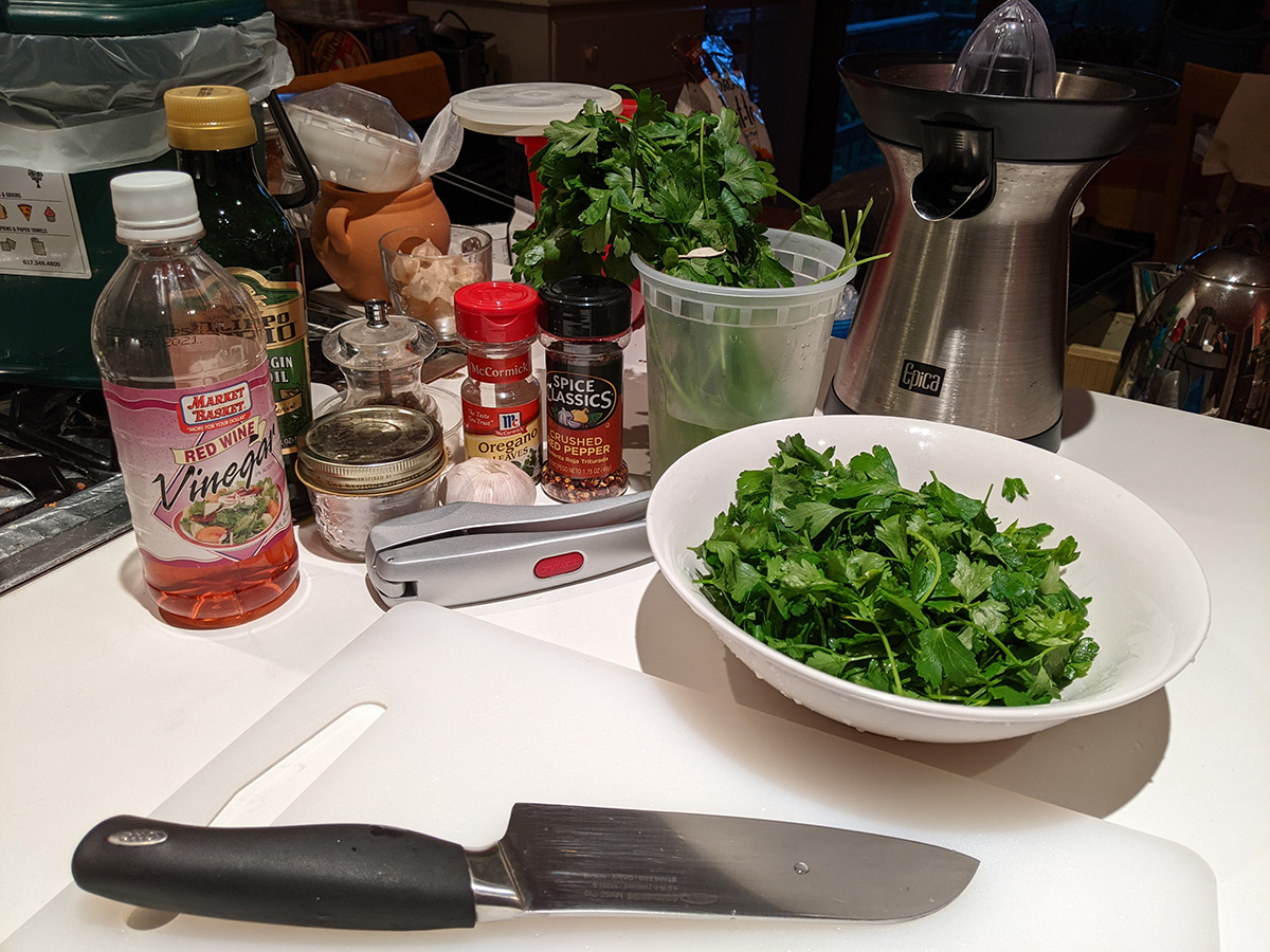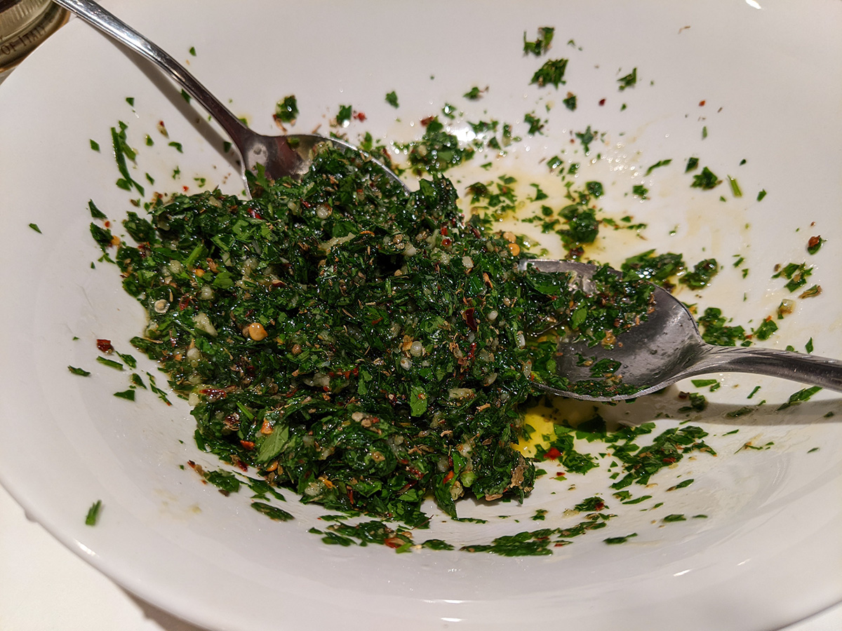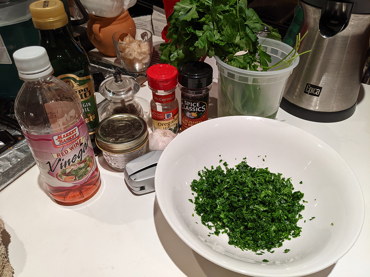 back at home, i started making the chimichurri. it's basically chopped up parlsey with garlic and oregano and chili flakes doused with a 3:1 ratio of olive oil to red wine vinegar, with some salt and pepper added to taste. i don't think i've ever had chimichurri before, but it's some argentinians and uruguayans swear by, and i'm willing to try it (besides, it's a fun word to say).