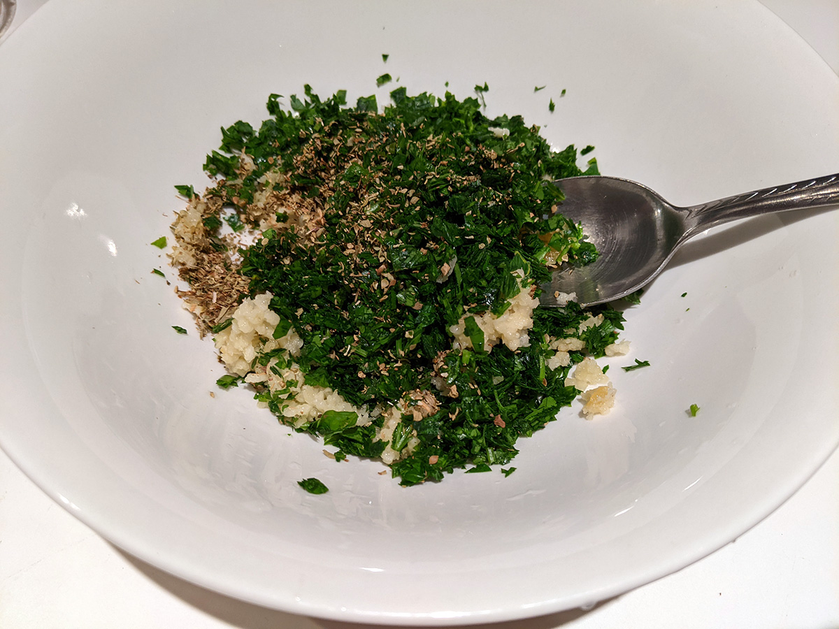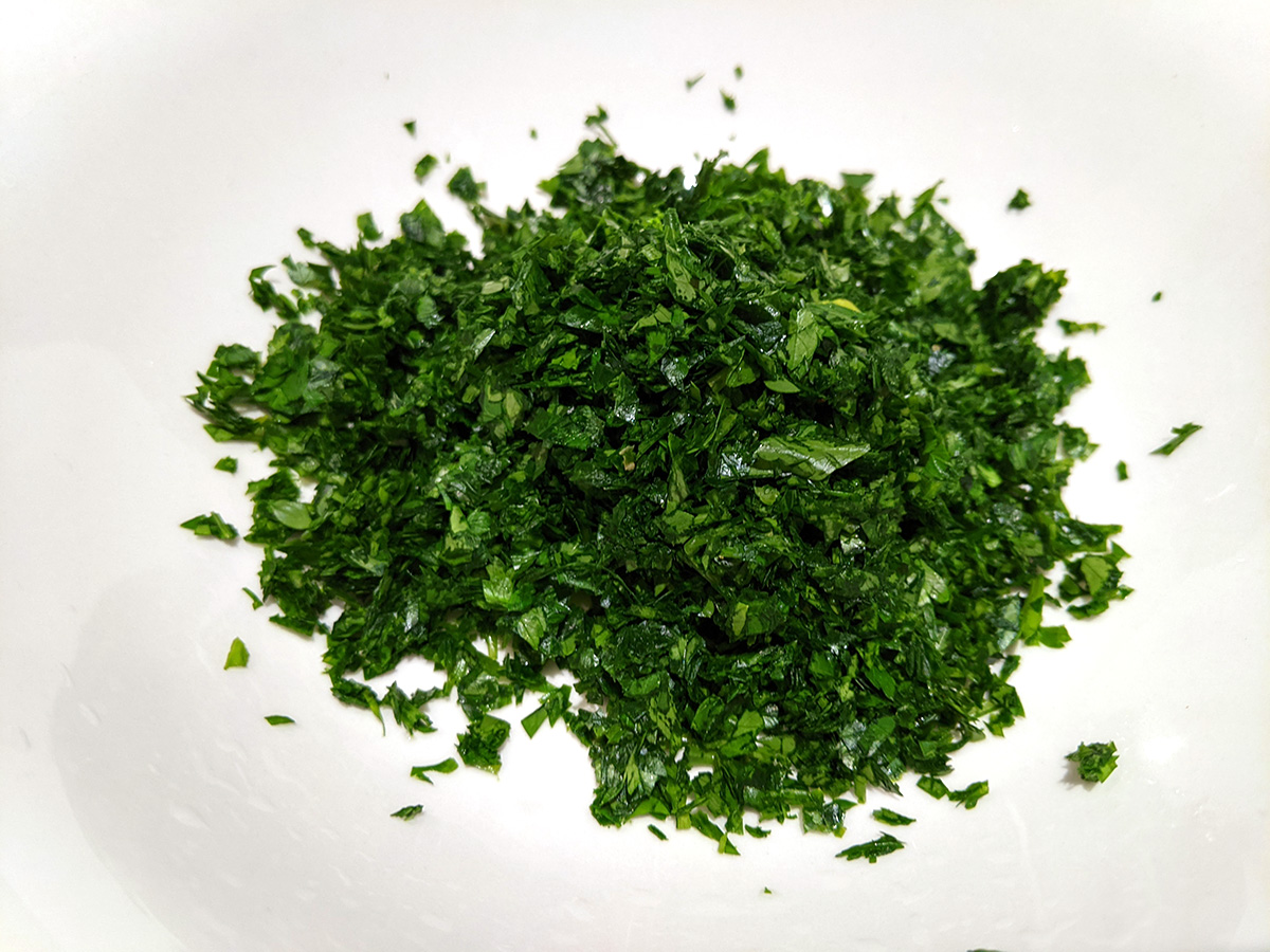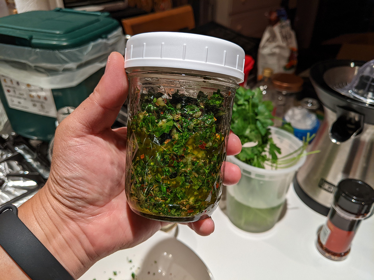 back at home, i started making the chimichurri. it's basically chopped up parlsey with garlic and oregano and chili flakes doused with a 3:1 ratio of olive oil to red wine vinegar, with some salt and pepper added to taste. i don't think i've ever had chimichurri before, but it's some argentinians and uruguayans swear by, and i'm willing to try it (besides, it's a fun word to say).