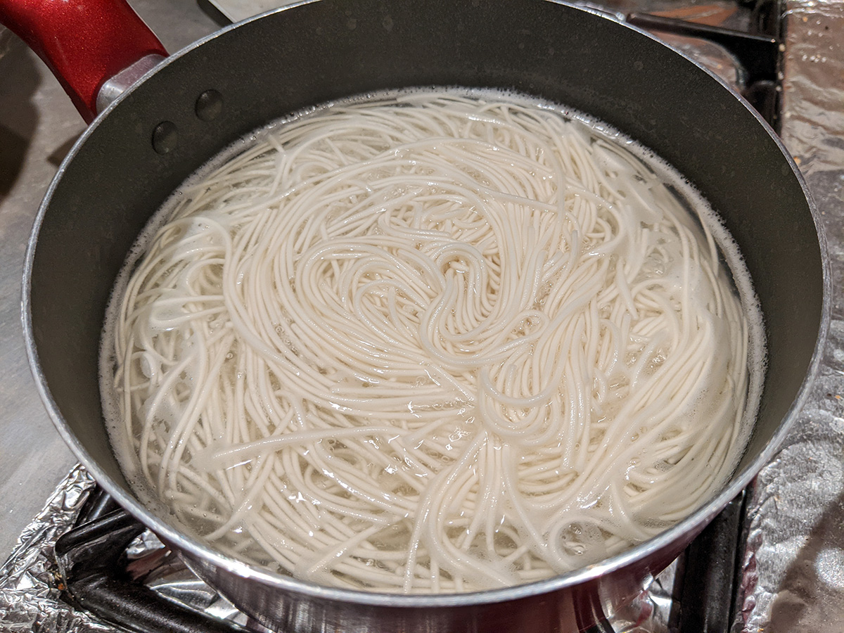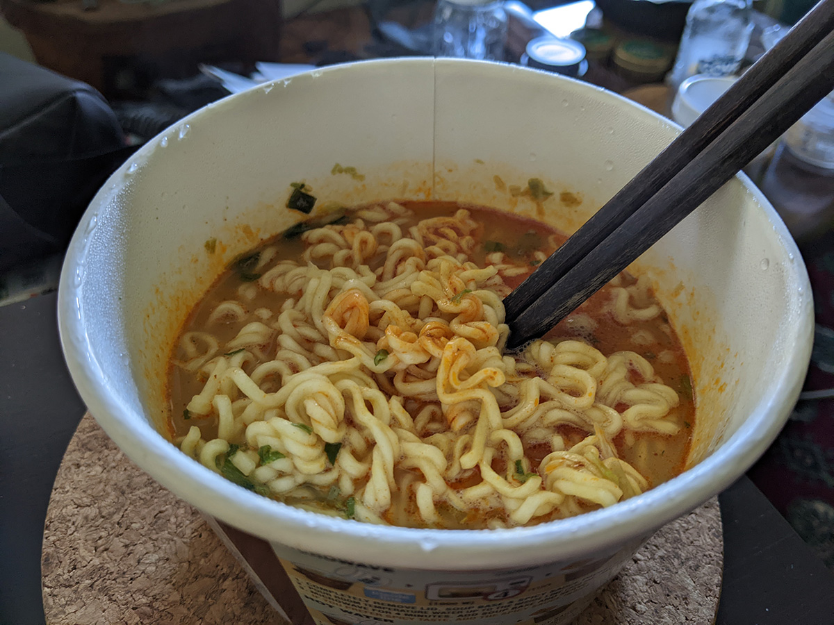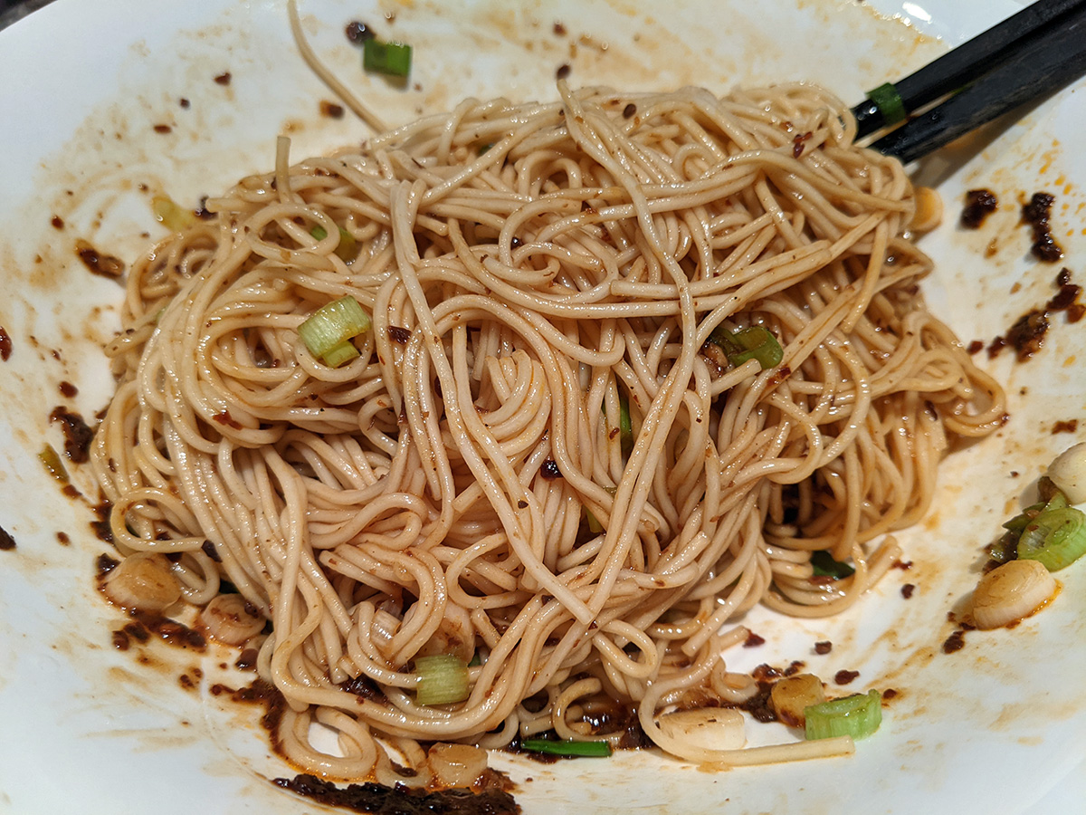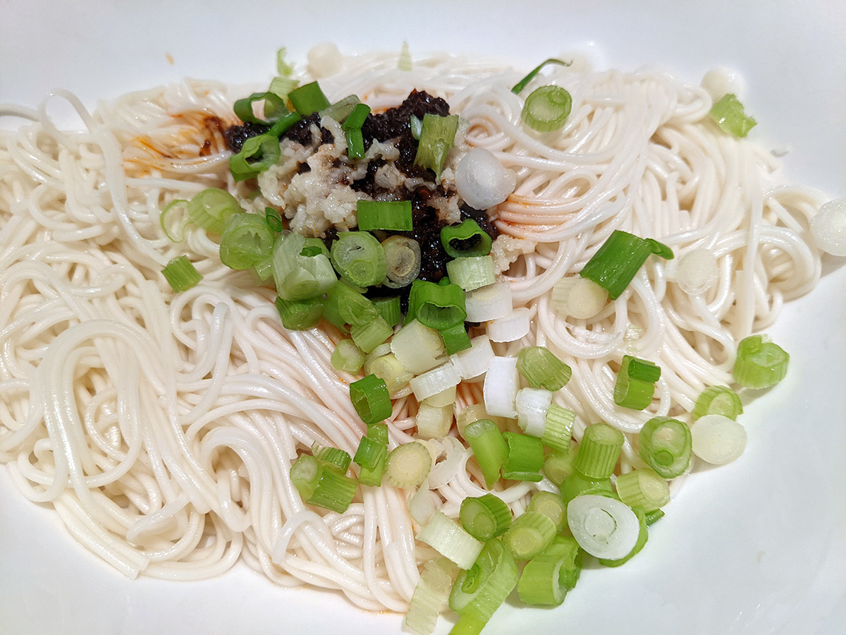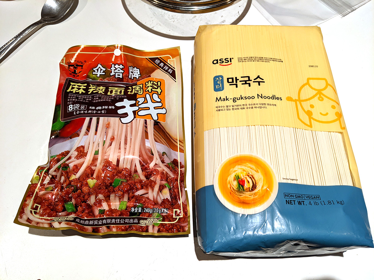 finally i made dinner - around 9:30pm. i had a package of korean mak-guksoo (thin) noodles and some mala noodle sauce packets. i portioned out about 150g of noodles, cooked it, then mixed the noodles with the sauce packet along with chopped scallions and some minced garlic. my noodles ended up getting stuck together a little bit, maybe these thin noodles are not designed for "dry" eating but prefer a soup-base. the end result was still delicious though, and quick, and easy meal for lazy times.