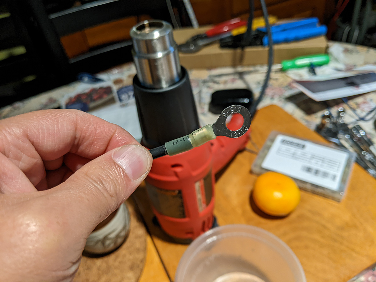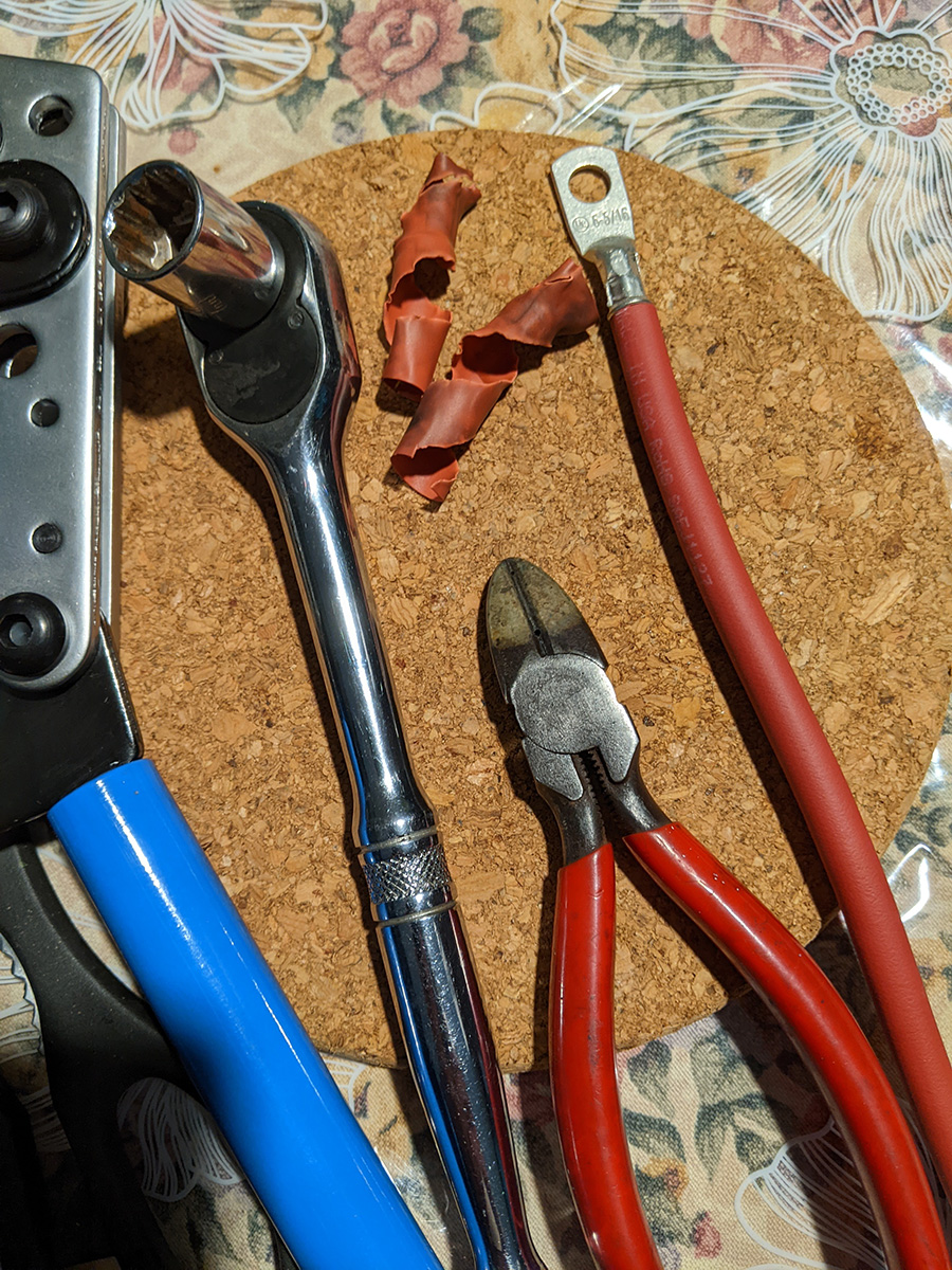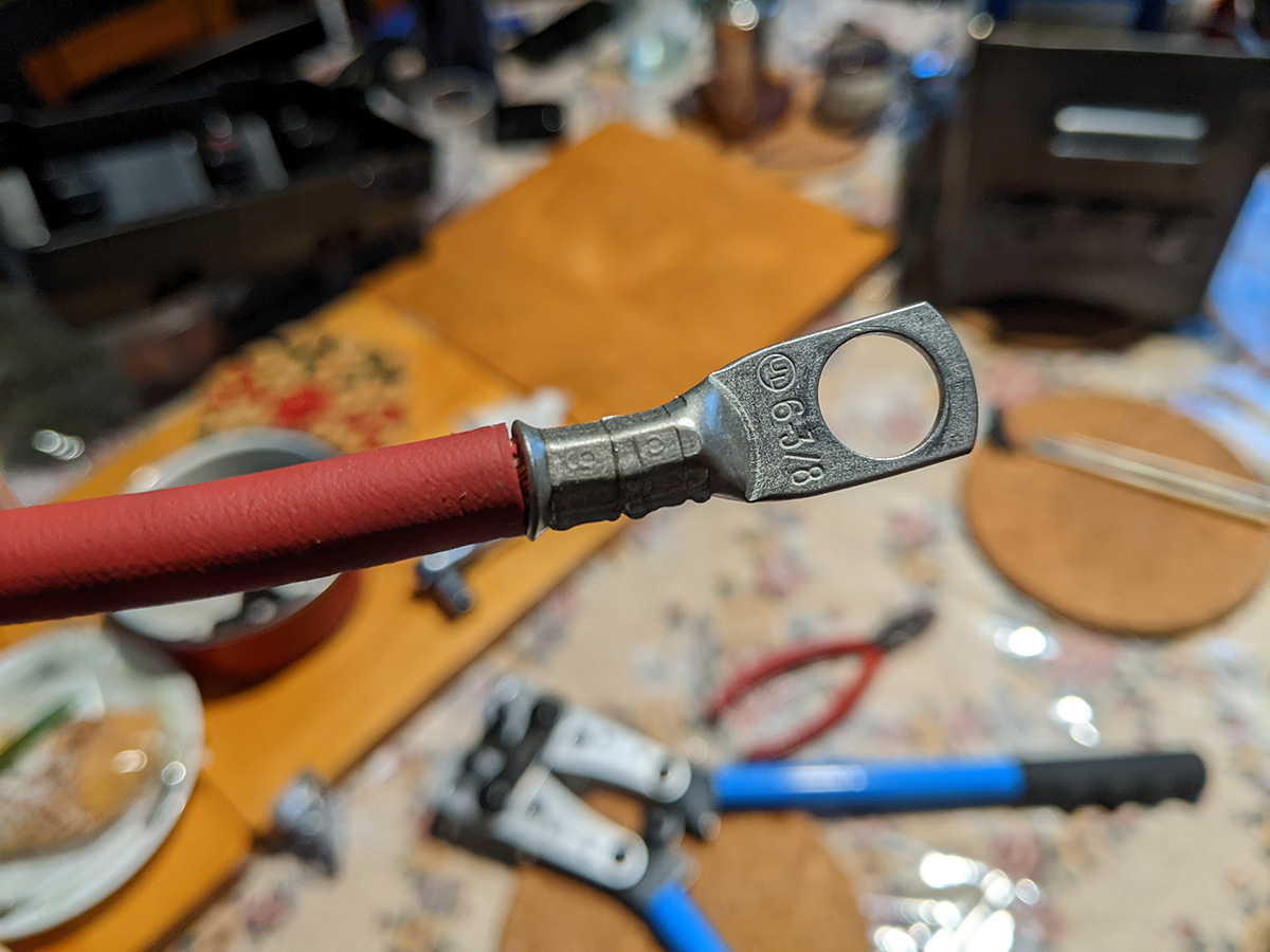 so we re-attached the old crimped lug terminal back onto the 6 AWG copper wire. we then used the iwiss crimper to recrimp it. we crimped twice, and now the lug was on there tight. the iwiss crimper also stamped each crimp with the size number (in our case 6) which is a nice touch. we went ahead and removed all our 6 AWG copper cables from the battery boxes and stripped off the heat shrink tubing covering the lug terminals so we could recrimp all of them. one person positioned the lug terminal, the other person clamped down on the crimper. once all the lugs were properly recrimped, we then reattached the heat shrink tubing. instead of a blowdryer or a lighter, we shrank the shrink tubing correctly this time - with a heat gun. once the 6 AWG cables were properly finished, we reattached them back into the battery boxes.
