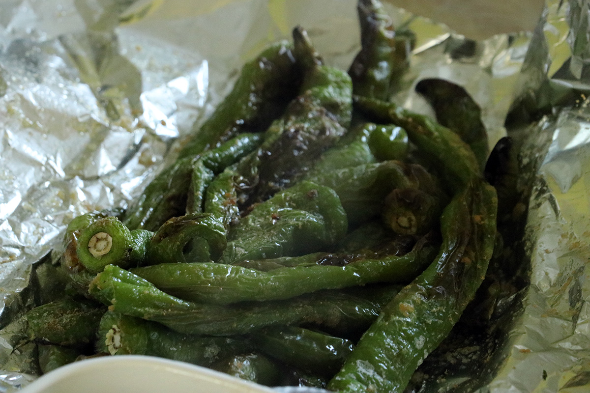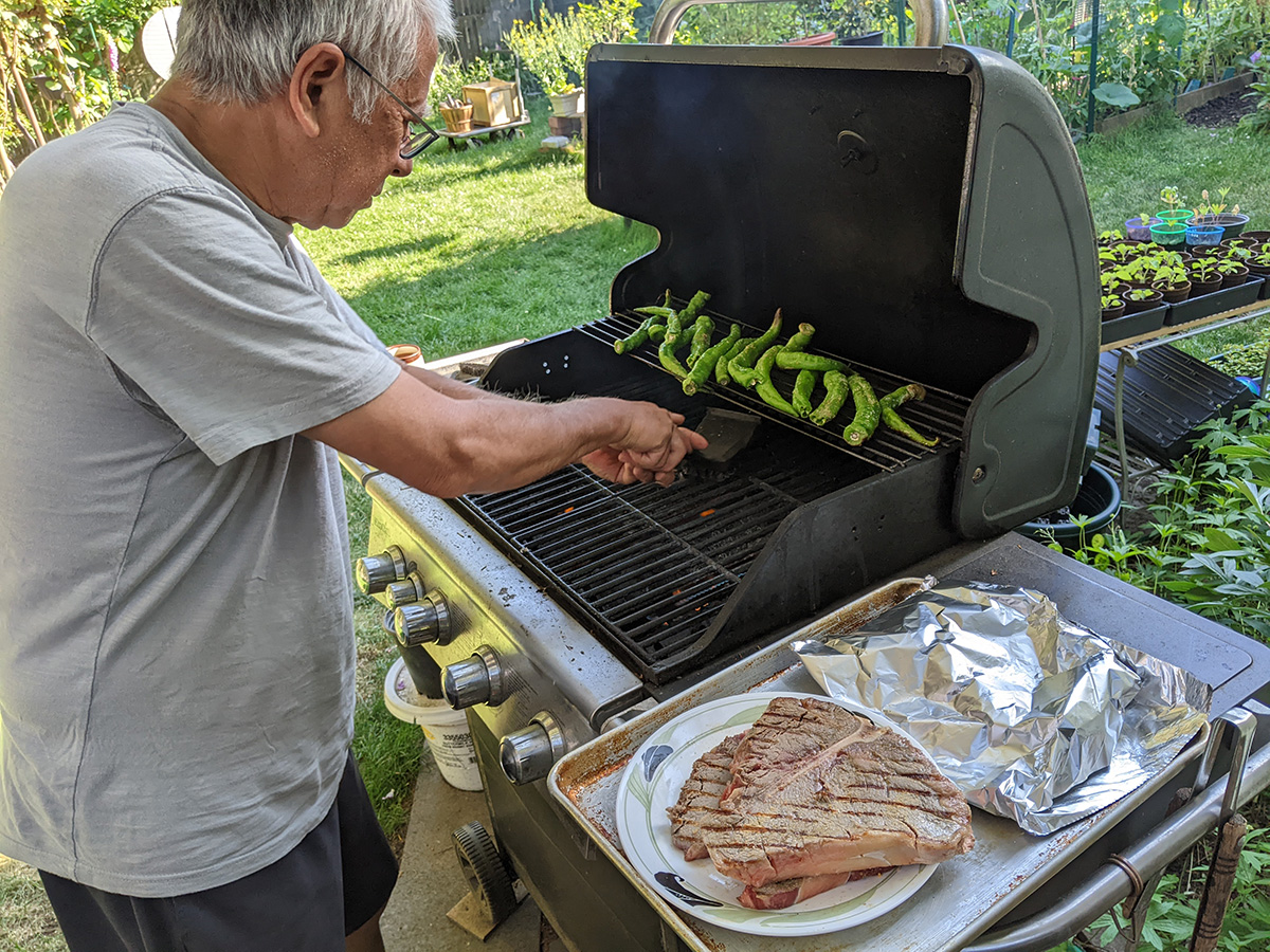 my father grilled the two pieces of porterhouse steaks i'd bought on friday. originally he was going to do it on the cast-iron griddle (since it was already in the barbecue from when we made belgian waffles and bacon last weekend), but i said it'd be better to cook on the grill itself, for some flame-broiled goodness. so he removed the hot griddle with a pair of pliers, setting it off to the side, where it looked deceptively cool but was easily 450°F. he was asking how long to grill the steaks, i was surprised to discovered (courtesy of the internet) that it only required a few minutes per side. we also grilled some long-horn peppers.