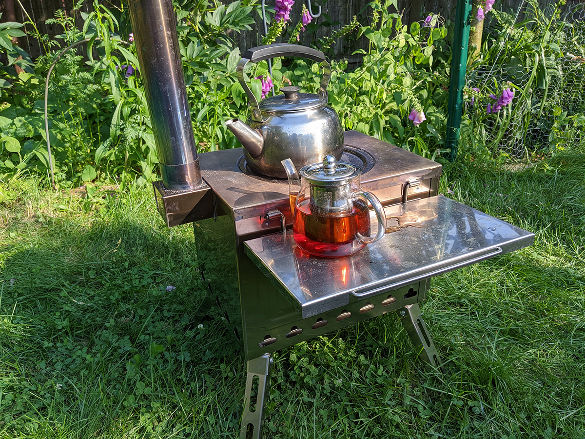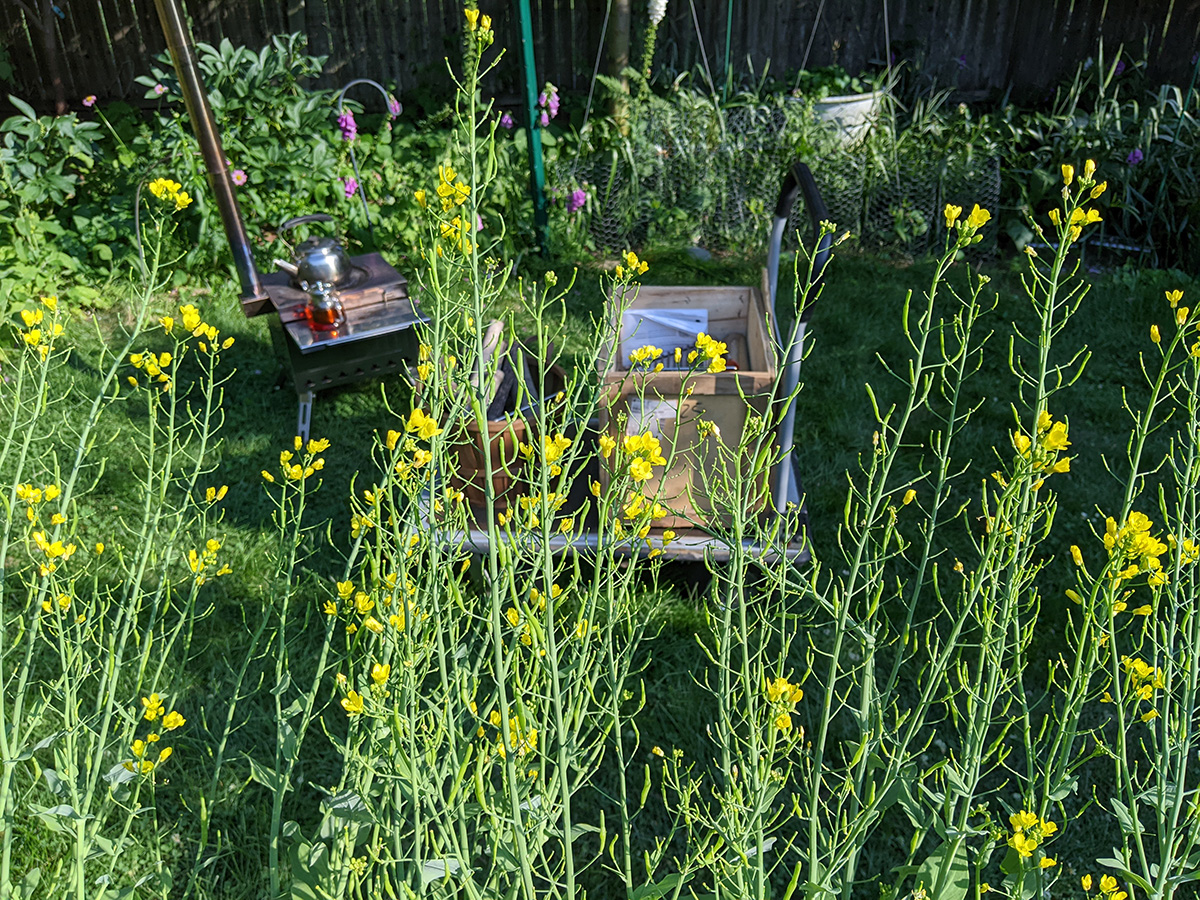 my father had set up his stainless steel tent stove earlier this morning. it smelled nice, reminded me of rural china, where i always seem to be smelling someone burning wood of some sort. he placed it on the ground for a chance, but i thought it was too close to the neighbor's house, where the smoke might blow in their direction. speaking of which, when i peeked through the fence cracks, i saw the neighbors had completing barricaded their garden this year with chicken wire fencing.