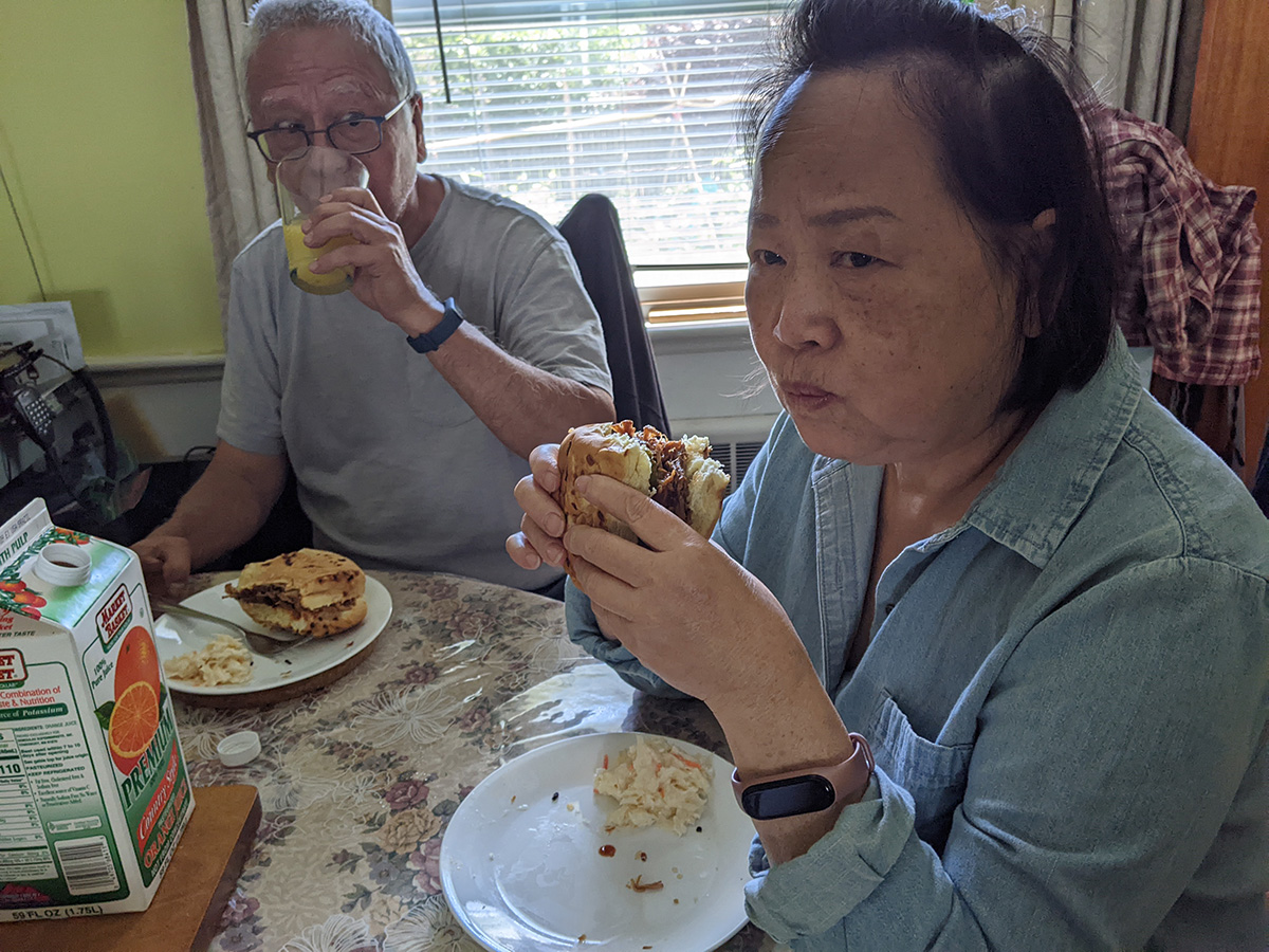 my mother called me back inside around 12:30pm to prepare the pulled pork sandwiches for lunch. i made one for each of us, along with a bit of leftover coleslaw. my mother seemed to like it, or at the very least didn't say anything bad about the sandwich. i could barely eat mine, having had half a dozen last week, so much so that i don't want to see pulled pork for a very long time.