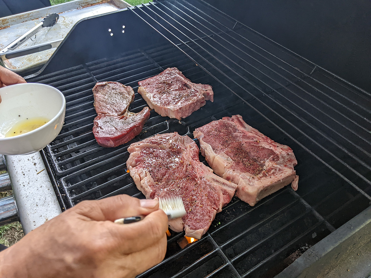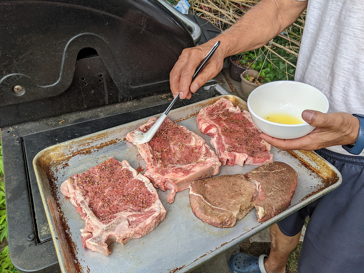 for dinner we grilled some porterhouse steaks. this was also the time when we were finally going to get some rain, as the sky darkened. my mother didn't believe me when i said it'd rain, but told us to go outside and grill the steaks just in case. it doesn't take long to prepare steaks on the barbecue - a few minutes on each side - and we managed to grill them all before the storm. we ended up doing 5 minutes per side. we took out the steaks 30 minutes before grilling, and my mother seasoned them with montreal steak seasoning that i bought from home. before putting on the grill, my father brushed the steaks with some melted butter on both sides. there was of course fire flare ups - both from the accumulation of grease on the burners and rendered beef fat. so we ended up having to move the steaks around to avoid charring, but probably contributed to a lackluster crust.