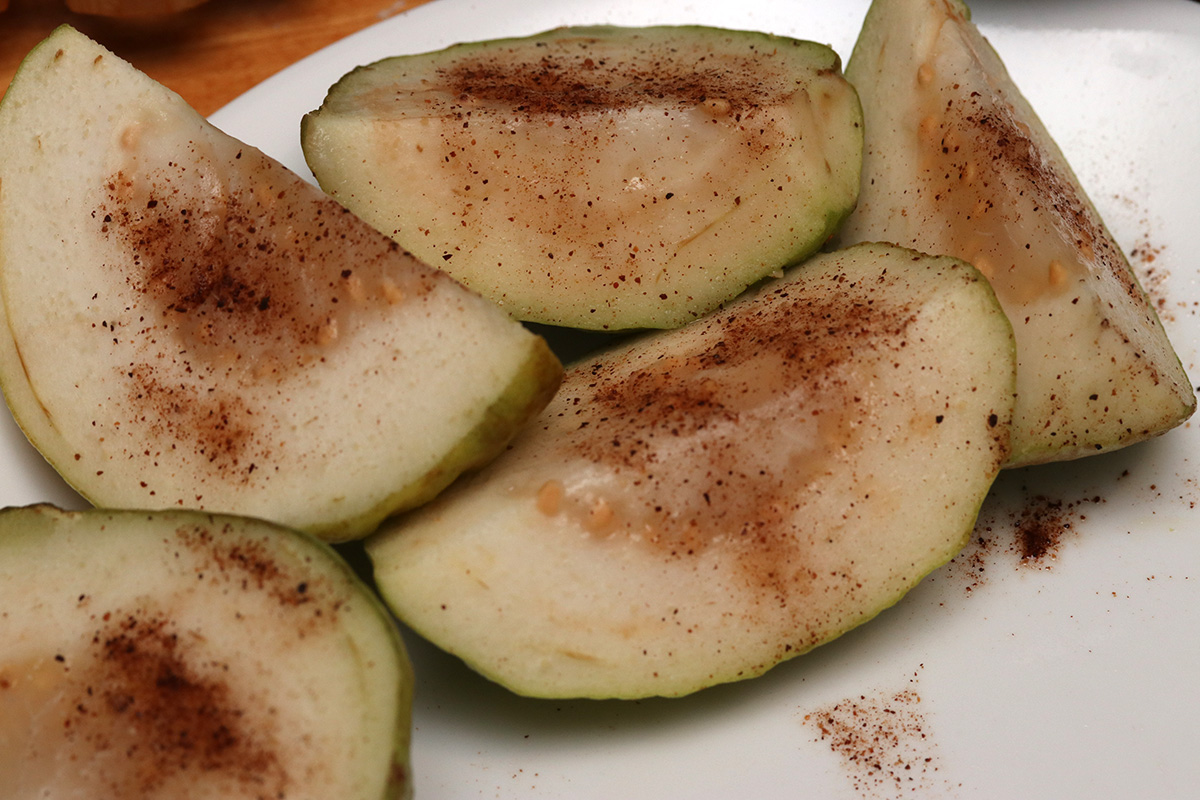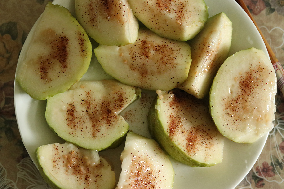 for lunch my mother made thin noodles with slow-cooked pork. she also cut up the 2 guavas i bought. she said they tasted terrible compared to fresh taiwanese guava. they tasted bland and a bit mushy in the center.