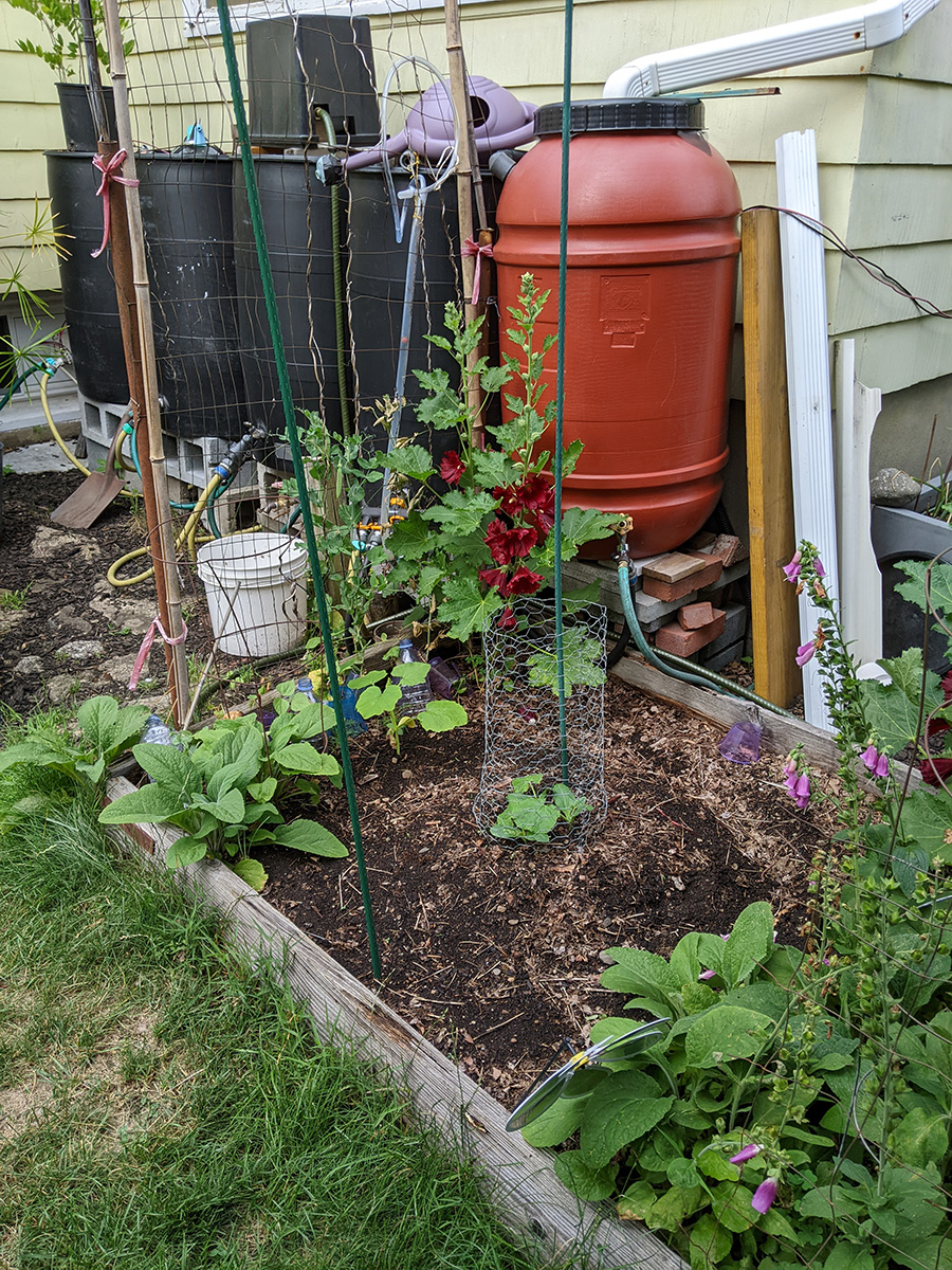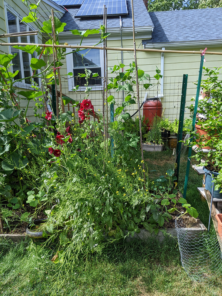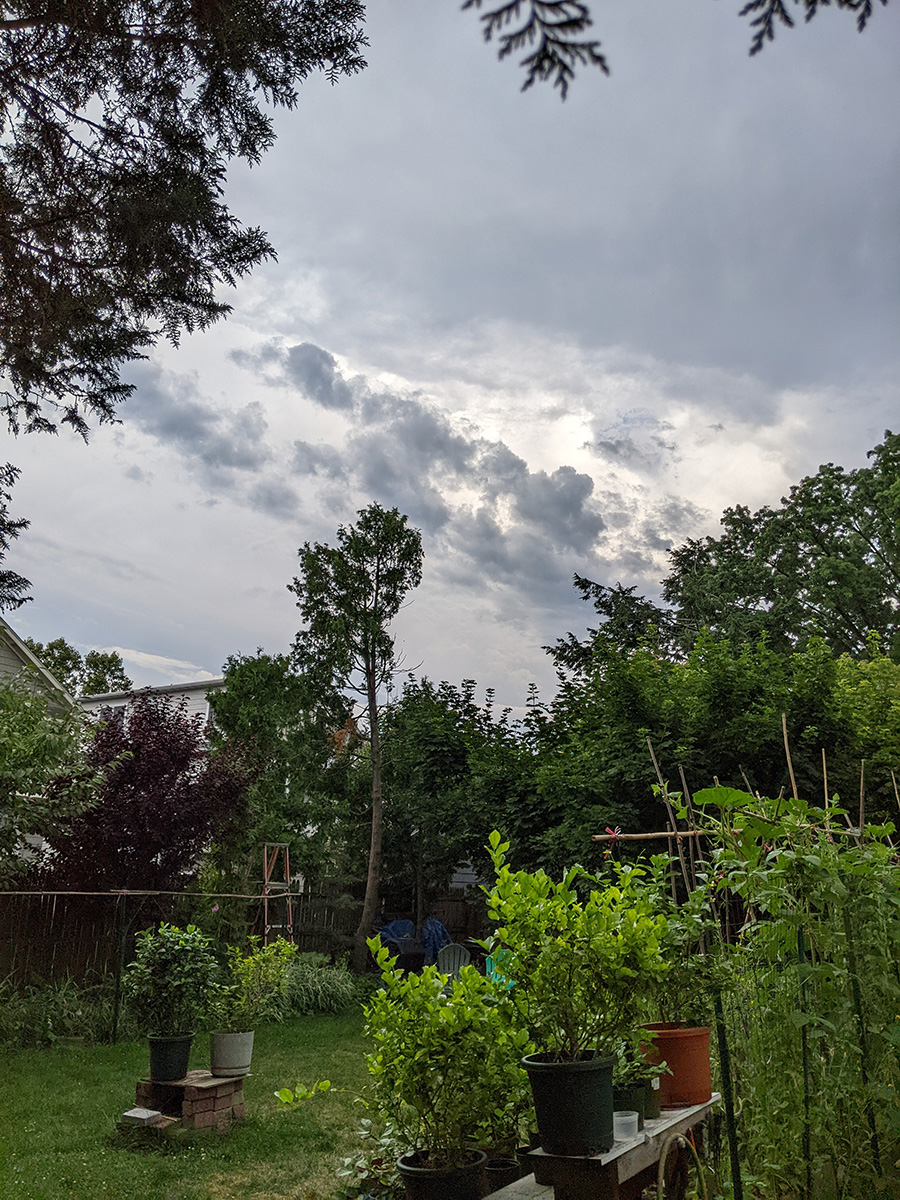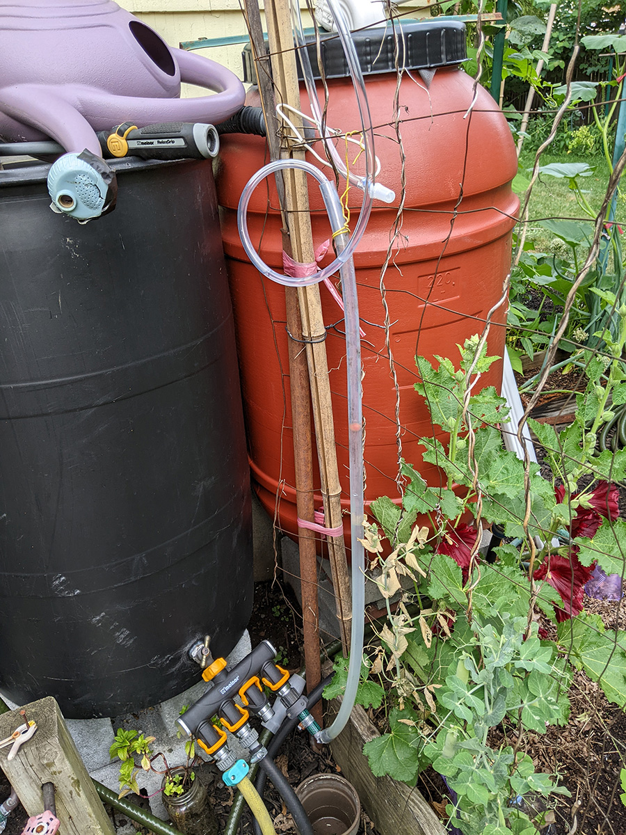 while we were eating it finally started to rain. it seemed like a few sprinkles at best, but it developed into a medium-size rain, one that was on course to fill up our rain barrels, which were down to 2/3 capacity. if we can get one big rainstorm every week, we'll never have to worry about the barrels going empty again.