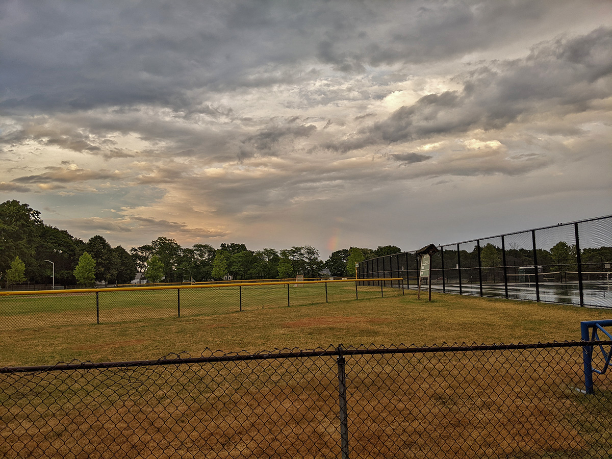 after i finished eating, i joined my mother for a walk. we went to the new glacken field, now completely opened to the public. the park itself has a terrible design, a jumble of cement pillars that's just begging for a lawsuit when a child injures himself hopping from one to the other, and an artificial hill that follows a windy spiral route to summit. instead of bleachers (to watch the baseball game on the two new diamonds that were converted from a previous soccer field), they build this wooden structure that looked like a ship, but with half the seating facing the field, and half facing the street.