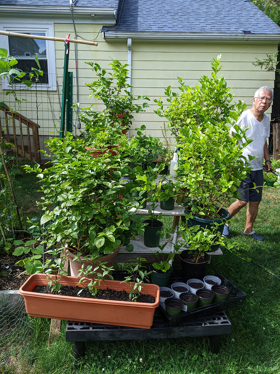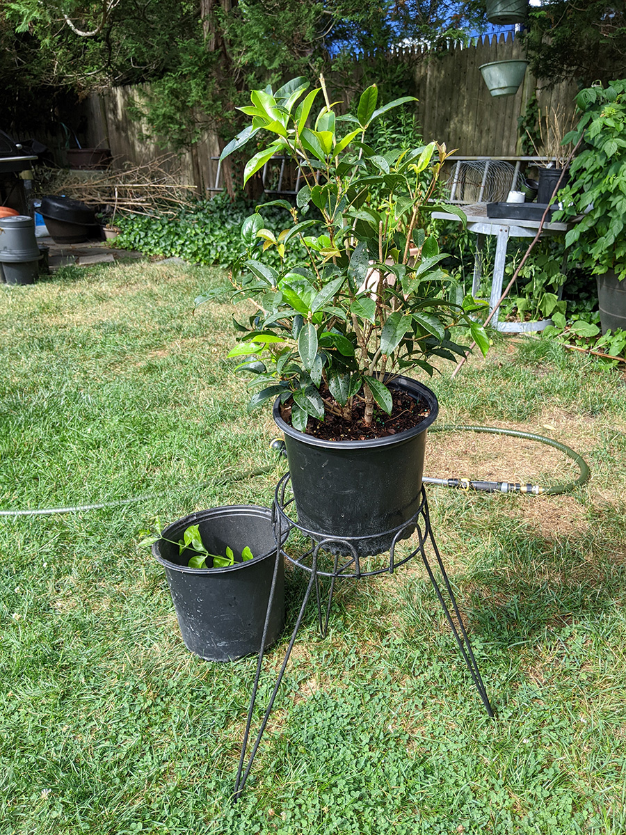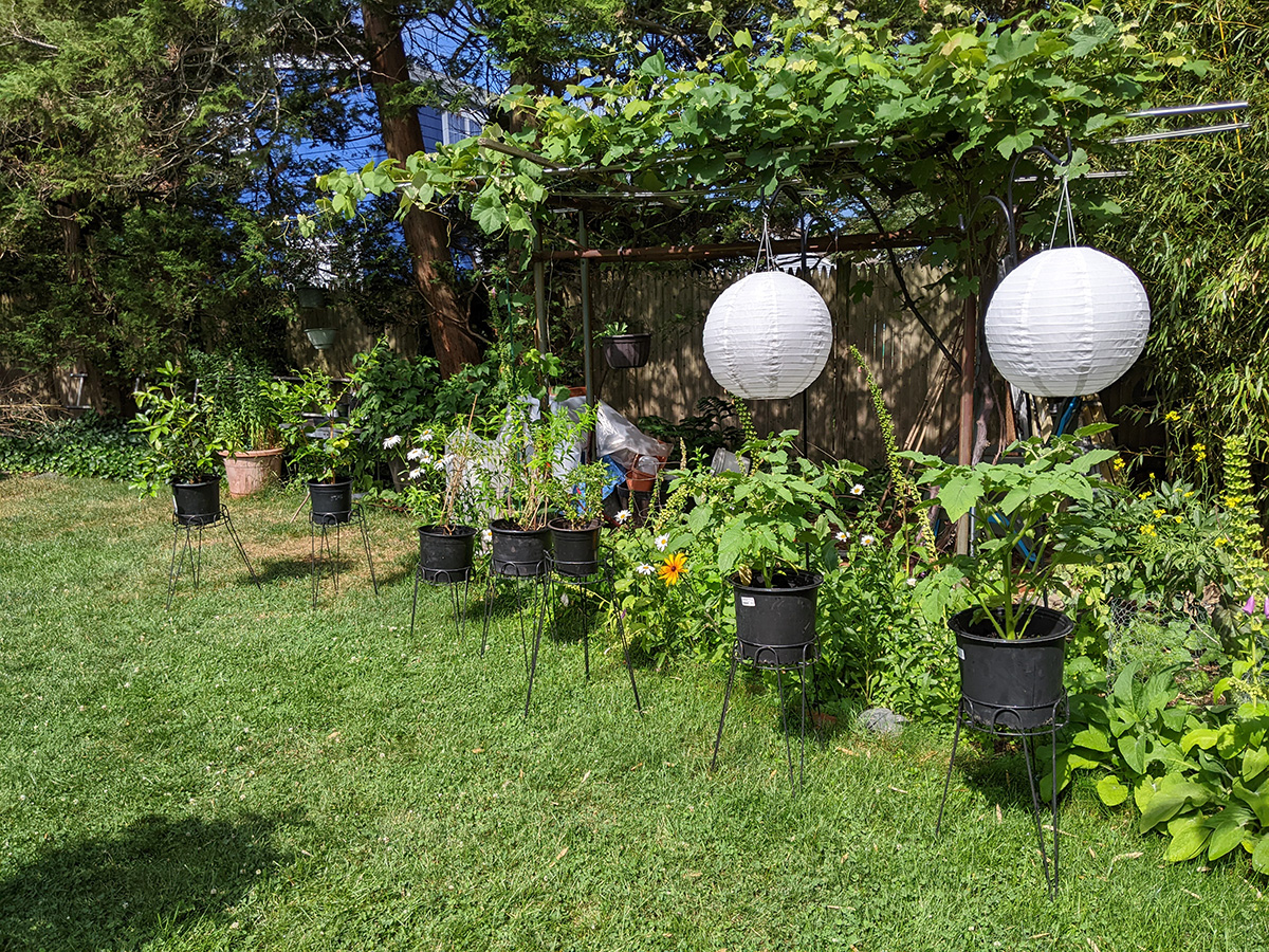 i went to inspect the backyard as soon as i arrived. my parents have a neighbor across the street that's moving out and they've been tossing out a bunch of stuff. my father collected about 8 wire plant stands. these are great because we can put them with our medium-sized potted plants and have them scattered about the backyard without being worried that the feet will kill the grass. a plant that's isolated from other plants get the maximum amount of sunlight, have excellent air circulation, don't have to worry about contracting some plant disease or pest (like mealybugs), and are easier to inspect. the only downside i can think of is if there's a strong wind, it might blow over the wire plant stand.
