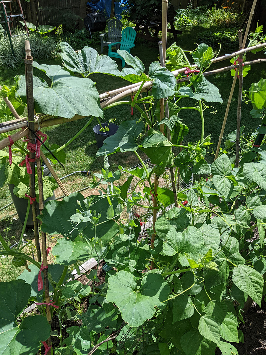 last season we seemed to have a lot of male squash flowers and hardly any female flowers. this year seems to be the opposite: the female flowers came out first, but all of them withered on the vine when there wasn't any male flowers to pollinate them. but now that both types of flowers are blooming, a few of the female flowers seemed to have pollinated successfully, based on the swollen fruits. all the action seems to be in RB1 for the time being, while the squashes we've planted elsewhere is like 2-3 weeks behind. it could be a good year for squash, as we ended up planting more than planned to compensate for all the long bean plants that were eaten by rabbits.