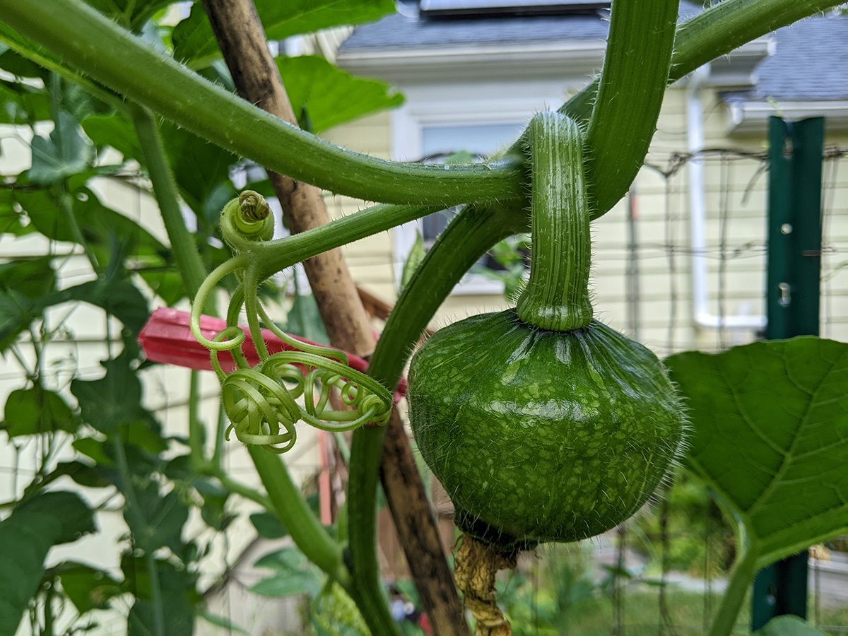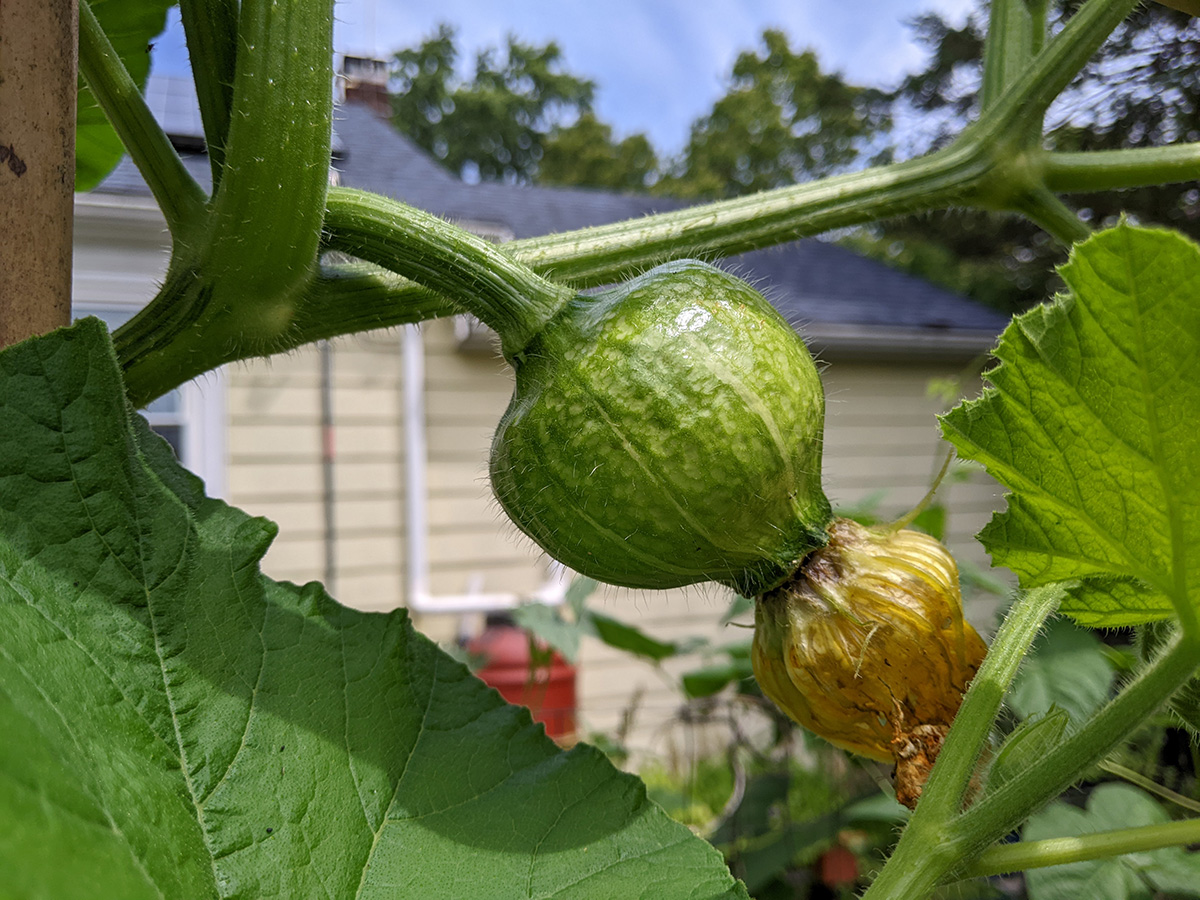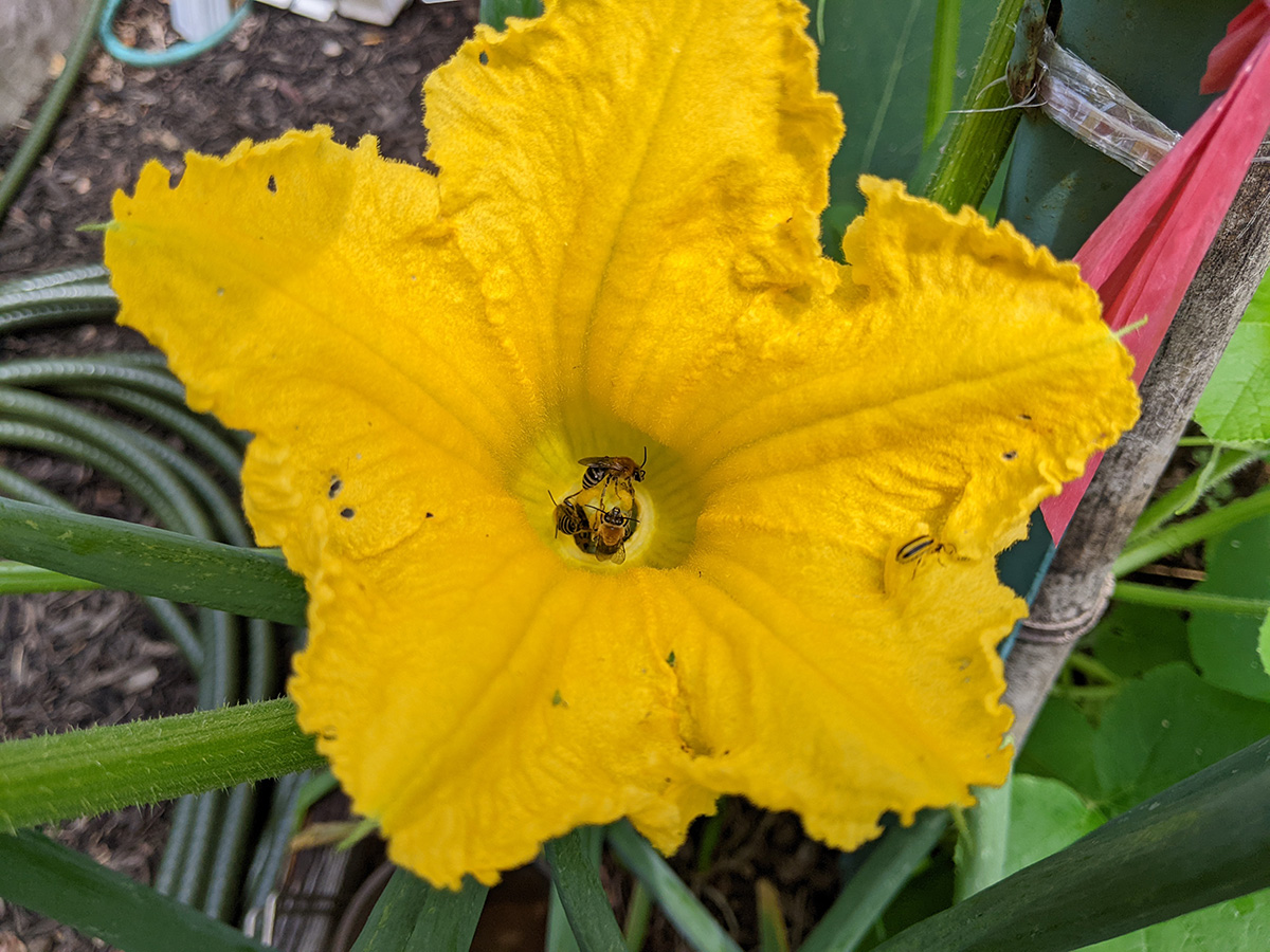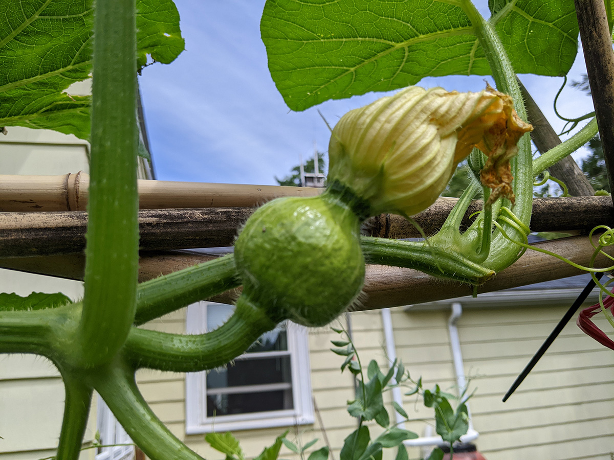 i went out into the backyard to inspect the garden, but there wasn't too much to do since we mostly did them all yesterday. my father says so far there are 6 squashes of various sizes growing in the raised beds. the weather was kind of grey in the morning so i managed to see a few squash blossoms before they close up for the day.