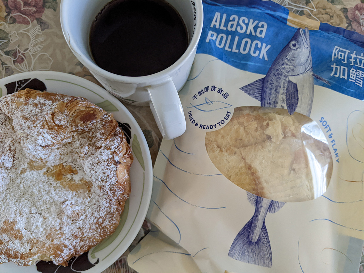 back at the house, i had a danish and some dried alasak pollock, washed down with some leftover store-bought suanmeitang drink.