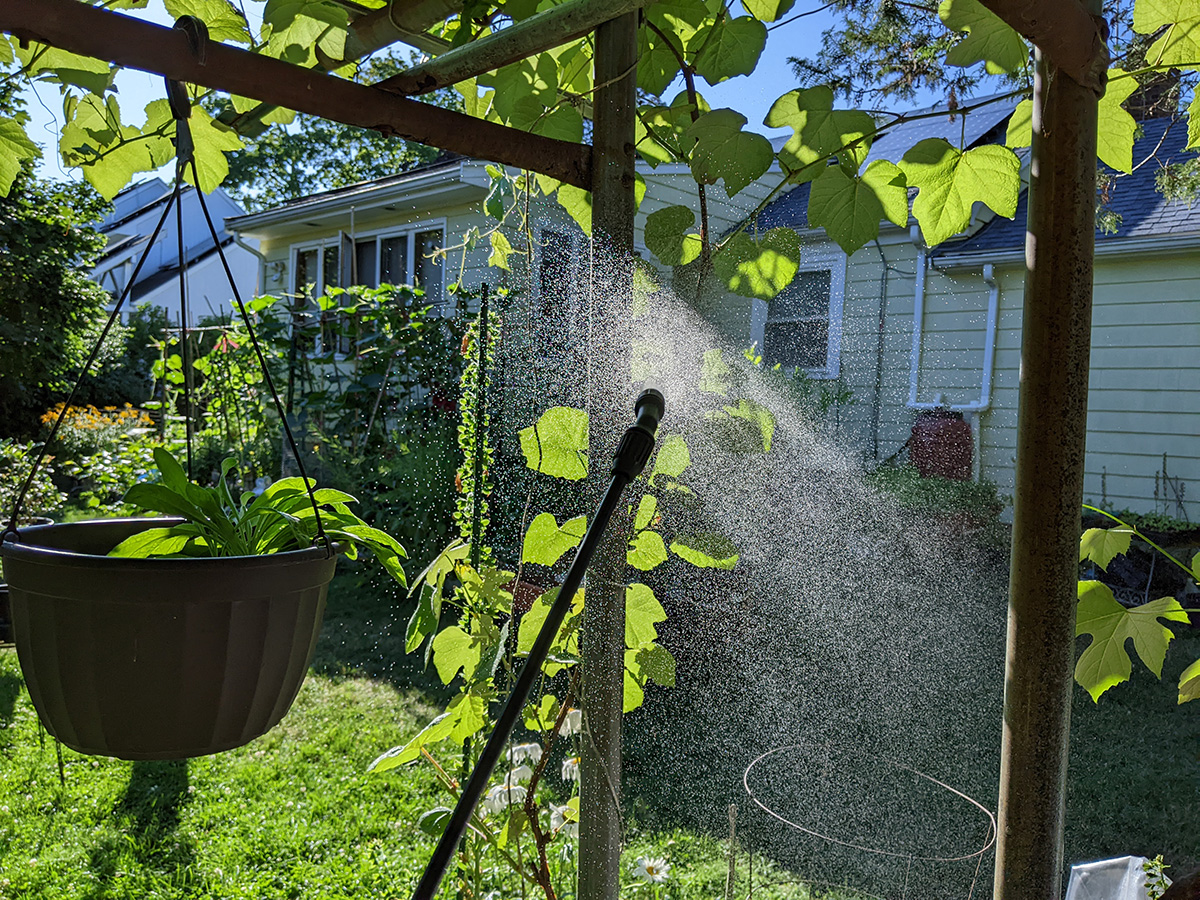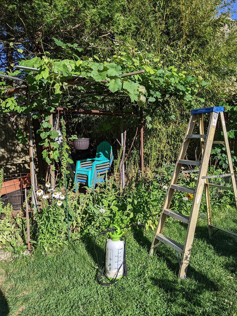 finally it came time for the 5th and final fungicide treatment on the grapevines. my father made a terrible mistake a few weeks ago when he decided to prune the grapes without asking me first, thereby cutting off all the new vines that would produce the grape fruits. this time last year we already had tons of green grapes on the vine; this year only maybe 4-5 clusters. the one good thing that might come out of this is it could break the disease cycle, since black rot needs to incubate in the grape fruits (grape mummies) so it can reinfect next season. anyway, i started spraying, everything was going fine, but i suddenly felt this cool breeze on my bare legs. i thought nothing of it at first, i heard this hissing sound, and when i went to pump the sprayer, i saw a fine spray of fungicide water leaking out from the bottom of the spray container. the pressure quickly pushed out the 1/2 gallon of solution. the cool breeze was fungicide spraying onto my legs.