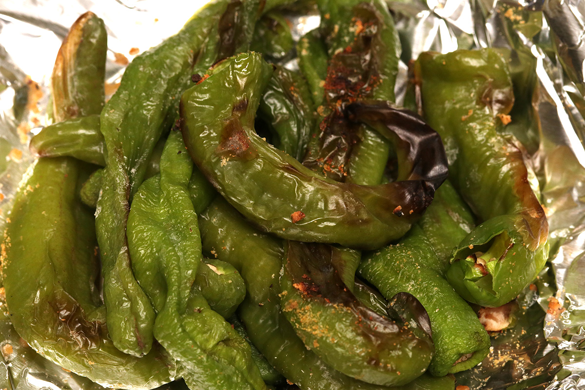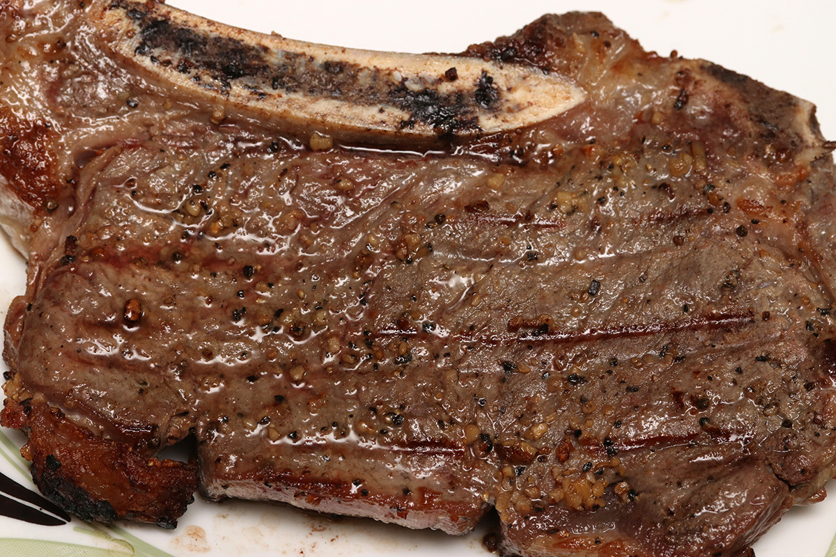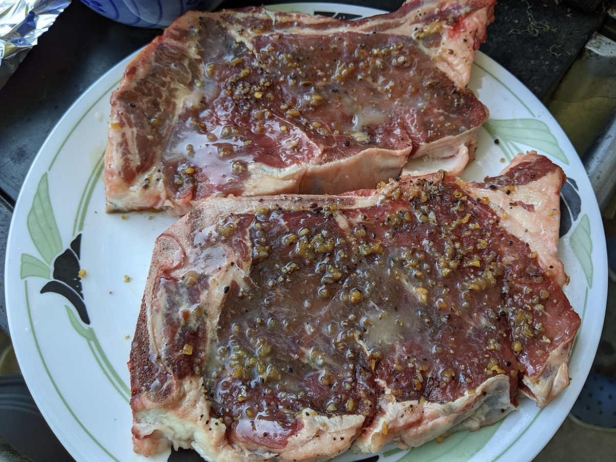 around 6:15pm my father took out the new york strip steaks and grilled them on the barbecue. they'd been out for an hour and my mother seasoned them with montreal steak seasoning while my father brushed some melted butter on the steaks. we cleaned the grill beforehand, scooping out all the ash from the bottom of the barbecue, so it doesn't ignite when beef fat drips onto them. my father also grilled some long-horn peppers. we went with 3-minutes per side on the steaks, to keep them medium-rare. there didn't seem to be enough of a crust though, so we added another minute to each side. there were hardly any flare-ups because of the cleaning we did beforehand; it was weird grilling foods that was scorched by non-stop flames.