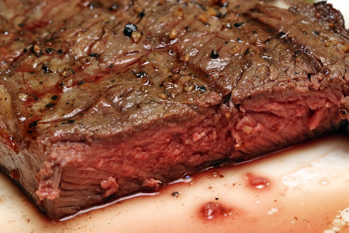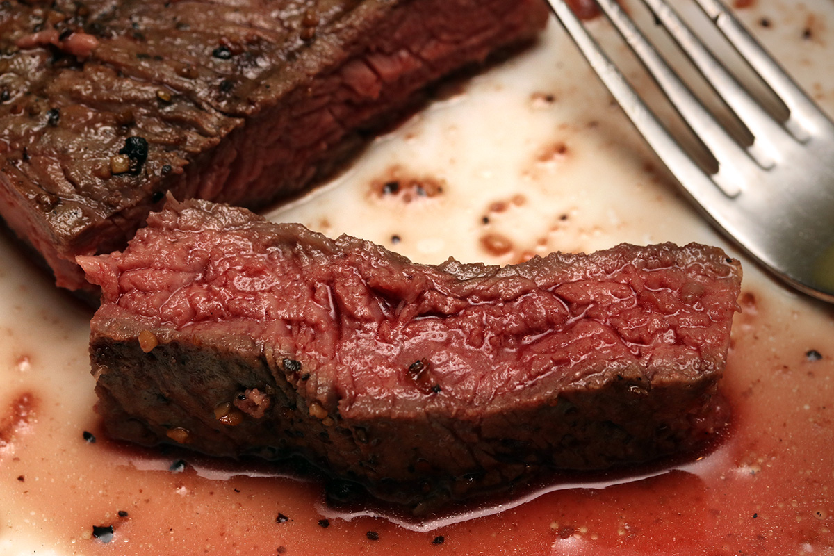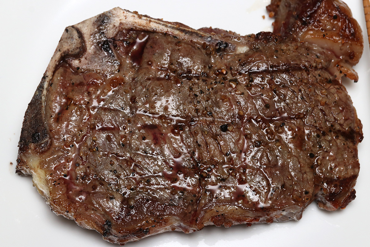 the steaks turned out to be perfectly cooked at medium-rare. unlike the porterhouse steaks we had yesterday (which were just a delicious) that were on the dry side (being medium-well done), these medium-rare new york strip steaks were super juicy. the only thing i'd change is maybe more seasoning on both sides. since we only had two pieces of steaks, my mother said she didn't want any and let my father and i have them, though we gave her some sample pieces to try.