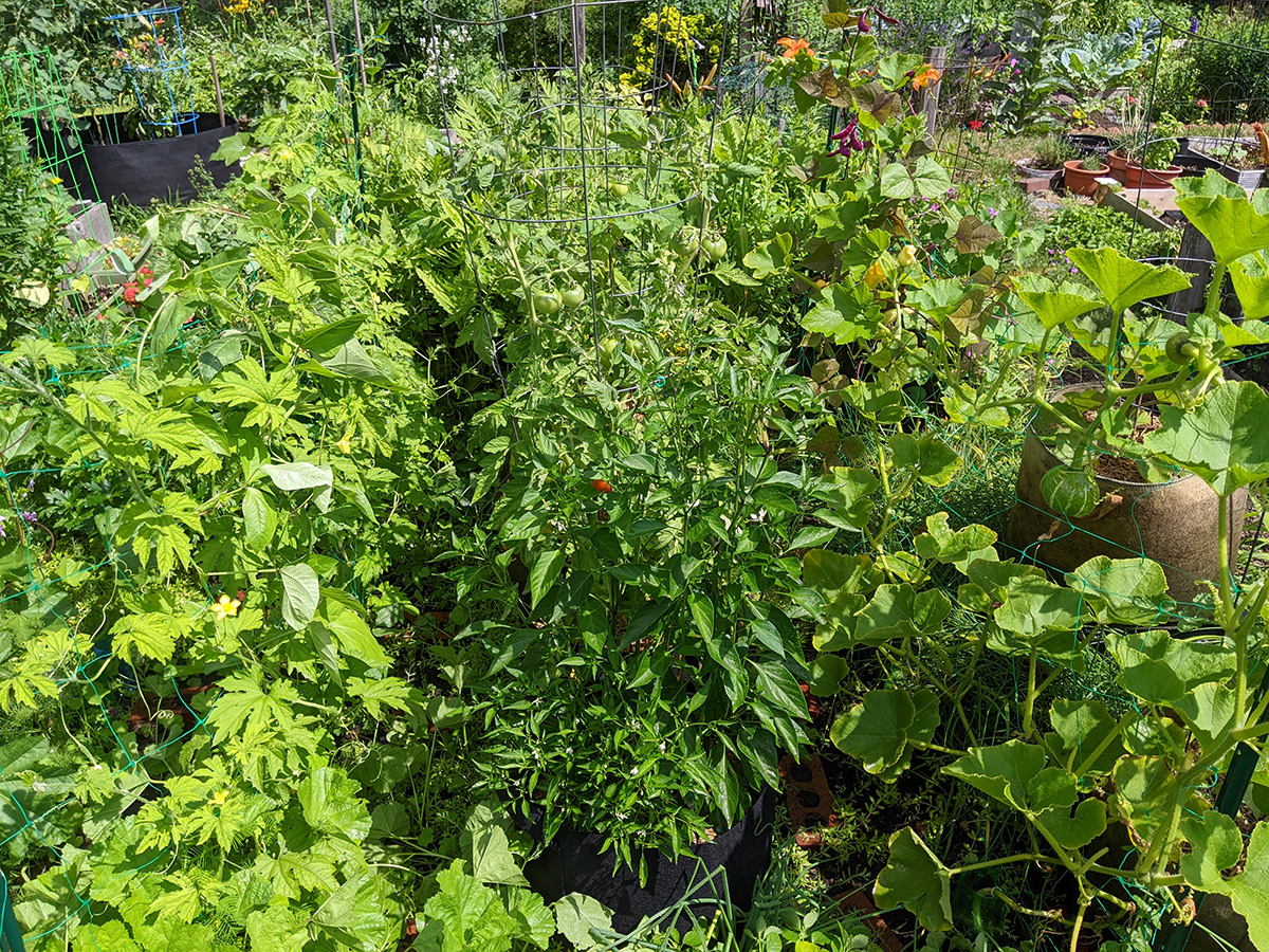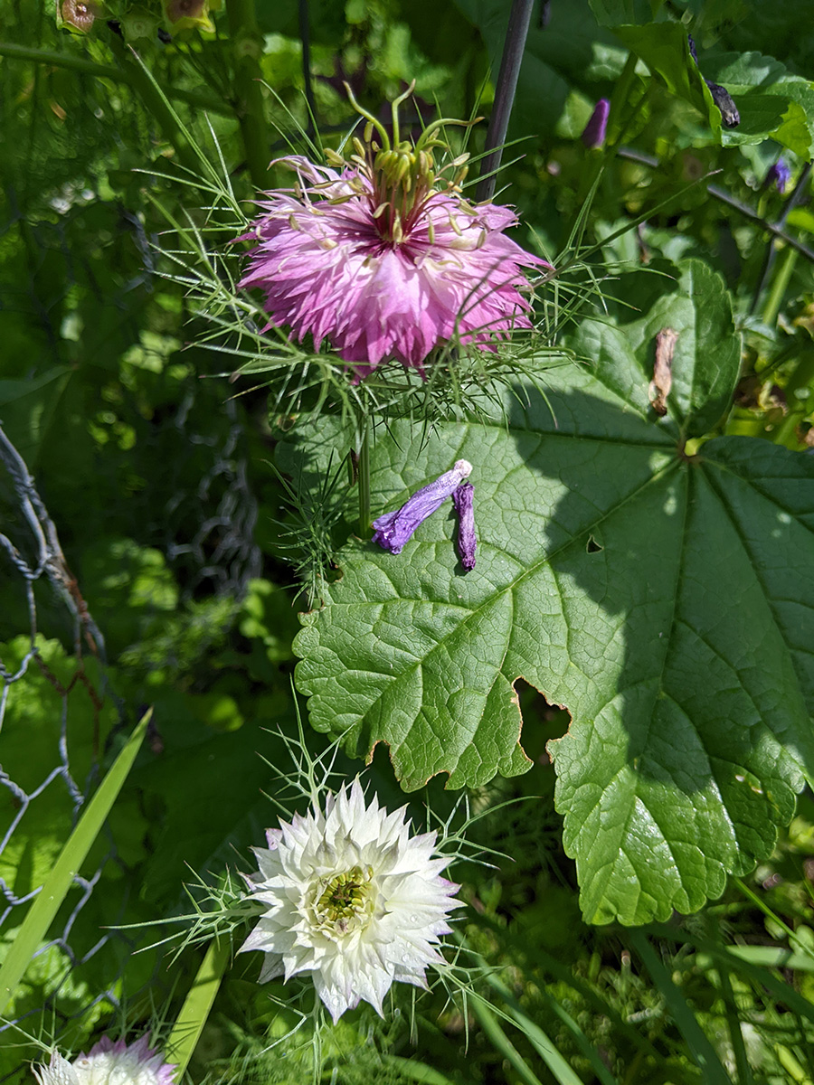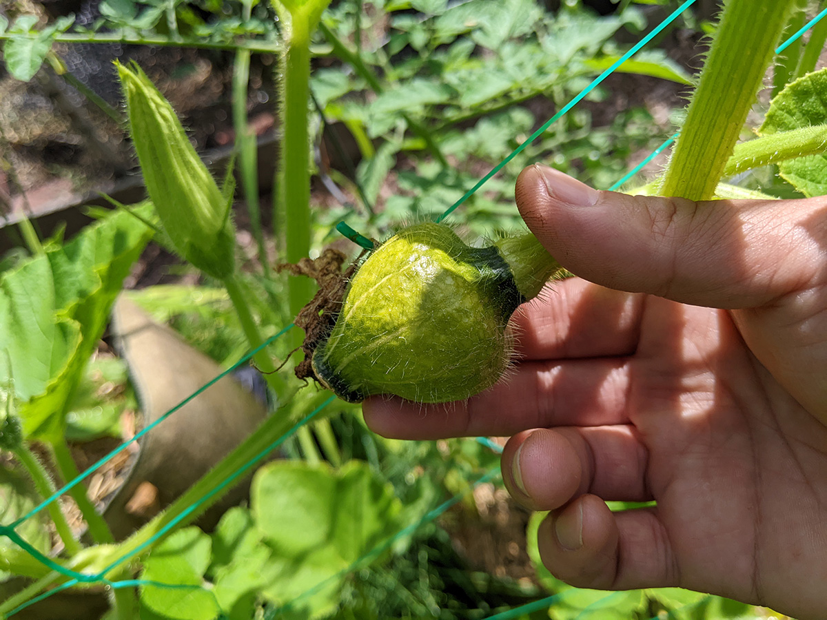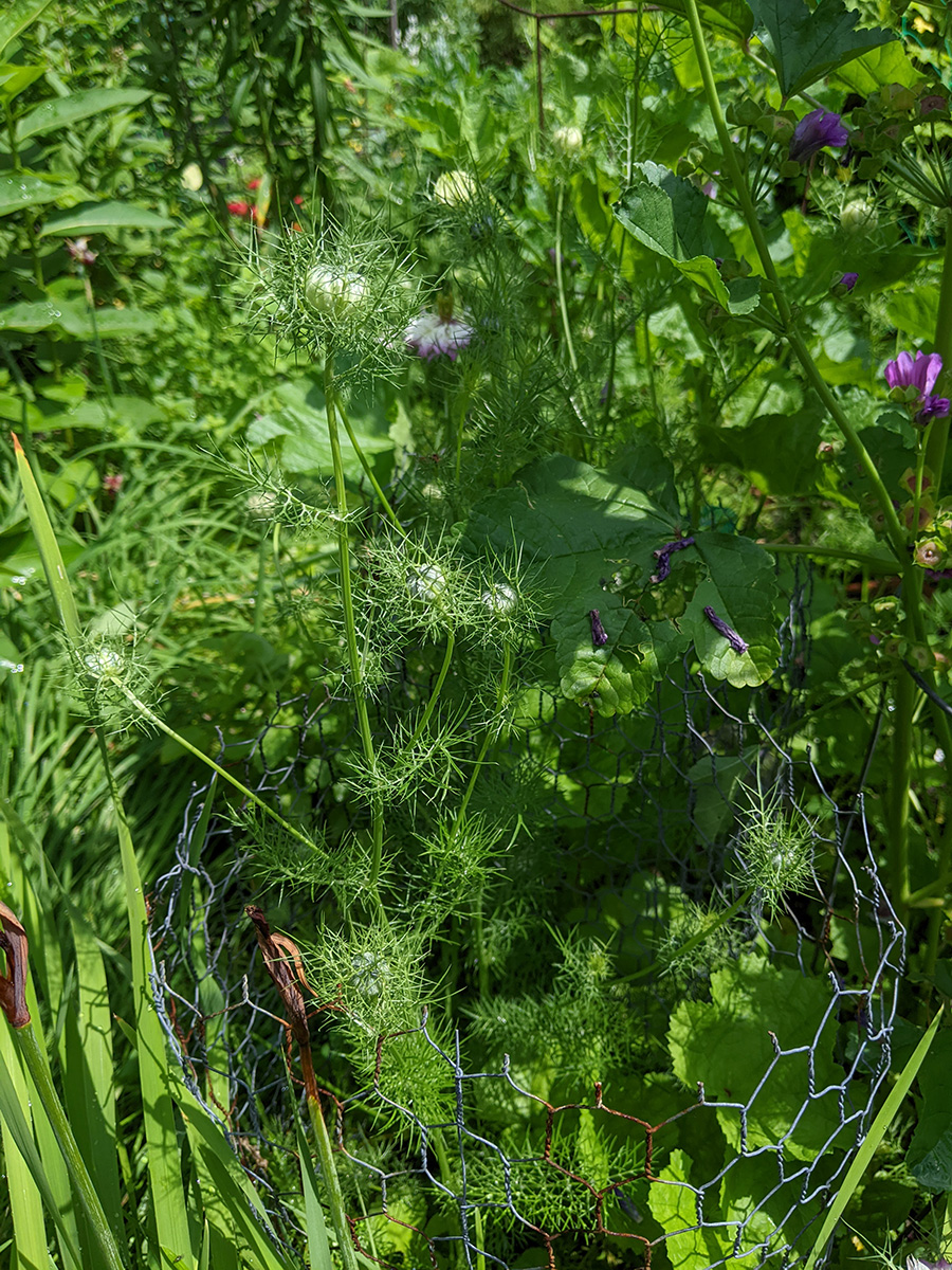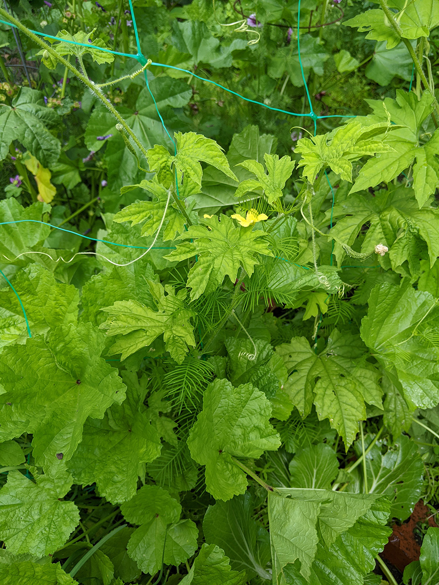 i went down to the community garden this morning to water my plants. i hadn't been there since the 4th, figured i was overdue for a visit. i've got two medium-sized buttercup squashes, i'm guessing one per squash plant. i was surprised to find a ripe (red) medium-sized tomato. elsewhere, my nigellas are blooming, and my bitter melons have produced some baby melons, hopefully i'll get some full-grown bitter melons in a few more weeks. my pepper plants are super tall - nearly as tall as my tomatoes - but so far i haven't seen any immature peppers yet, just a few flowers.