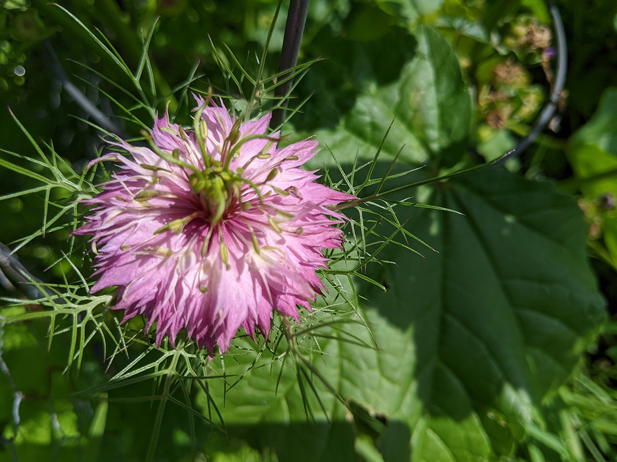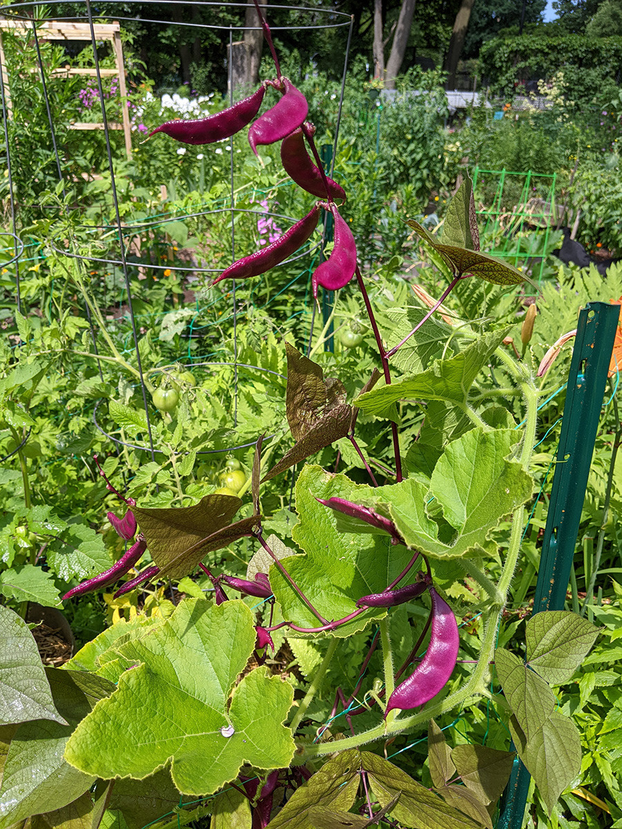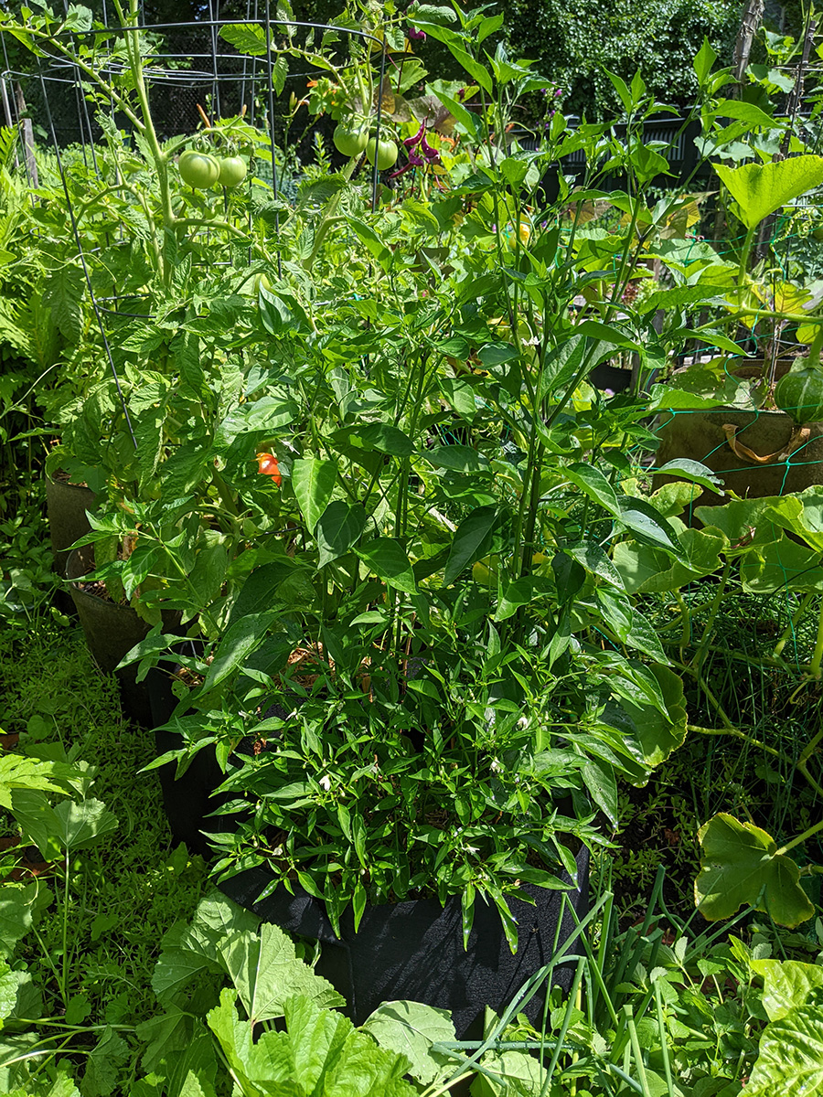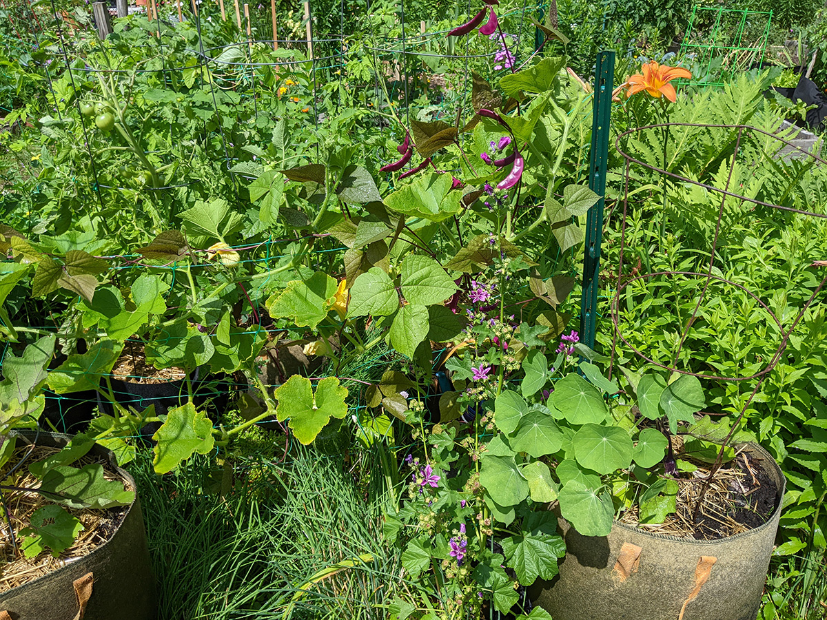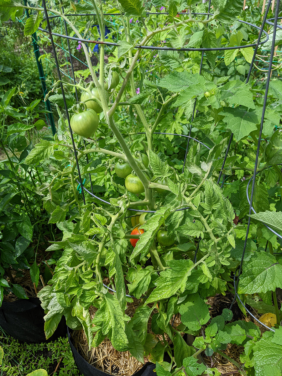 i went down to the community garden this morning to water my plants. i hadn't been there since the 4th, figured i was overdue for a visit. i've got two medium-sized buttercup squashes, i'm guessing one per squash plant. i was surprised to find a ripe (red) medium-sized tomato. elsewhere, my nigellas are blooming, and my bitter melons have produced some baby melons, hopefully i'll get some full-grown bitter melons in a few more weeks. my pepper plants are super tall - nearly as tall as my tomatoes - but so far i haven't seen any immature peppers yet, just a few flowers.