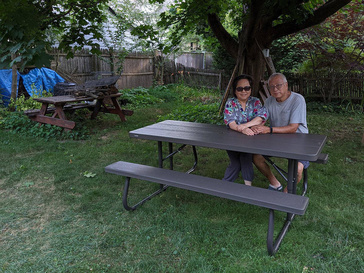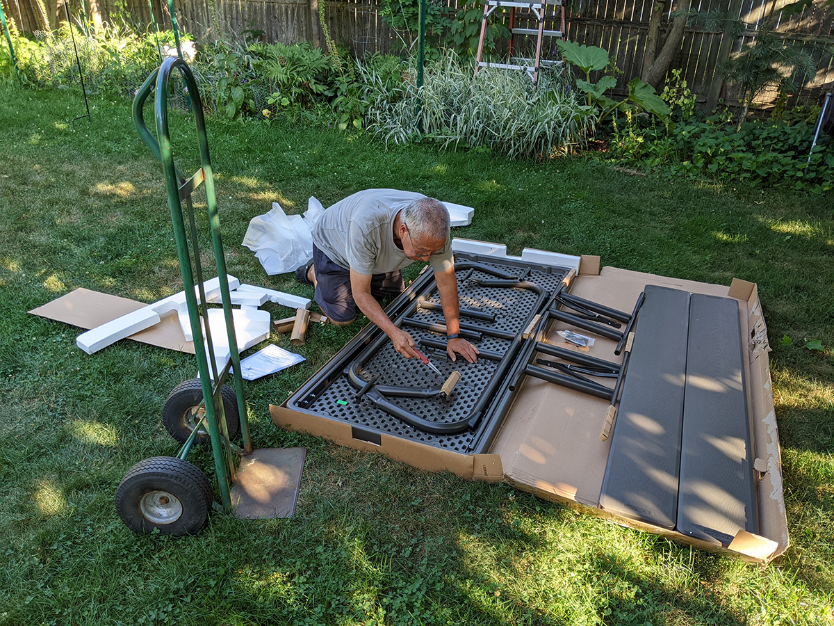 after dinner my father and i went back out into the backyard to assemble the picnic table. we couldn't make sense of the direction but there was a QR code that pointed to a video showing how to assemble the table. that gave us a starting point. it's actually not too hard to piece together, and the design is pretty ingenious. if we thought the table would be lighter than a traditional wooden picnic table, that's not the case at all (75 lbs). besides the weight, another thing we noticed right away once the table was assembled was it was a bit rickety. i never had that problem with a wooden picnic table - which always felt very solid - but this table you can shake it and it feels like its falling apart (which it won't). the more people sitting on the benches though, the more solid it becomes. the pros are we don't need to treatment it (like we do with a wooden table) and it can be folded and stored in the garage during the winter. there's also a hole in the center of the table to pull an umbrella, but we already have plenty of shade from our backyard maple tree, although we could move the picnic table elsewhere if we wanted to. my mother likes it because you don't need to swing your feet over the support brace like you do with a wooden table. we ended up elevating the table onto 4 bricks so the metal ground bars don't kill the grass.