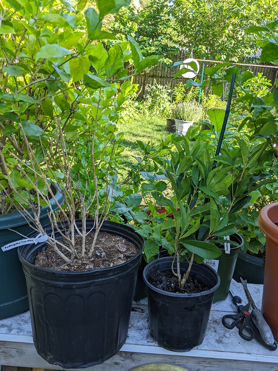 we opened up the osmanthus first. it was supposed to be gallon-sized but it looked more like quart-sized. this one only had a handful of branches; the one we got back in october had way more branches and looked like a miniature bush. this one also had zero flowers while the previous osmanthus was full of flowers (of course osmanthus don't flower until the fall-winter). however, we have all summer to allow it to flourish outside in the bright sun, so hopefully this new fudingzhu can grow healthy enough to survive the winter indoors. plus, when fudingzhu flowers, it doesn't matter what the plant looks like, it will literally flower everywhere and for months on end.