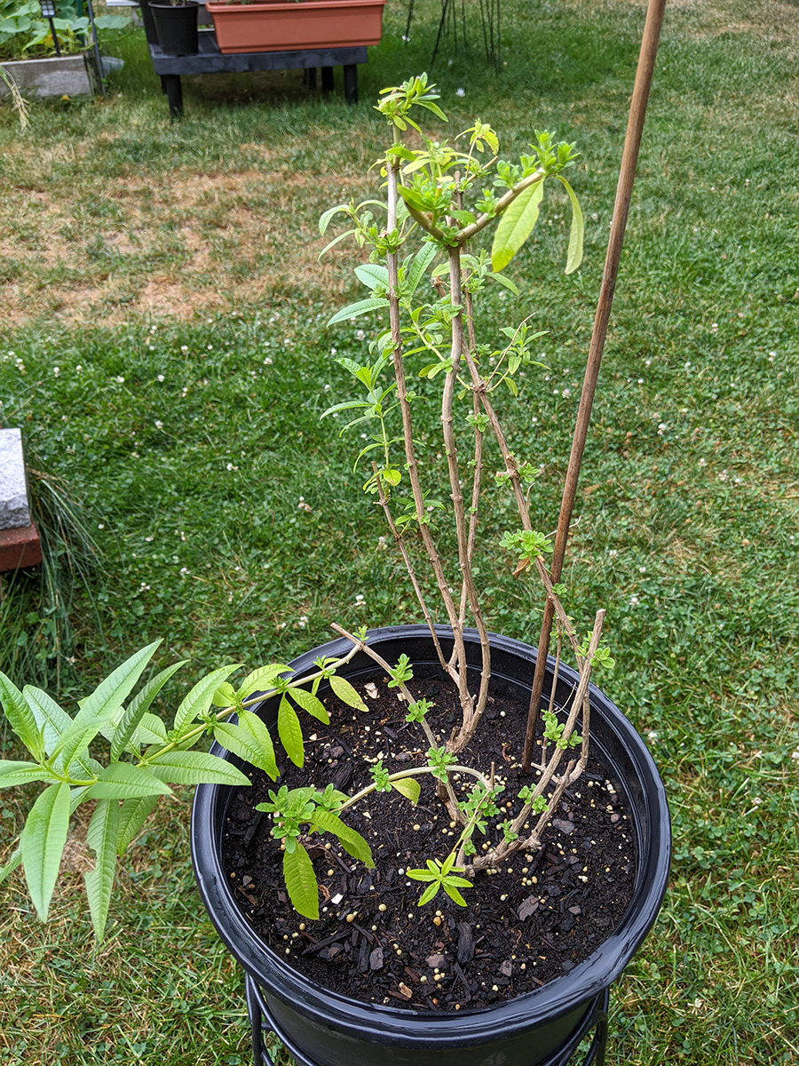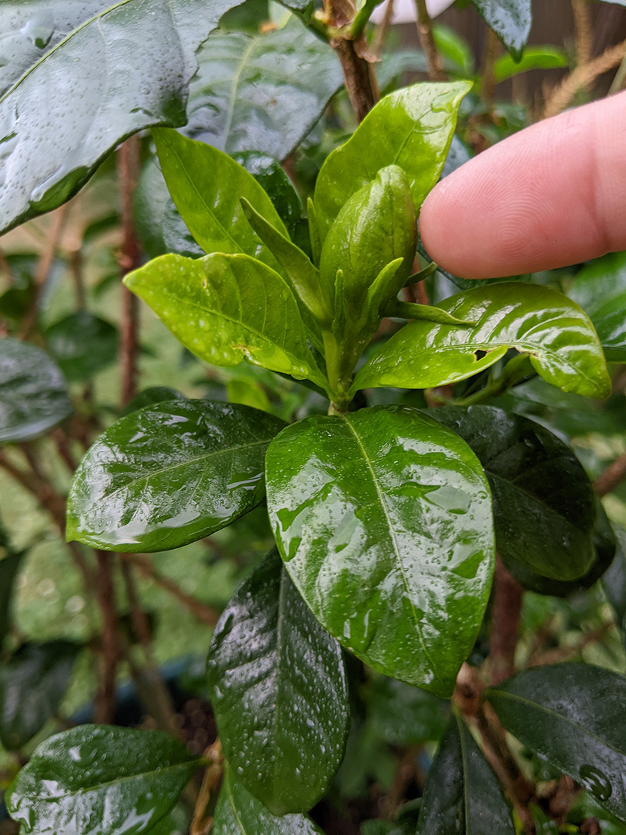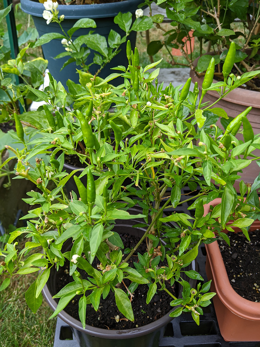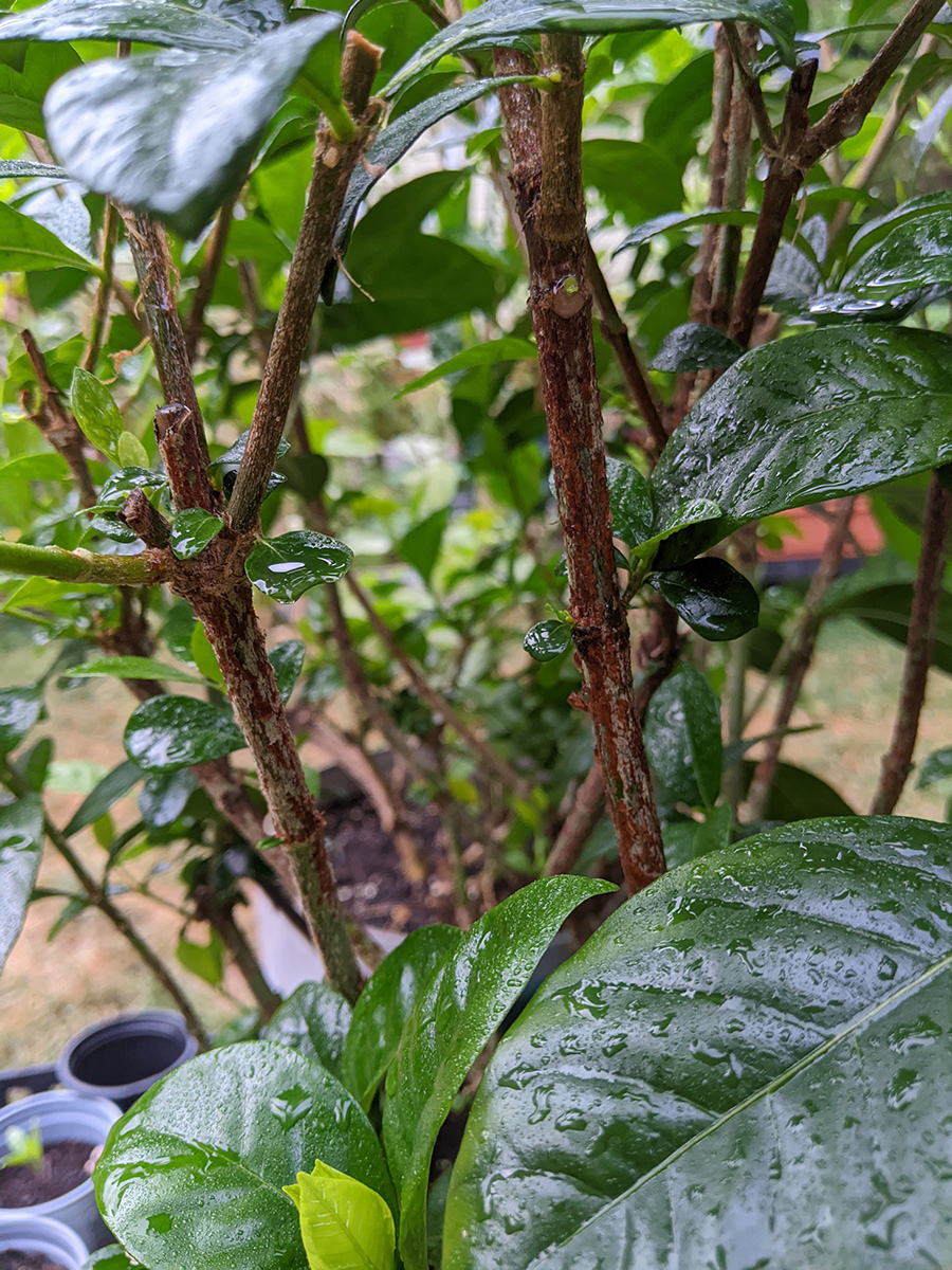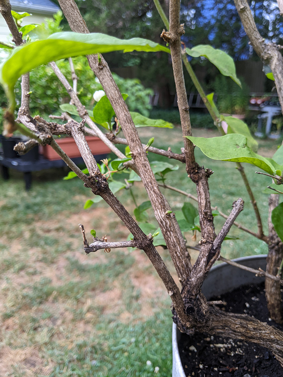like i mentioned earlier, the rain barrel gauge hardly moved, we didn't collect any significant amount of rain. one of the new gardenia flower buds dropped off, the one with the yellow stem we noticed yesterday; the other flower bud seems to be okay for the time being. the home depot osmanthus is starting to form some flowers, which is unusual since i thought they didn't flower until the fall-winter seasons. a lot of our pruned potted plants are beginning to grow new leaves: the lemon verbana i noticed yesterday, but had we known we would've pruned earlier; the gardenia; and the jasmine. also all those plants absolutely thrive in the heat (as long as they get watered daily) and sunlight.