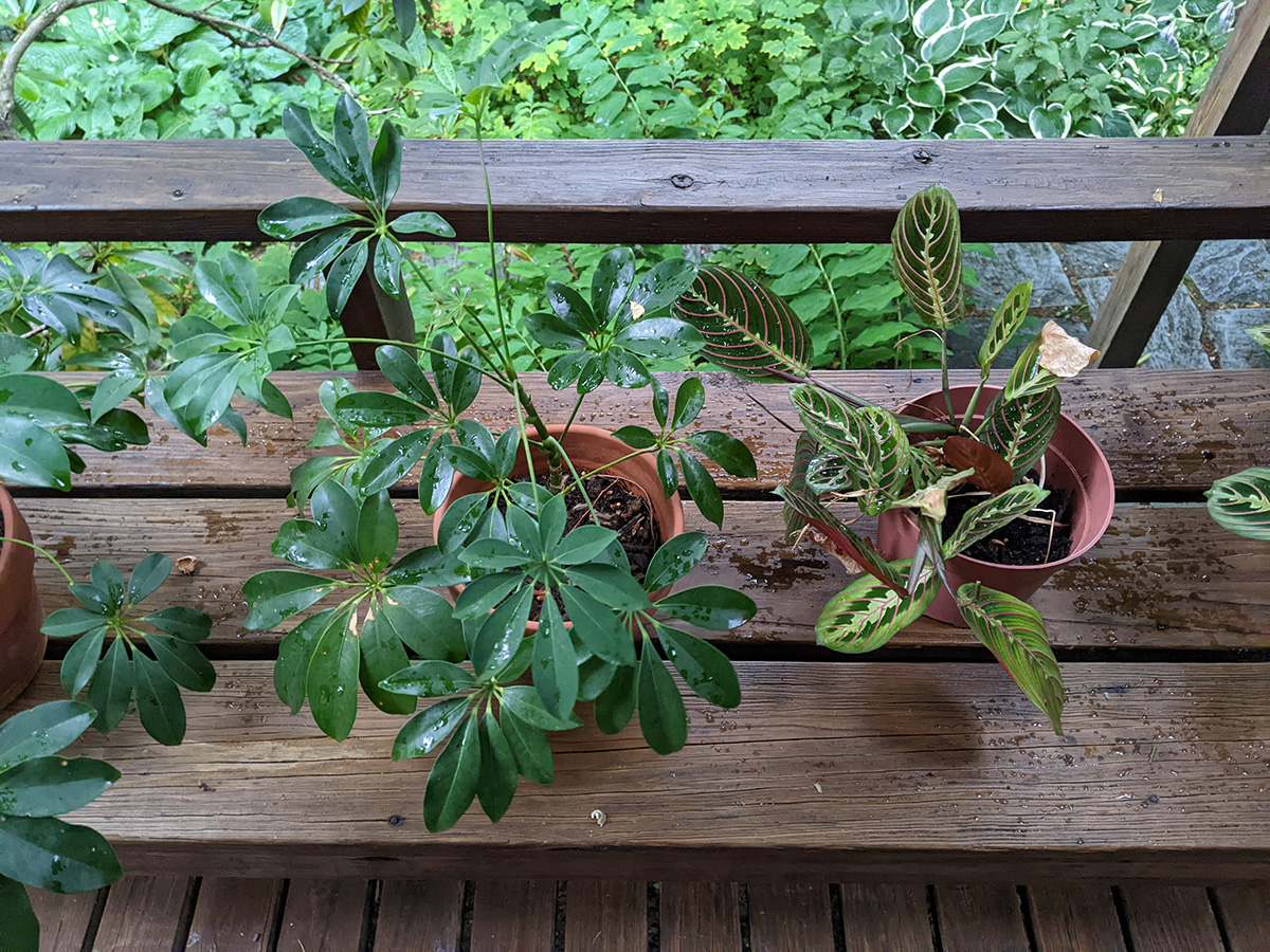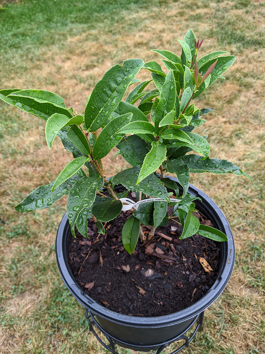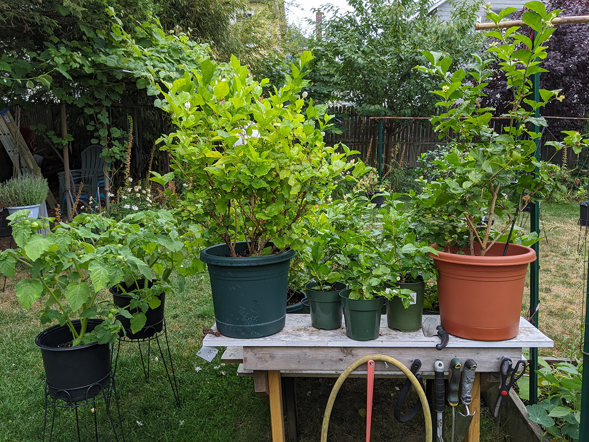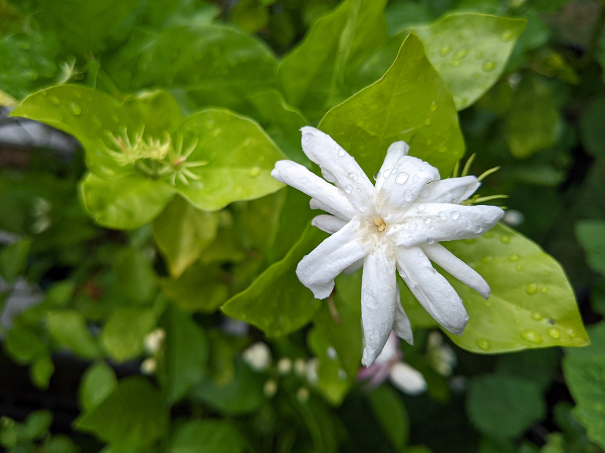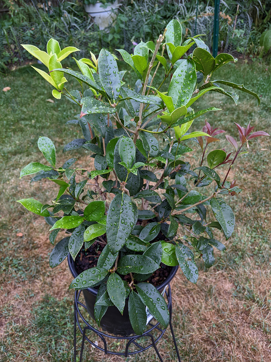 like i mentioned earlier, the rain barrel gauge hardly moved, we didn't collect any significant amount of rain. one of the new gardenia flower buds dropped off, the one with the yellow stem we noticed yesterday; the other flower bud seems to be okay for the time being. the home depot osmanthus is starting to form some flowers, which is unusual since i thought they didn't flower until the fall-winter seasons. a lot of our pruned potted plants are beginning to grow new leaves: the lemon verbana i noticed yesterday, but had we known we would've pruned earlier; the gardenia; and the jasmine. also all those plants absolutely thrive in the heat (as long as they get watered daily) and sunlight.