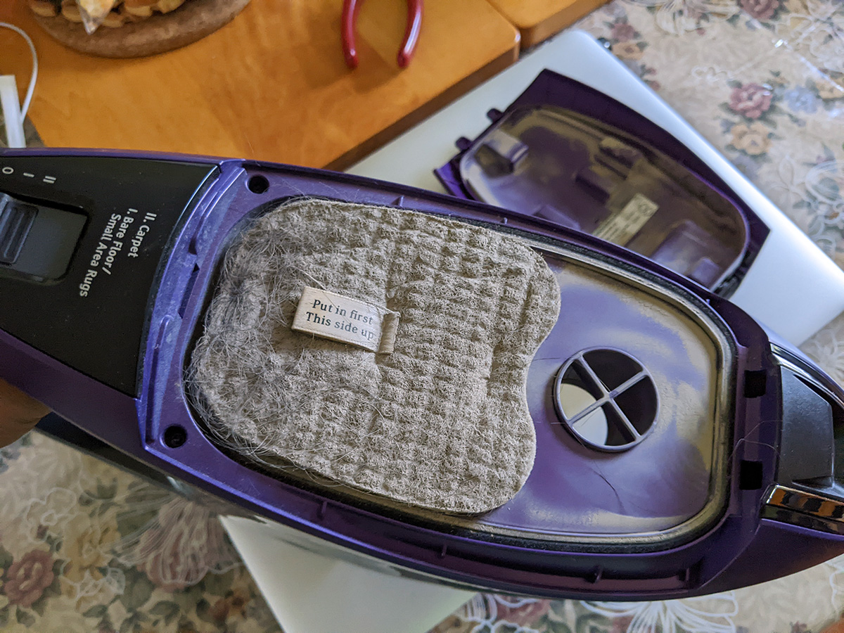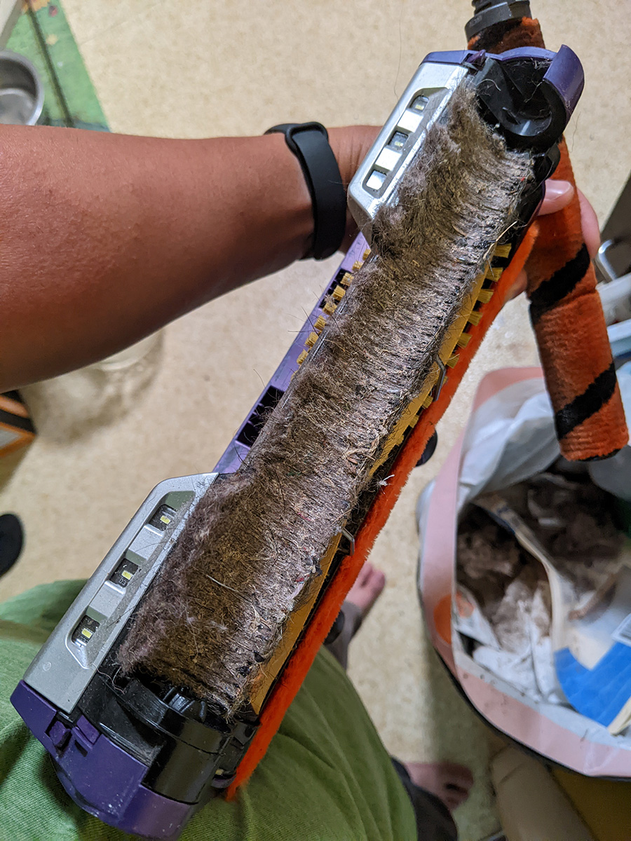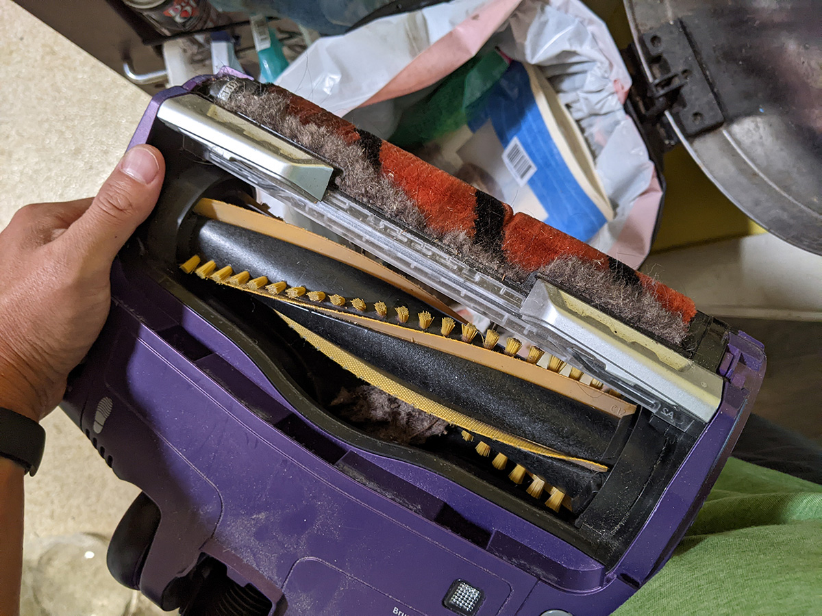 i continued testing the various vacuums, even though we already decided to return the dyson. my sister was here earlier, and i showed her how much better the levoit was compared to the dyson, but she's pro-dyson (being otherwise would mean her $300-400 vacuum purchase was a mistake), even though it's the weaker machine in all categories (performance, ease of use, power, price). out of curiosity i plugged in the corded shark vacuum. since it doesn't run on a battery, it's much more powerful. but the shark vacuum wasn't designed for portability, so everything about it seems heavier after having used a cordless vac. the levoit is so good i'm tempted to retire the shark and replace it with that instead. while using the shark vac, i smelled dog dander. i opened up the filter compartment and decided to wash the dust-covered filters. i also disassembled the shark vacuum head: what i thought initially was a fuzzy brush head turned out to be caked on animal hair and dust. that would explain the smell! i scraped off the debris and clean the vacuum head of additional dust and hairs. the shark vacuum is relatively new - we got it back in september 2020 - but apparently i've never once cleaned the vacuum head before. from what i can remember of our old dyson DC47 canister vacuum, i had to clean the vacuum head all the time, it had a tendency to get long hairs tangle in the brush head.