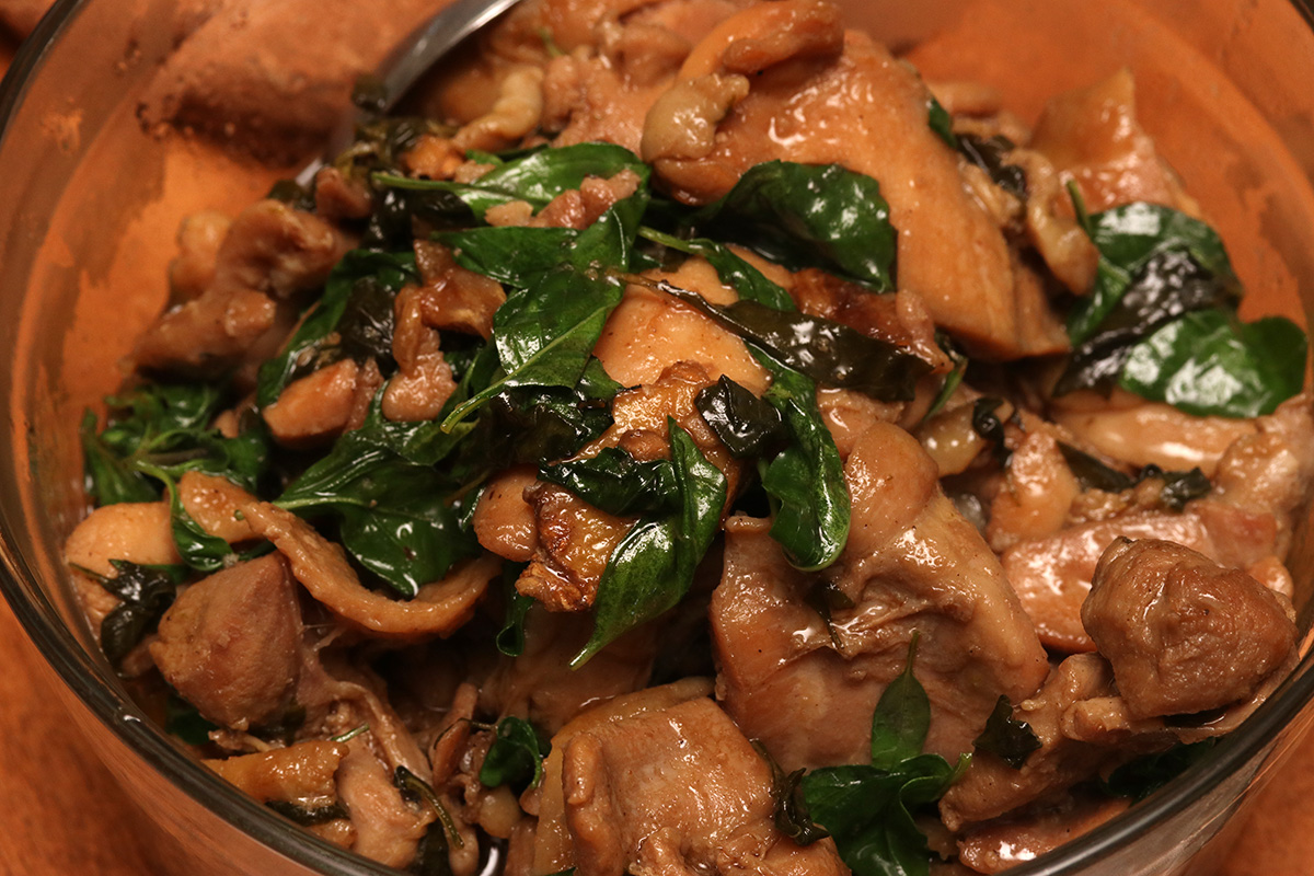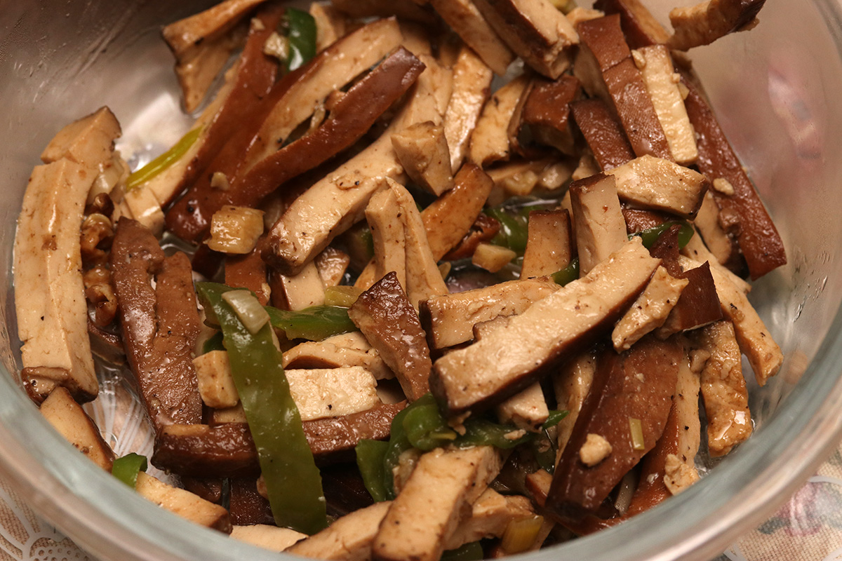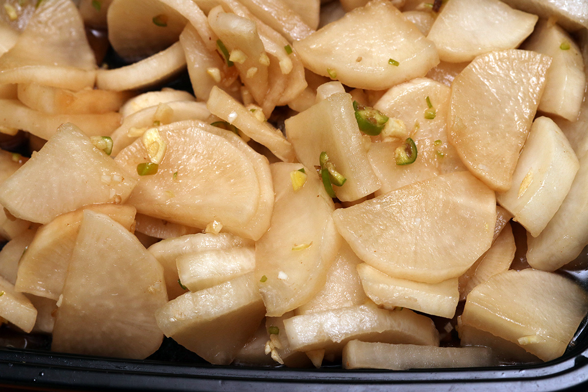 it was close to 6:30pm before we finally came inside for dinner. my mother made 三杯雞 ("3 cup chicken") which is a taiwanese dish that involves chicken and thai basil. she also made a pickled radish dish, plus plenty of leftovers from yesterday including the pork & beans stew.
