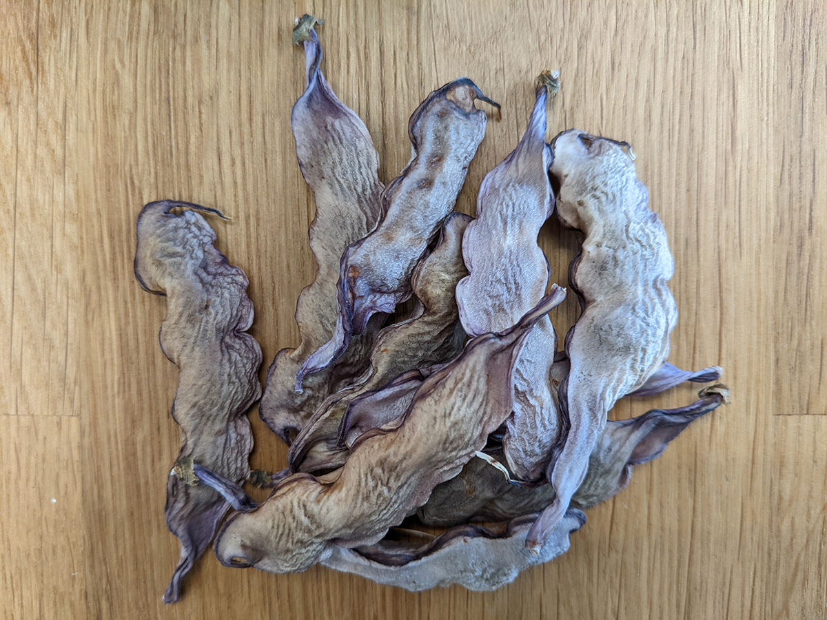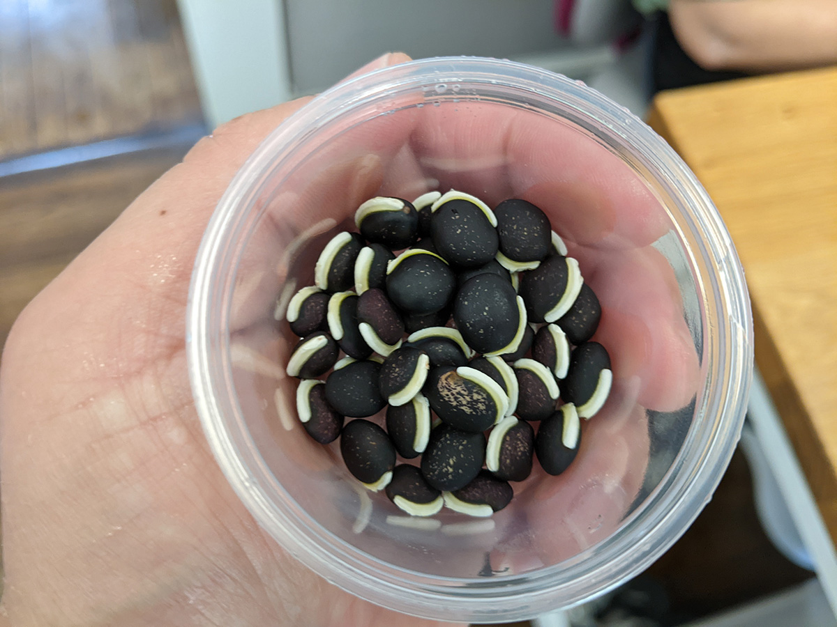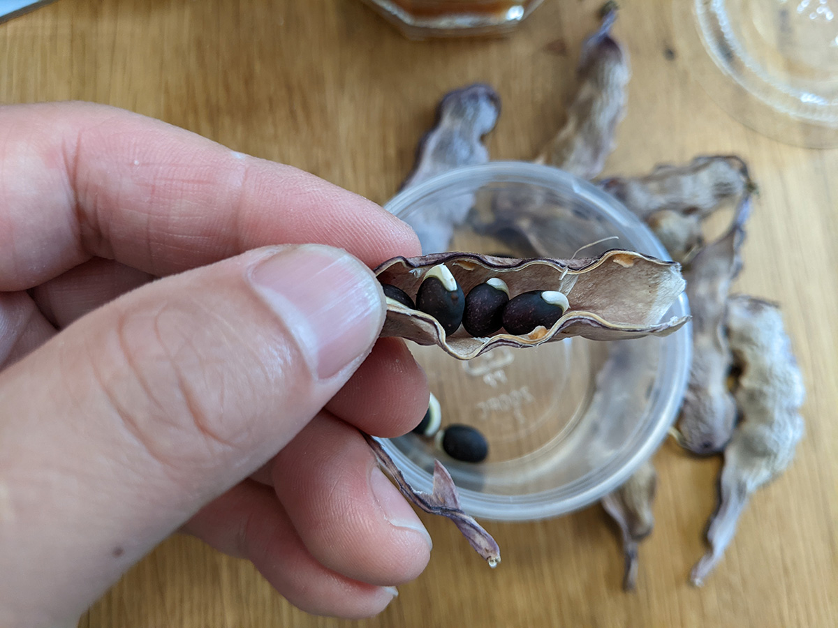 i unpeeled the dried up hyacinth beans i collected from my garden earlier. the beans looked very much dead, and i wasn't expecting good results, but when i unshelled them, inside were perfect hyacinth beans (in that distinctive black and white pattern), ready for planting next season. unfortunately (or fortunately) we still have hundreds of leftover seeds from last season. these seeds i got from my garden are particularly healthy; many of the seeds we got from last year, the beans were harvested before they were fully ripened, so the seeds were brownish-white instead of black-white.