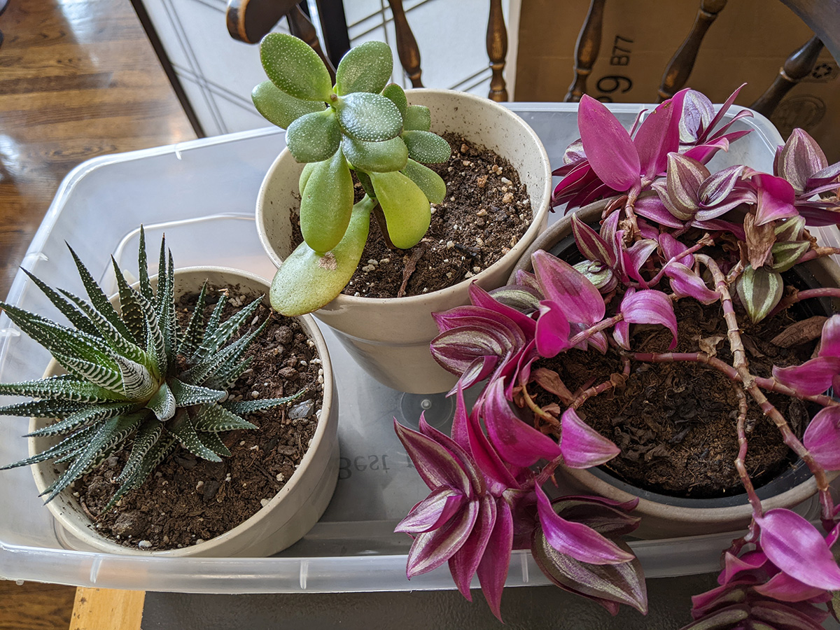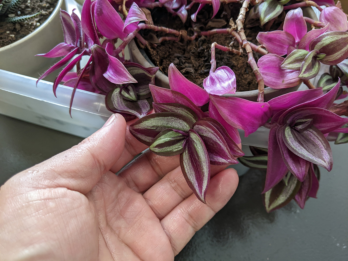my sister returned from lunch with her korean friend, who gave her some plants to take care of while she's away: a jade plant, a zebra haworthia, and a tradescantia. all three plants appeared pretty dry, don't know how well they'll survive at my sister's place which is nearly devoid of any sun. the tradescantia is especially pretty, i was tempted to take a cutting so i can propagate my own. looks like a trip to a neighboring plant shop is in order!