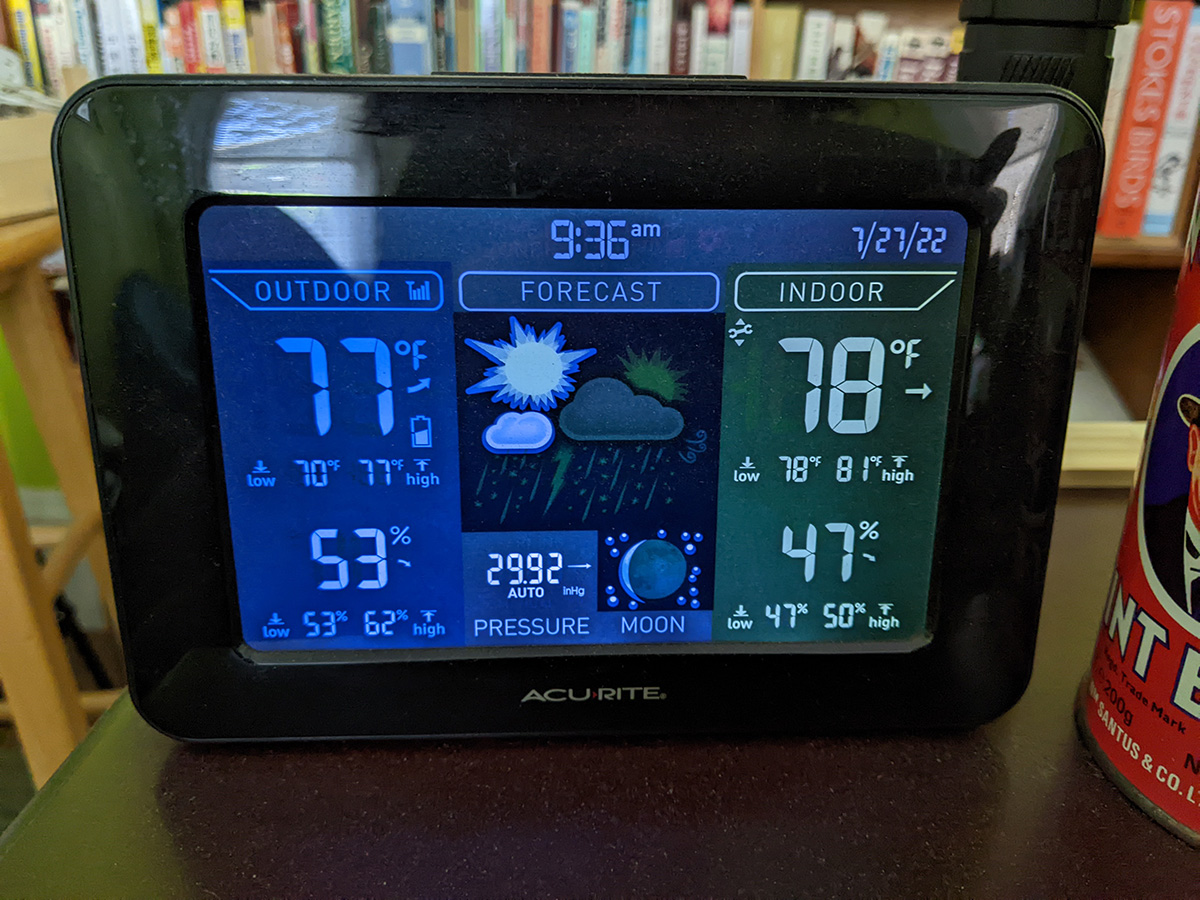 it wasn't too hot inside the house today (81 degrees inside and outside), i didn't need to turn on the AC. when evening came and the temperature dropped into the 70's, once again i opened up all my windows and use the kitchen window fan to blow hot air out while aiming the vornado air recirculator across my living room up to a ceiling corner.