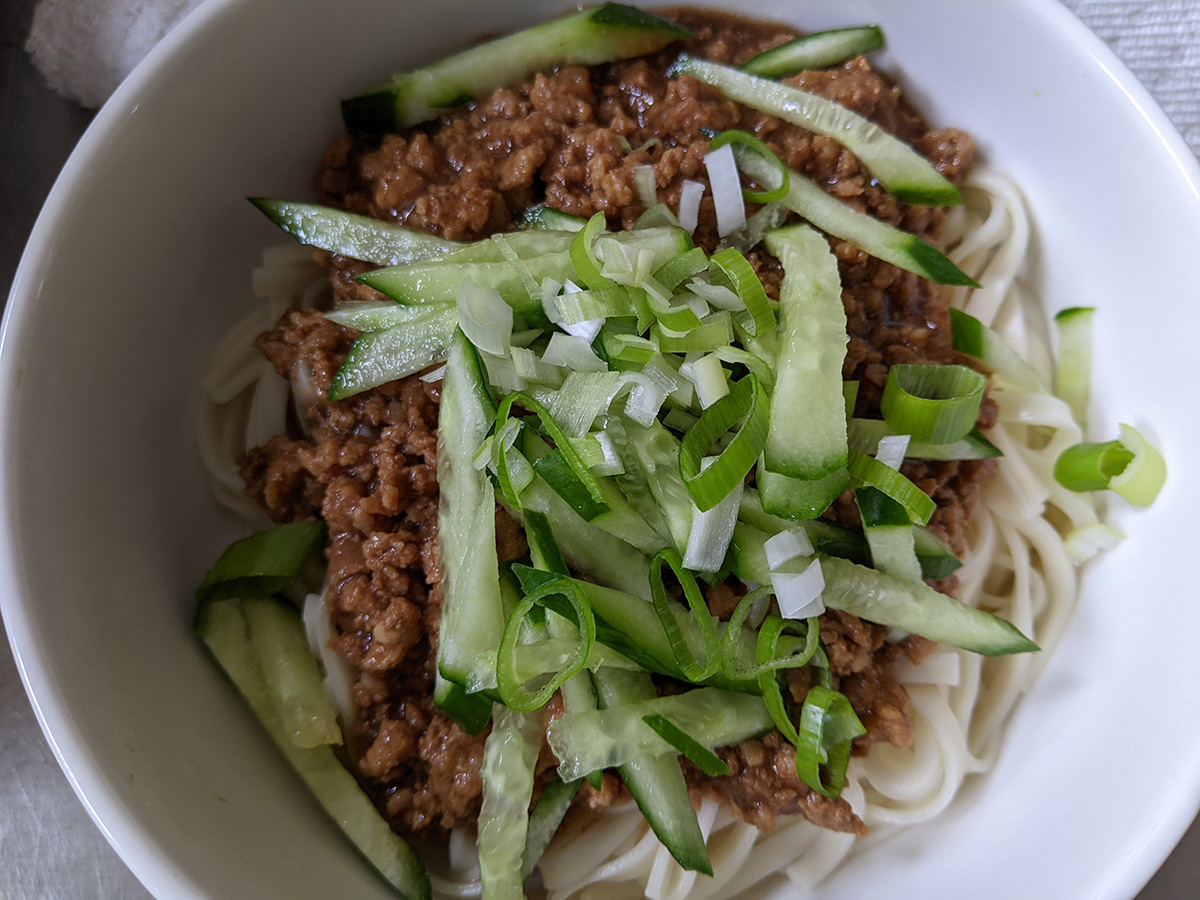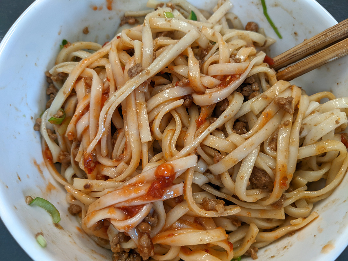 around 2:45pm during another lull, my mother made some zhajiang noodles for everyone. i ate it at first as-is (with cucumber slices and chopped scallions) before my mother reminded me that everything tastes better with hot sauce.