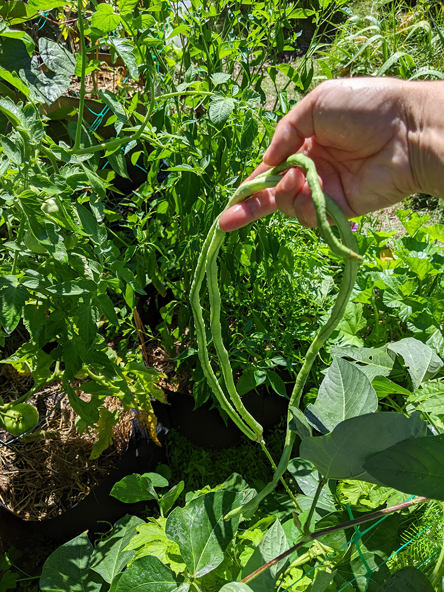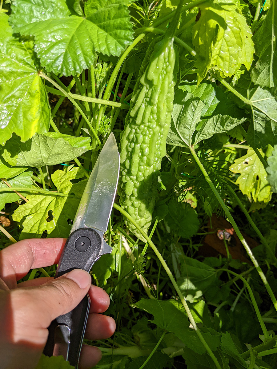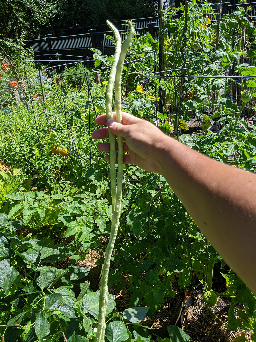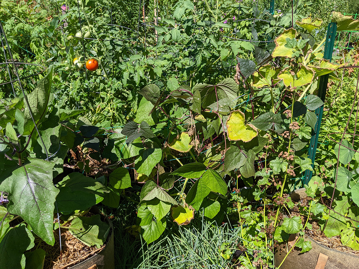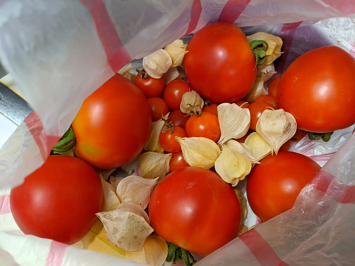 i stopped by the community garden to water my plot before heading to the cafe. i harvested a bunch of things, including tomatoes (regular and cherry), a taiwanese eggplant, some long beans, and a handful of ground cherries. i also did some pruning of dead tomato branches, but it was really just an excuse to flash my new knife.