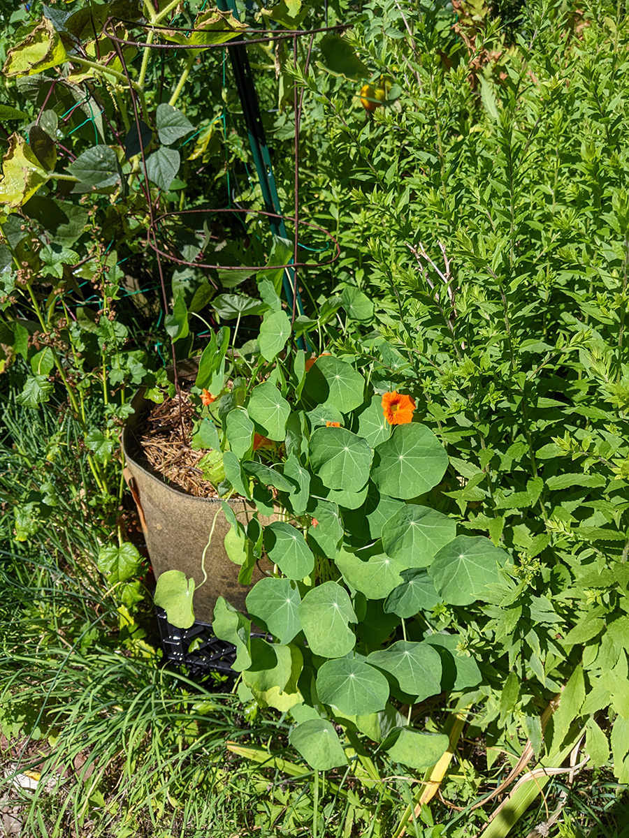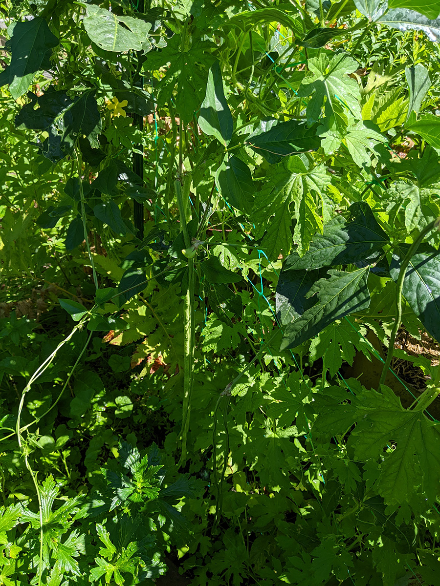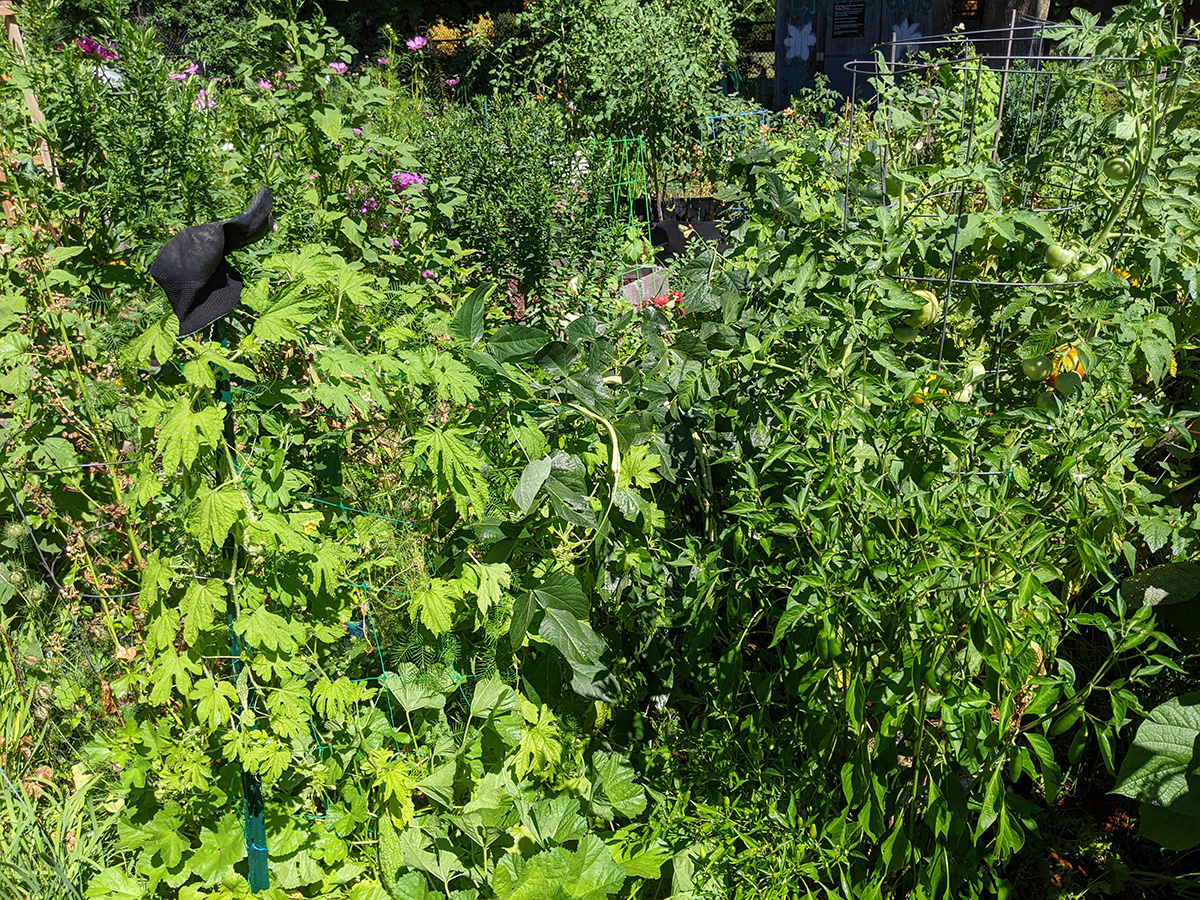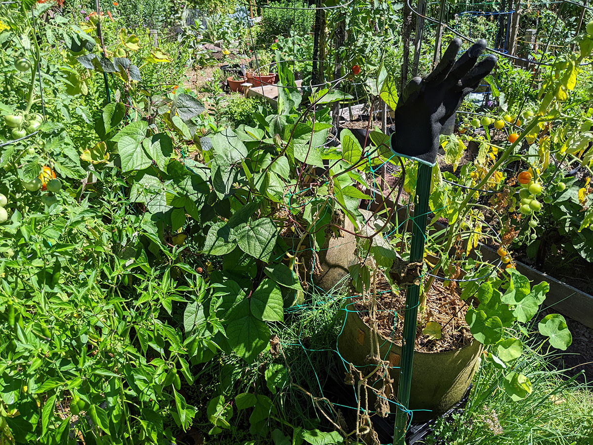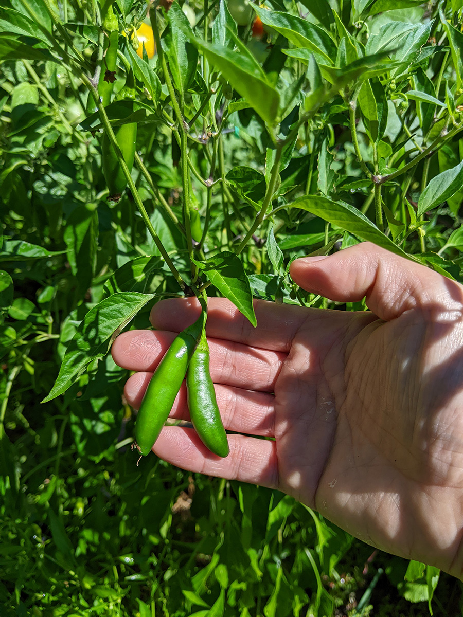 i stopped by the community garden to water my plot before heading to the cafe. i harvested a bunch of things, including tomatoes (regular and cherry), a taiwanese eggplant, some long beans, and a handful of ground cherries. i also did some pruning of dead tomato branches, but it was really just an excuse to flash my new knife.