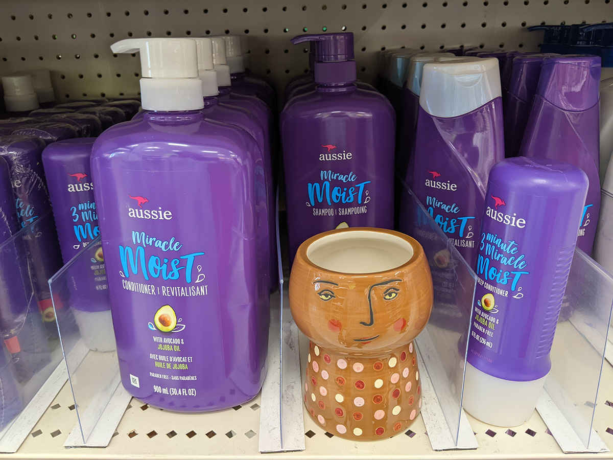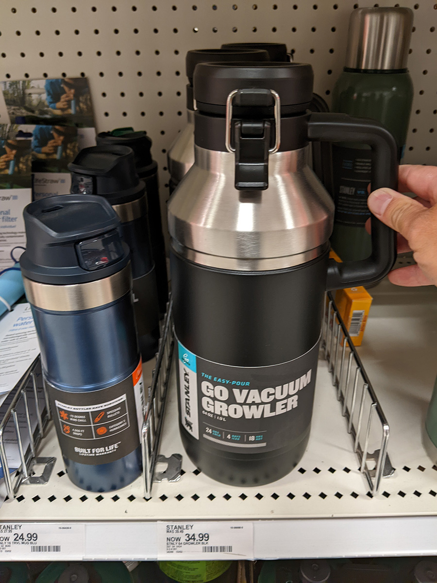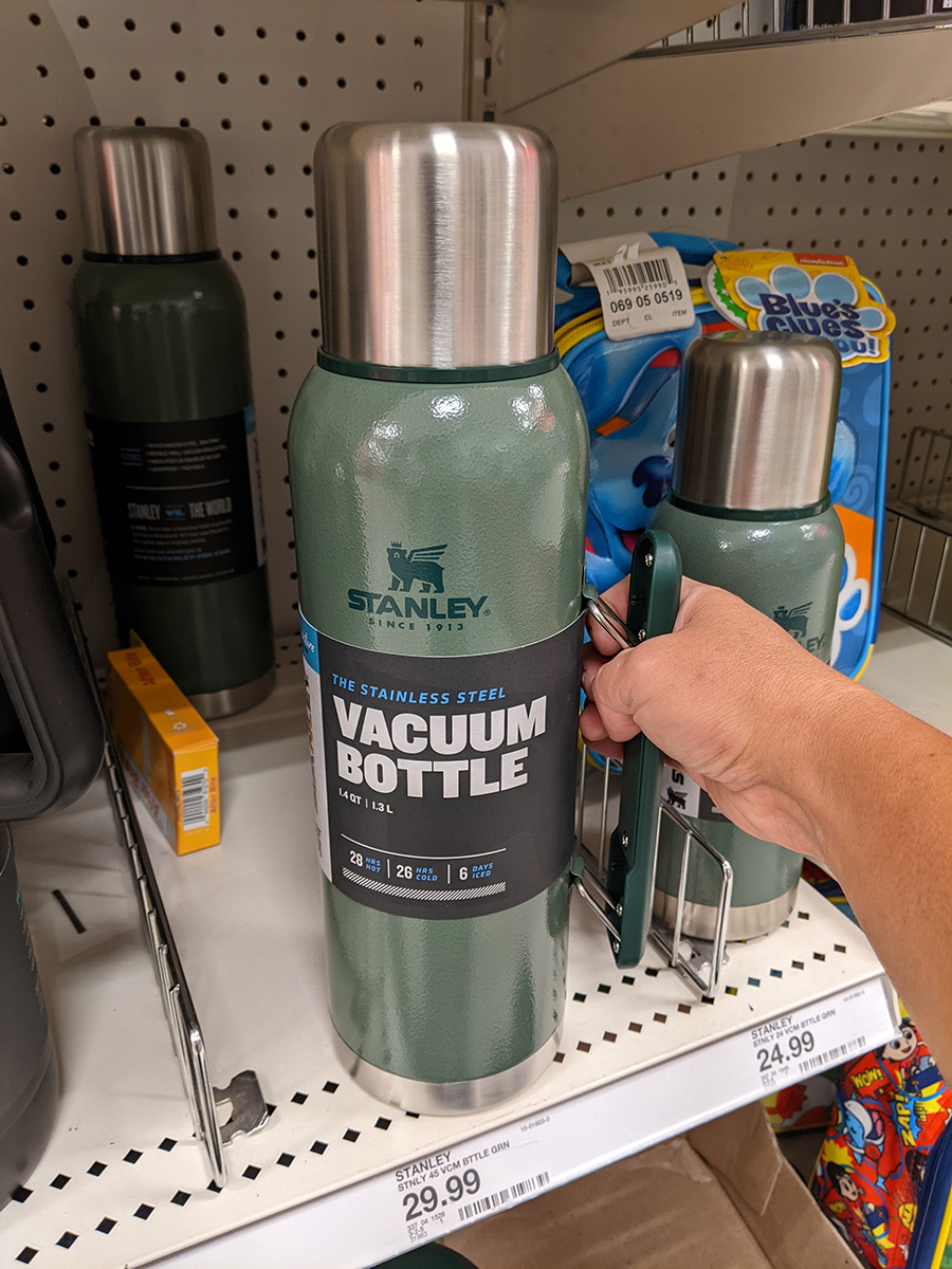 after checking out the ovens, i went in search of insulated bottles. not the kind you use for sport, but the kind you have for camping, to keep drinks hot. for that i made my way to the camping section. stanley makes a 64 oz. growler ($35), but what i was interested in was their classic vacuum bottle. they carried a 1.4qt ($30) which seems like a target exclusive model. i couldn't resist and ended up buying it, with the firm understanding that i'll return it at some point after comparing it to our current thermos insulated bottle. i also bought some aussie shampoo for curly hair before finally leaving.