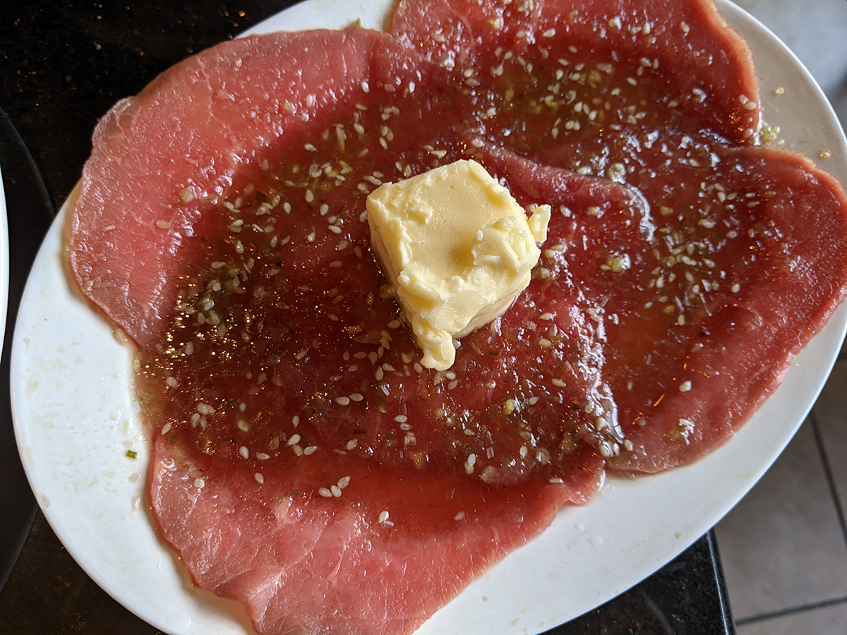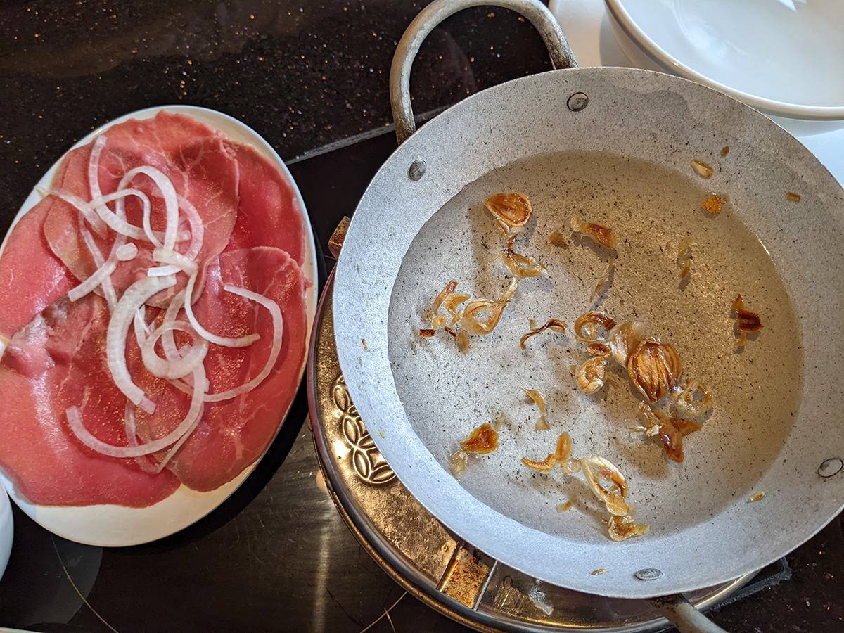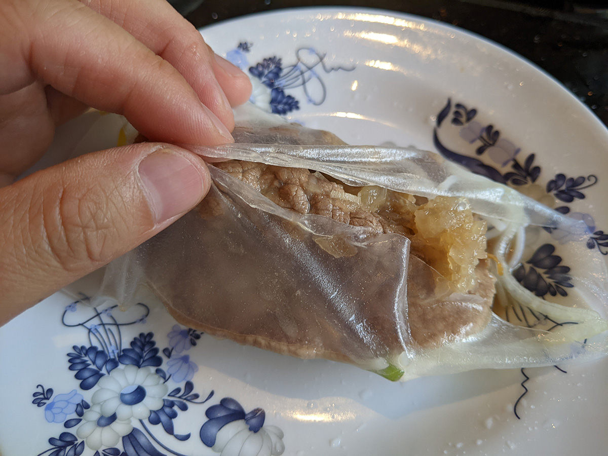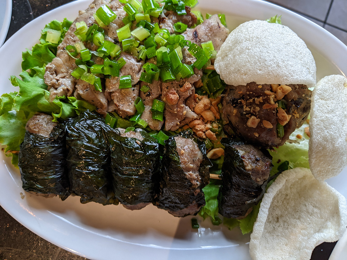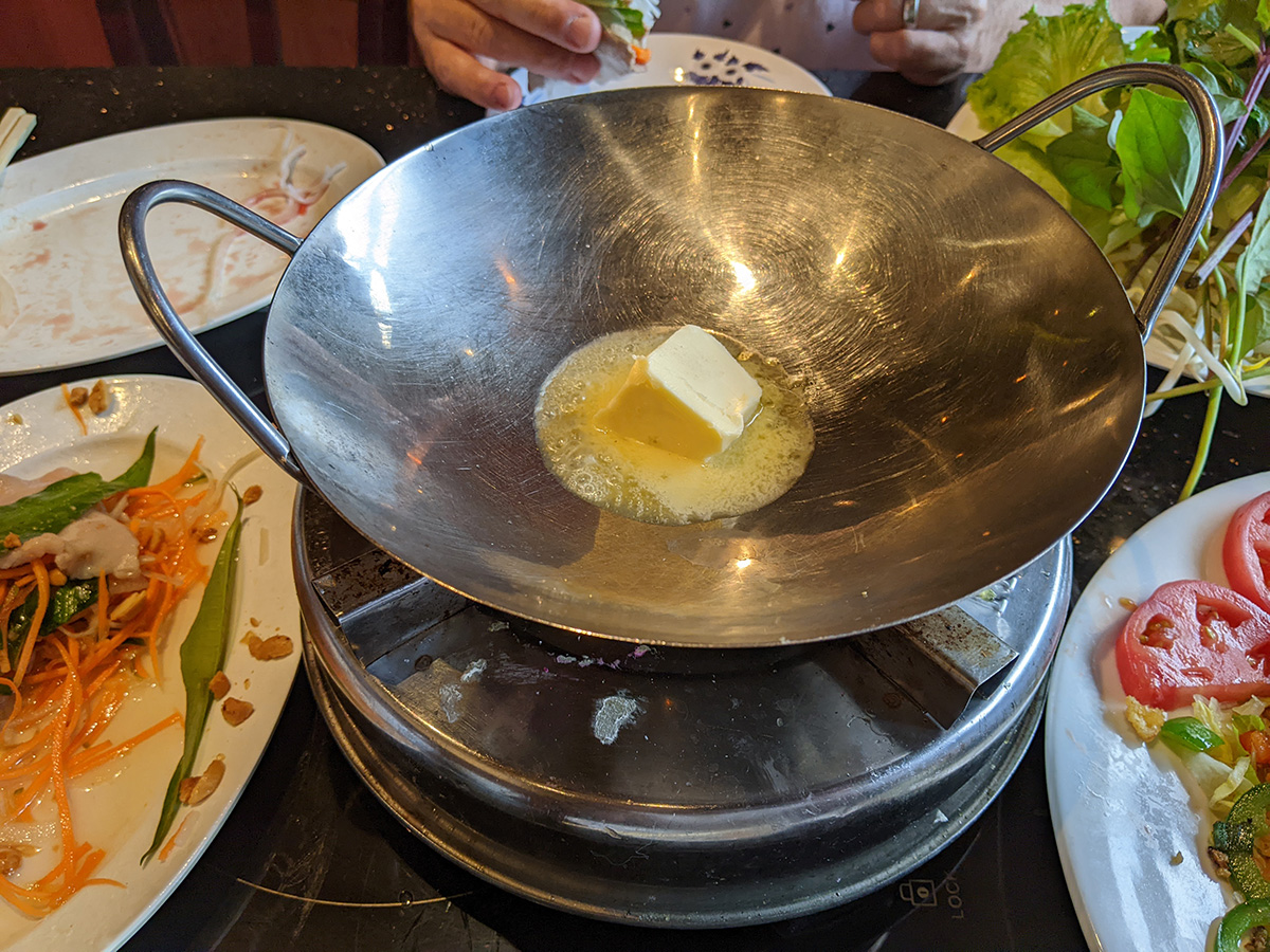 the 7 beef special is good for people looking for adventure, with 7 varieties of vietnamese beef dishes. i didn't know beef was so popular in vietnam. first was the beef fondue in heated vinegar sauce (rolled up in rice wrapper), followed by a beef salad. then grilled beef in heated butter (rice wrapper as well). next came two types of beef skewers - grilled lemongrass and grilled betel nut - as well as a steamed beef meatloaf ball. finally we ended with some beef congee. it came with a house fish sauce that was too ripe for michael. i however put it on my food as much as i could, but the stink permeated my hands as i struggled to make the beef spring rolls, and even after washing it in the bathroom, the smell wouldn't come out.
