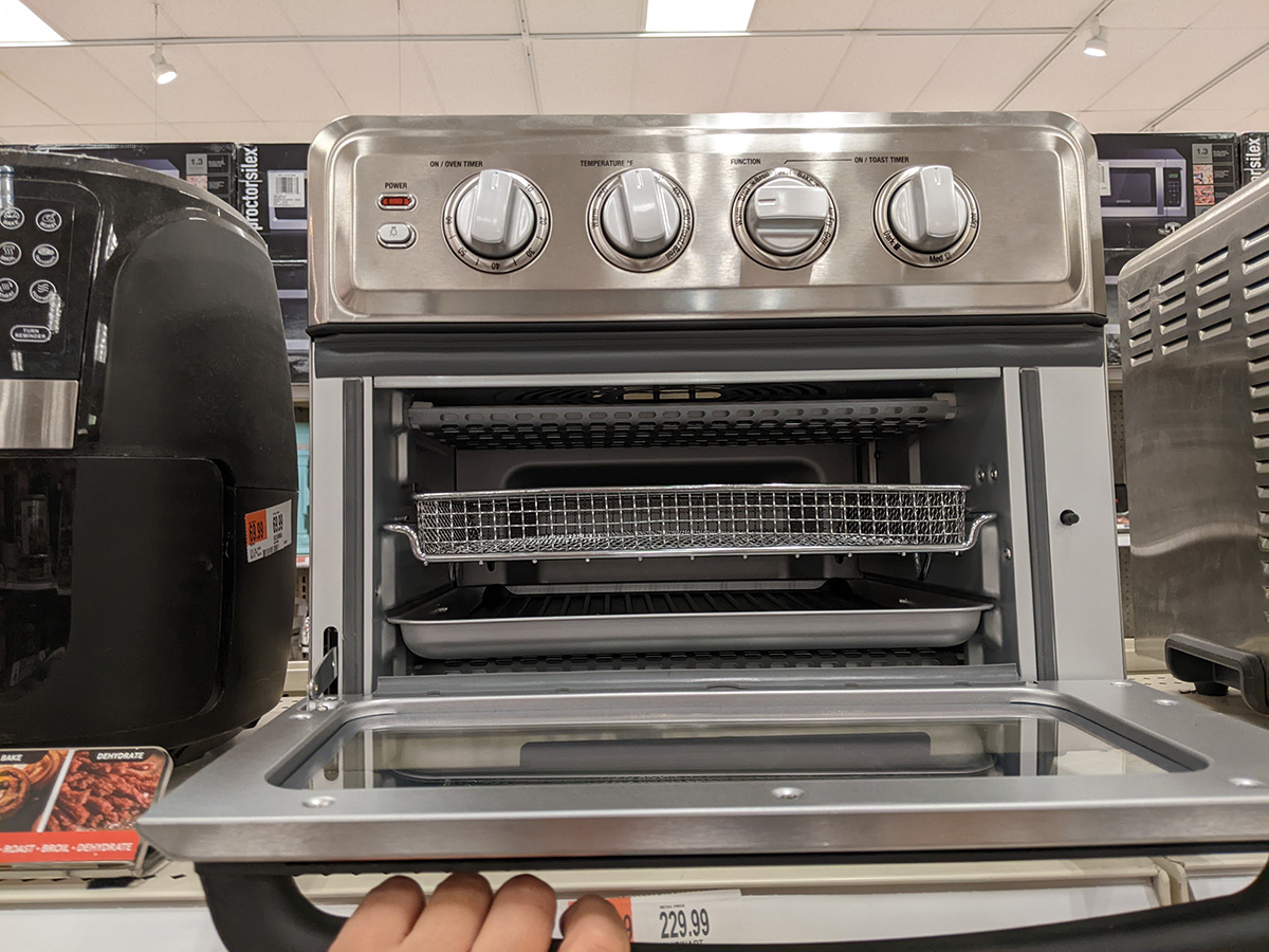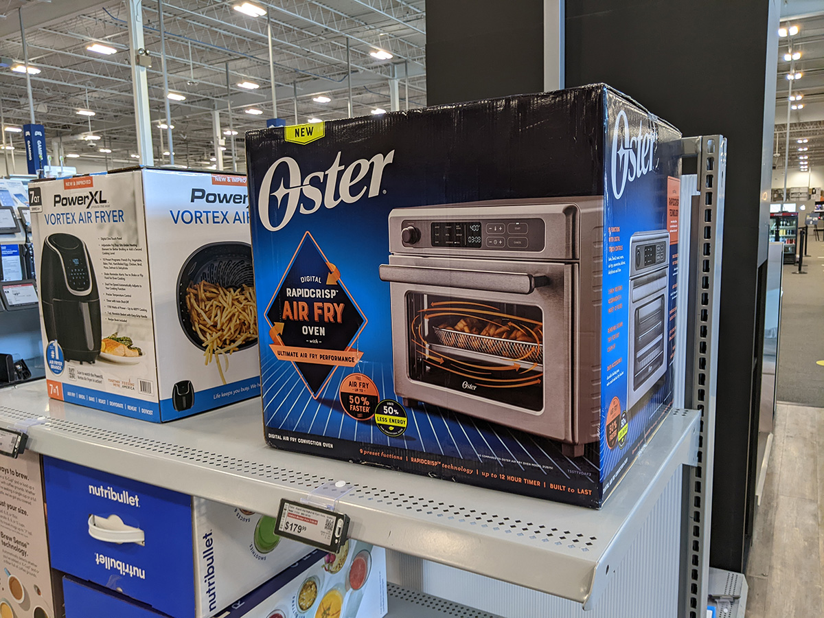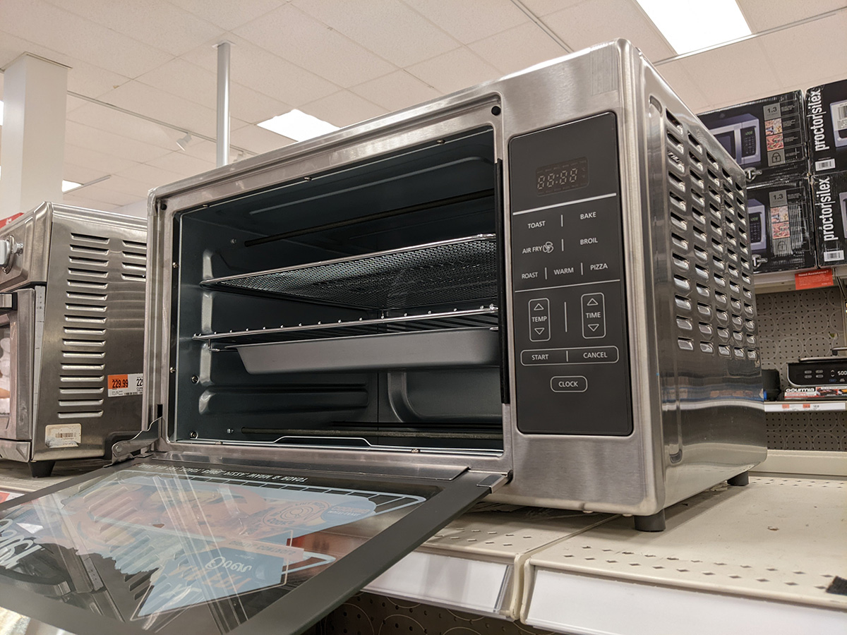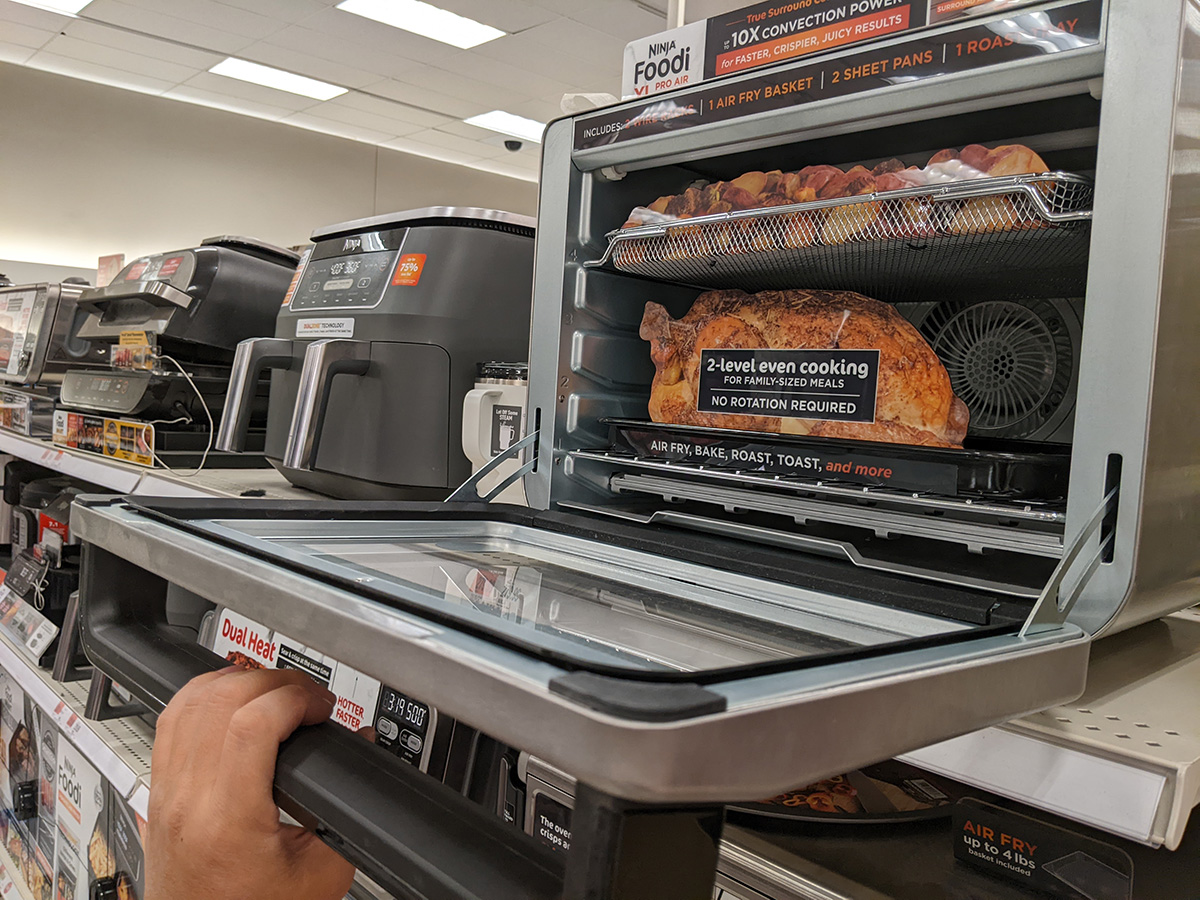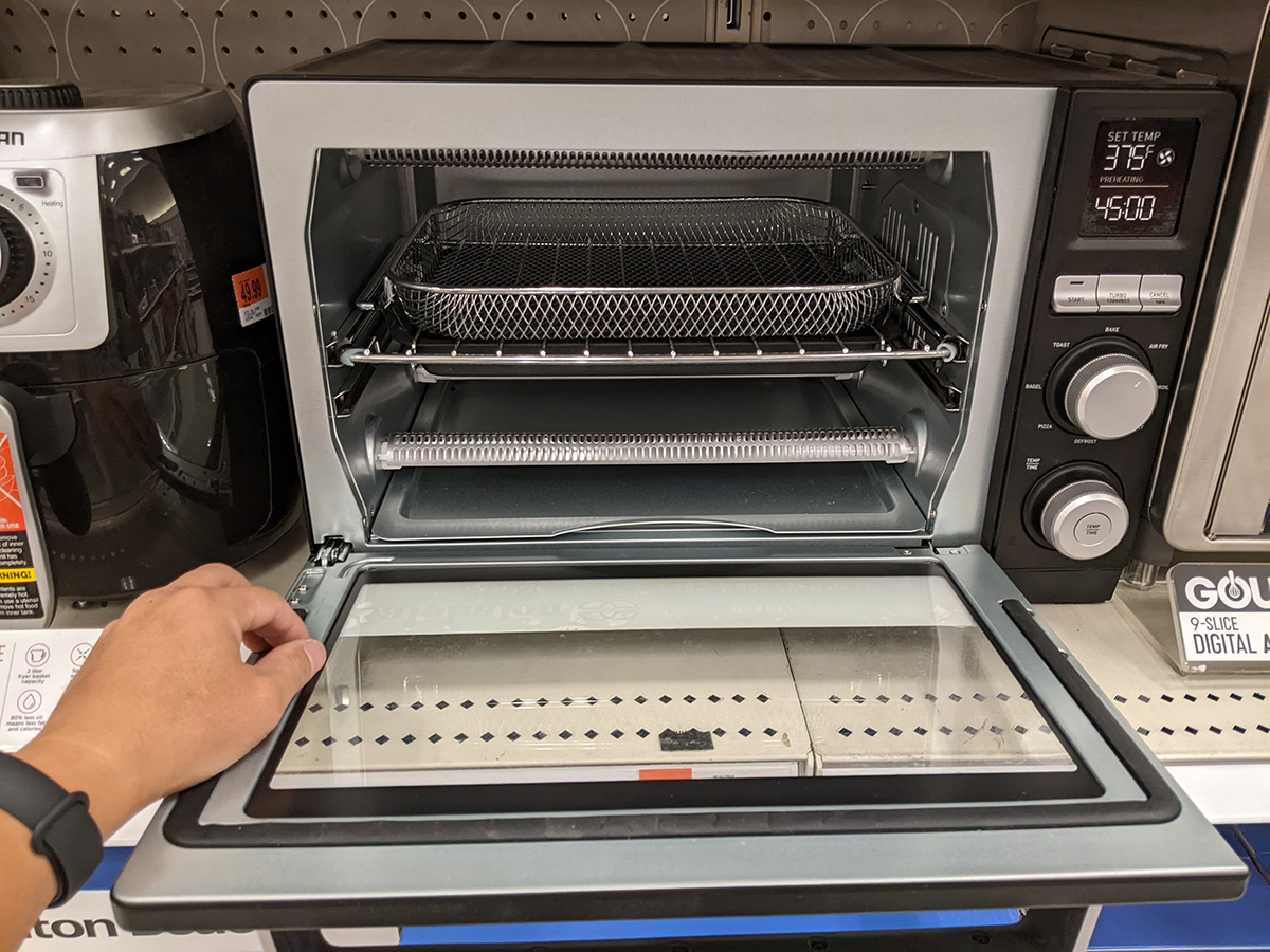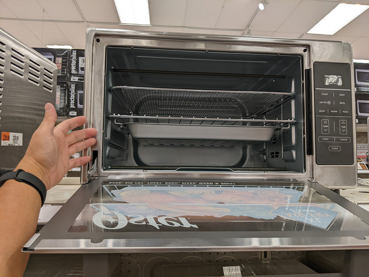 target had way better selection, though it seems the entire store is gearing up to supply college students. i did see floor models of the two ovens i'm most interested in: the oster XL air fry oven, and the ninja foodi XL pro air oven. they also had the calphalon air fry countertop oven out on display (they had one at best buy but it was boxed). i like the more rugged design, but i don't like there's only two rack position. far as these ovens go, the ninja seems to include the most accessories (2 wire racks, 1 air fry basket, 2 sheet pans, 2 roast pan), but the oster has the largest capacity, able to fit 2 16" pizzas. the knock on the oster ovens i've heard is the very thin glass door can get hot.