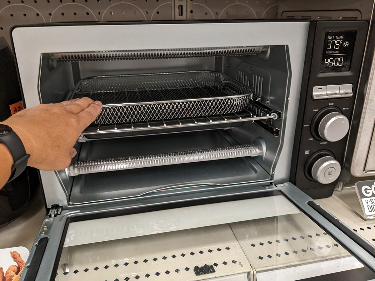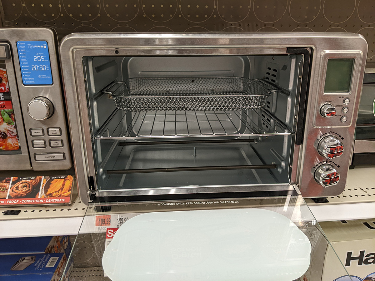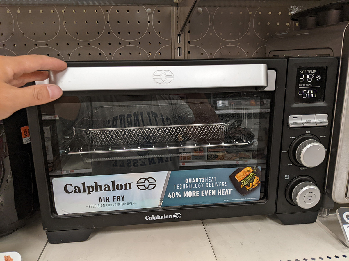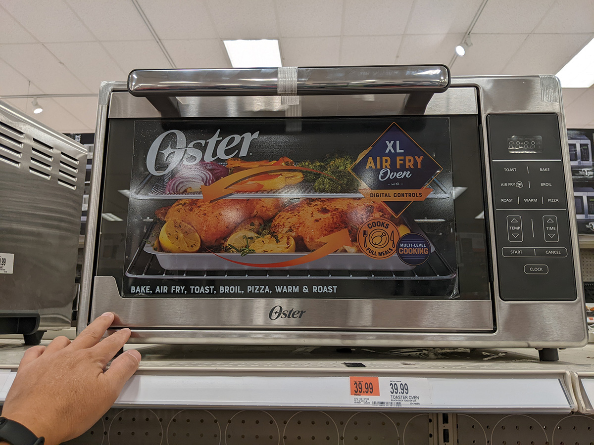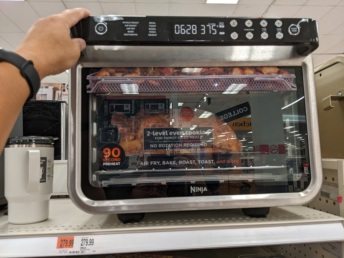 target had way better selection, though it seems the entire store is gearing up to supply college students. i did see floor models of the two ovens i'm most interested in: the oster XL air fry oven, and the ninja foodi XL pro air oven. they also had the calphalon air fry countertop oven out on display (they had one at best buy but it was boxed). i like the more rugged design, but i don't like there's only two rack position. far as these ovens go, the ninja seems to include the most accessories (2 wire racks, 1 air fry basket, 2 sheet pans, 2 roast pan), but the oster has the largest capacity, able to fit 2 16" pizzas. the knock on the oster ovens i've heard is the very thin glass door can get hot.