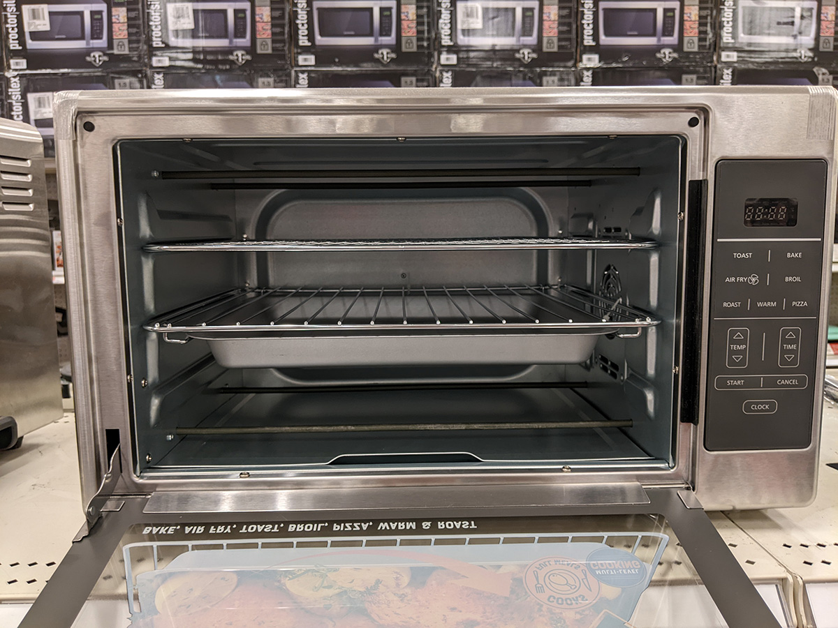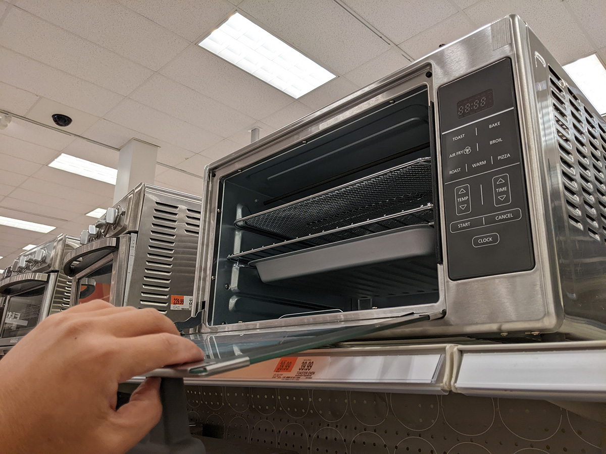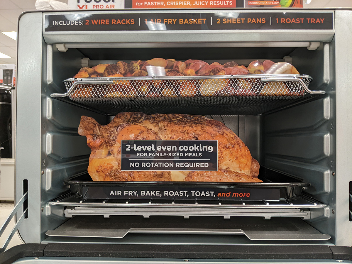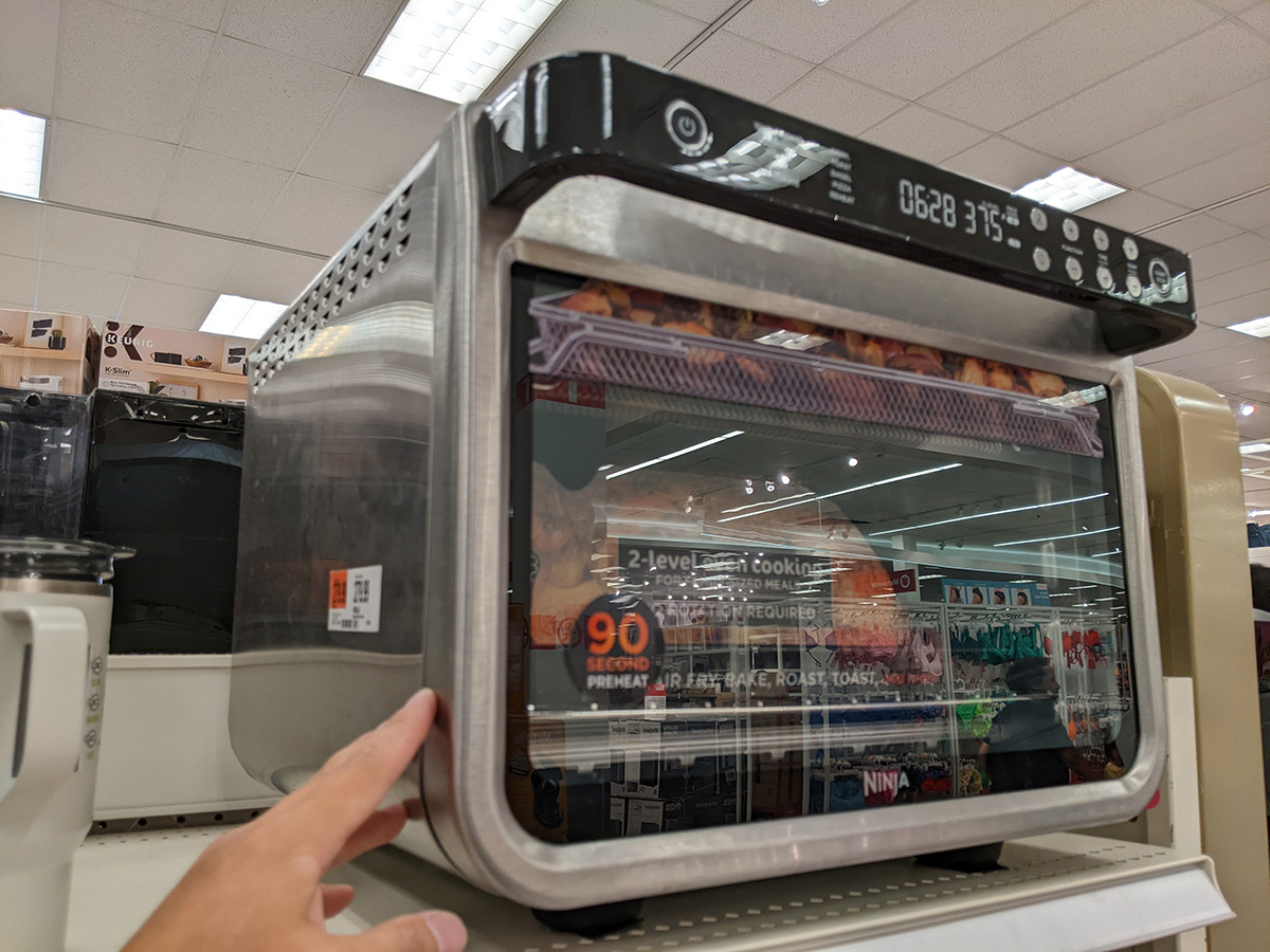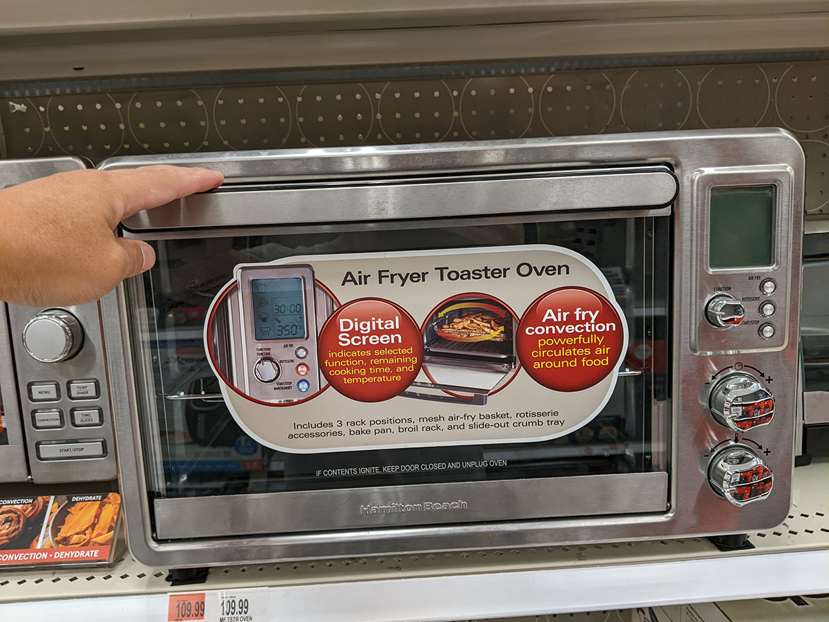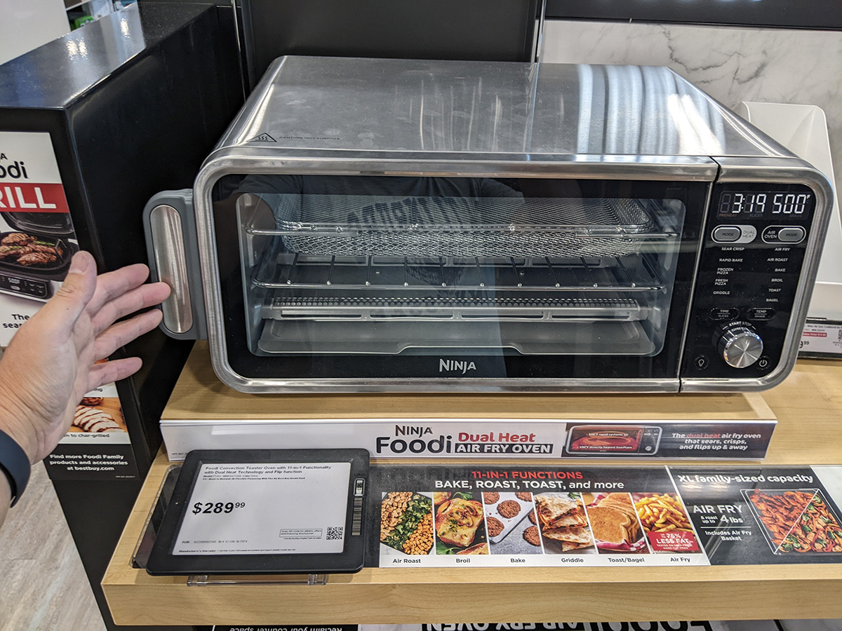 target had way better selection, though it seems the entire store is gearing up to supply college students. i did see floor models of the two ovens i'm most interested in: the oster XL air fry oven, and the ninja foodi XL pro air oven. they also had the calphalon air fry countertop oven out on display (they had one at best buy but it was boxed). i like the more rugged design, but i don't like there's only two rack position. far as these ovens go, the ninja seems to include the most accessories (2 wire racks, 1 air fry basket, 2 sheet pans, 2 roast pan), but the oster has the largest capacity, able to fit 2 16" pizzas. the knock on the oster ovens i've heard is the very thin glass door can get hot.