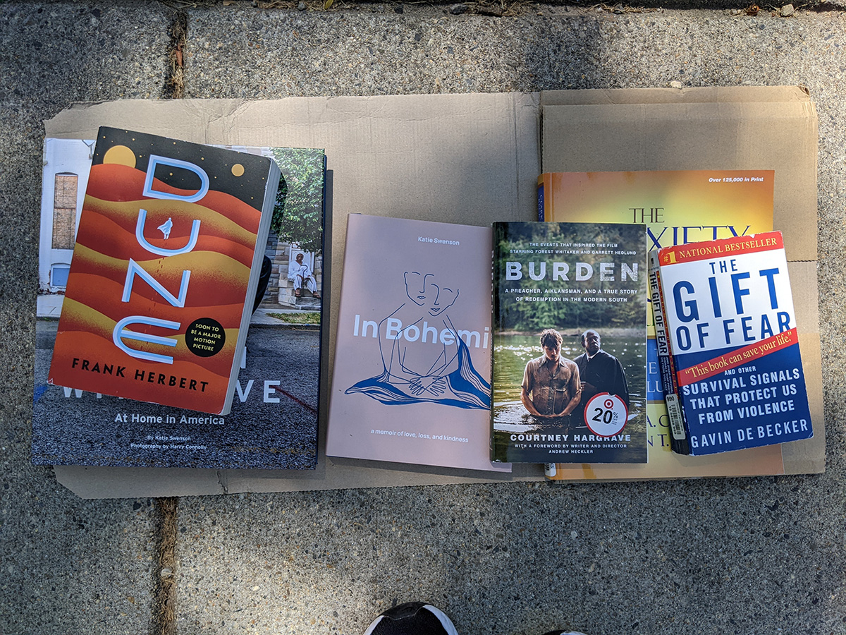 i went out this morning for my tuesday run. temperature was already in the 80's, but it was a dry heat, so it wasn't too bad, just hot. midway through my run, i got a text message from WWY, "[dog emoji] go to taiwan," which was referring to nancy pelosi's trip to the island. apparently all of china was captivated by the news, watching her arrival live on television, while it wasn't as much as an impact here in the US. coming back, i came across some unwanted books somebody had put outside of radcliffe college. one of them was a copy of dune, which i picked up. i've seen the movies and the mini-series, played the board game, and read parts of the book electronically on my phone (a bad copy, with indenting and margin issues). now i finally have a physical copy of my own (although to be honest, i prefer reading it on the phone, can take it with me anywhere). this is the latest print, the 47th edition of the ace trade paperback edition that was first published in august 2005. there's even a bookmark (queen of spades playing card), i'm guessing the original reader only got as far as page 164 before quitting (and throwing out the book).
