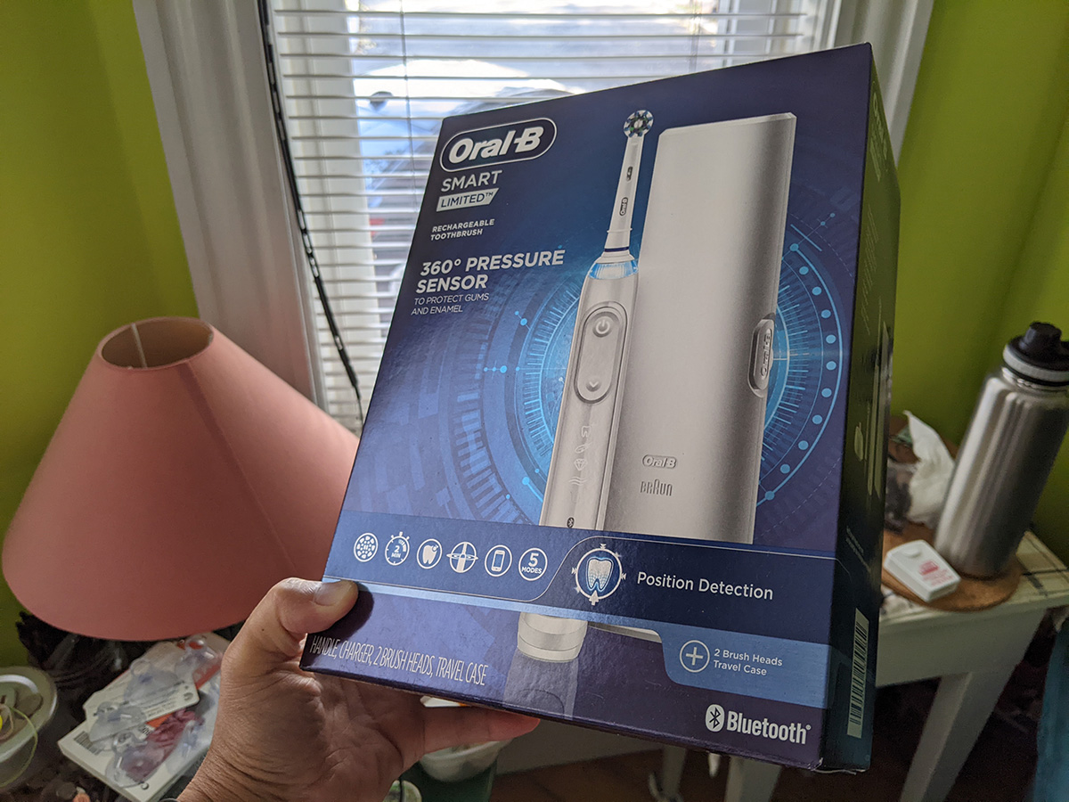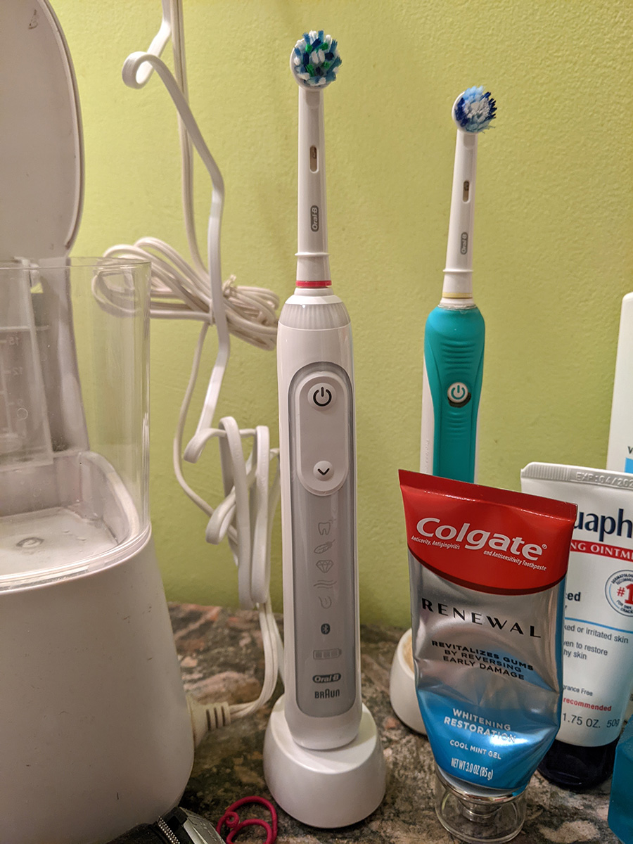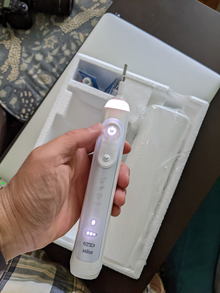 a package had arrived for me earlier: my new oral-b smart limited toothbrush. it was slightly larger than my old oral-b toothbrush, with an illuminated collar when turned on made it look like a child's toy. the light is useful for slightly illuminating your mouth while brushing, but also functions as a pressure alert light when you brush too hard. it came with a plastic storage case, 2 cross-action brush heads, and a charging station. i tried out the toothbrush. it has 6 brushing modes, but i used the default, which is regular brushing. to get it to show the red alert light, i had to press down very hard, so i'm glad i've been brushing with the normal amount of pressure. the oscillation seems pretty robust - supposedly 500% more effective than regular brushing, compared to my old oral-b which is only 300% more effective (and with a depleted battery, so who knows how well that old electric toothbrush was working).