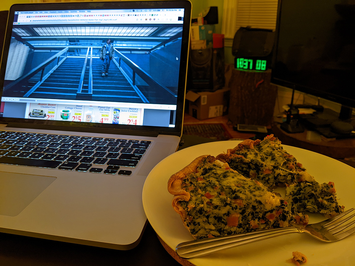 i got hungry in the late afternoon and remembered i had some store-bought potato salad (with horseradish) in the fridge. for dinner i finished the last two slices of quiche.