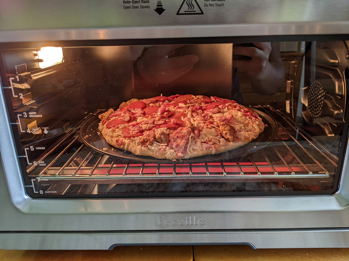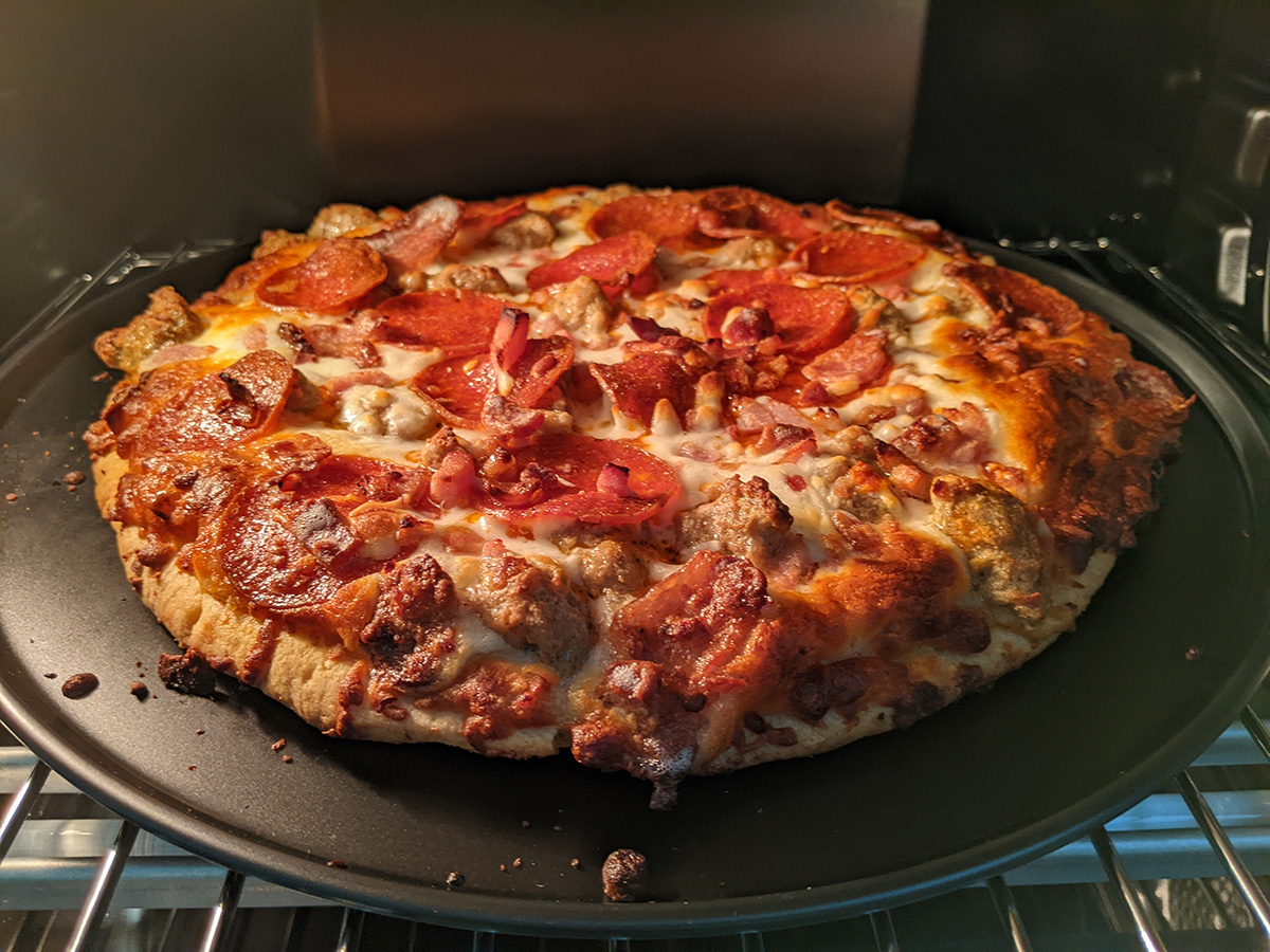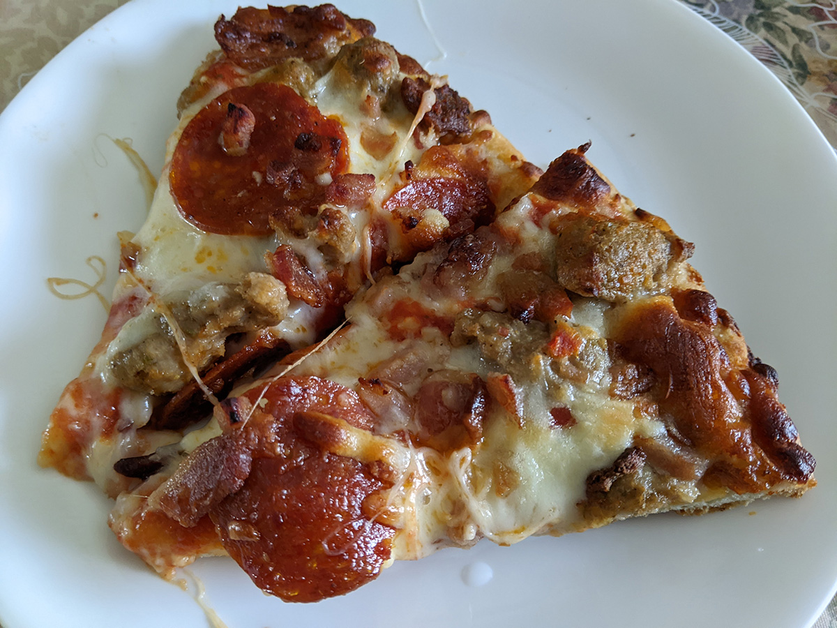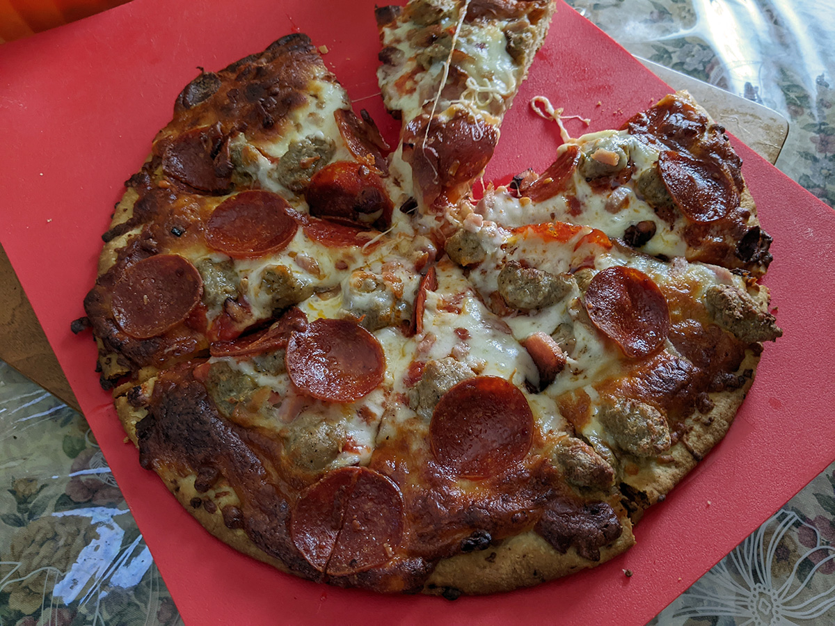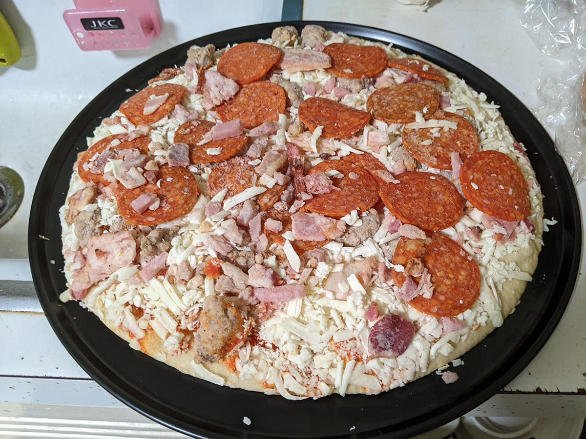 i thought the pizza was pretty good, or just as good as domino's, which i know isn't a high bar for pizza authenticity. my mother said it was too salty and didn't eat any of the crust, throwing them away. my father sliced the pizza into 8 pieces, we both had 3.