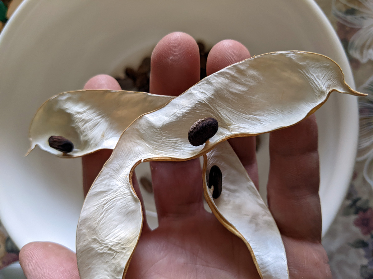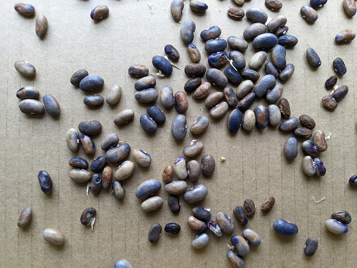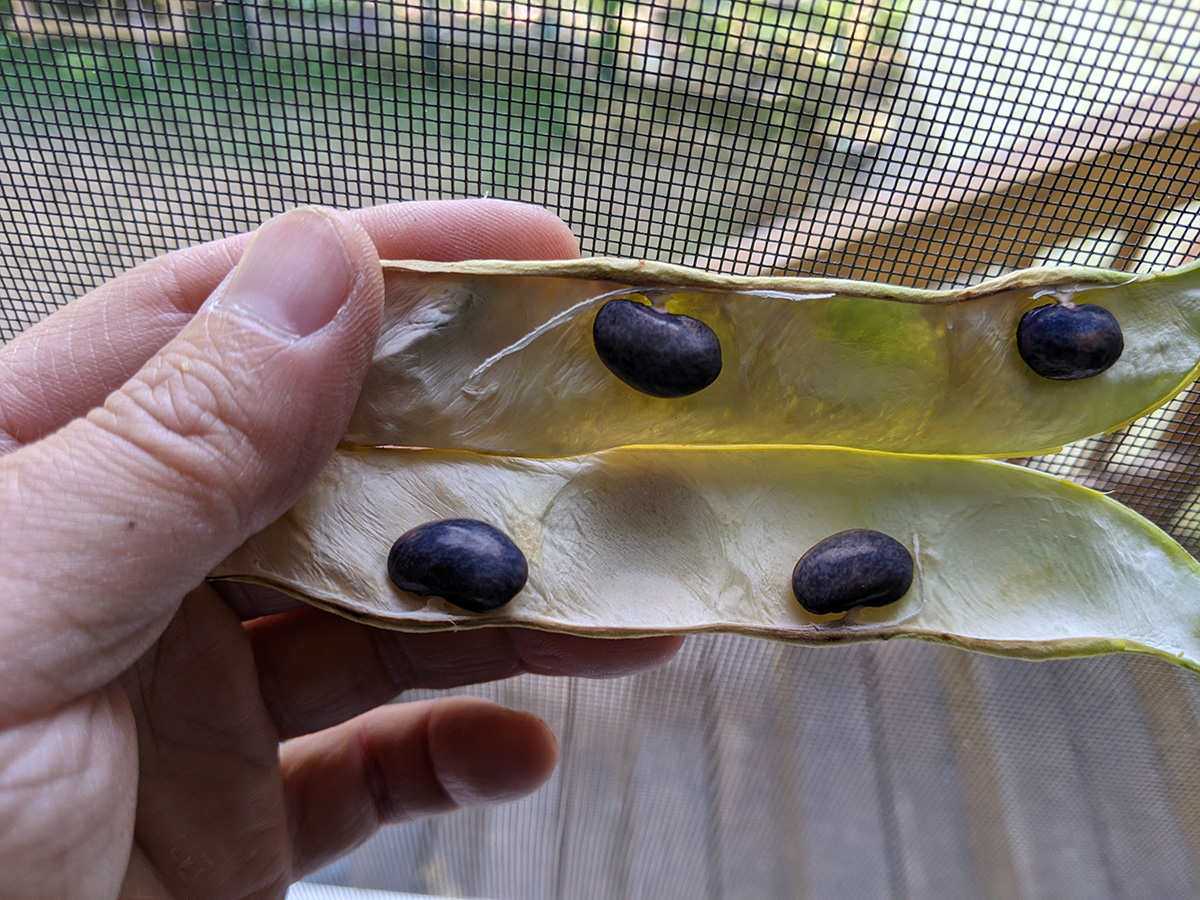back inside the house, i shelled the bean pods to collect the beans. i noticed many of the long beans were smaller than before, stunted by the drought. as for the blue beans, some were blue, but there were also many biege beans, and most seemed smaller than before. but we should have enough beans for next season.