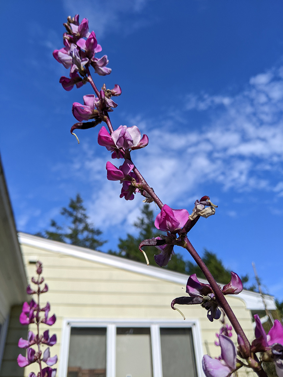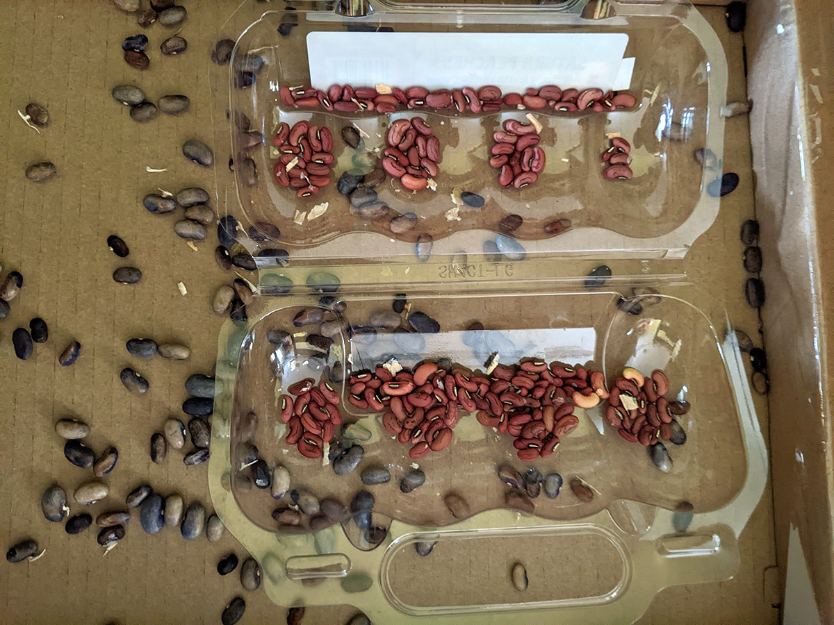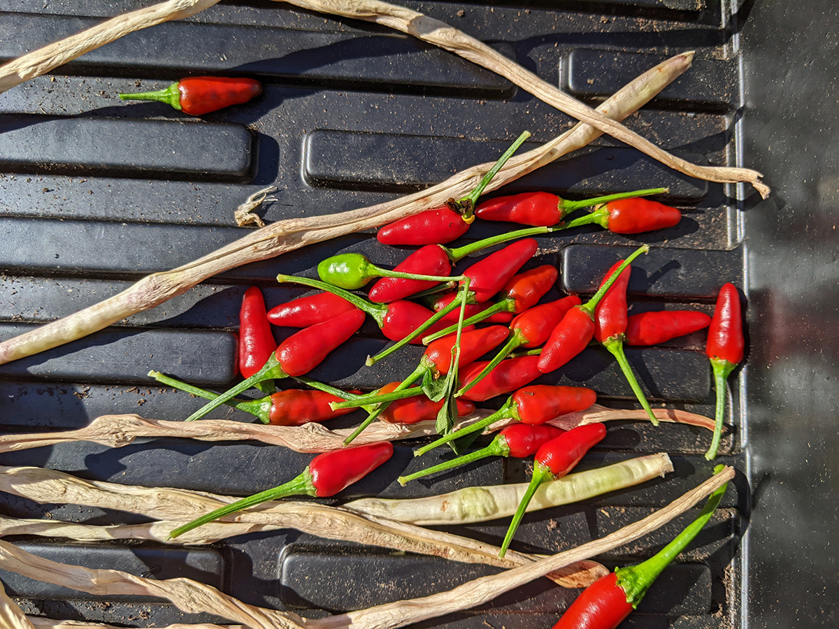back inside the house, i shelled the bean pods to collect the beans. i noticed many of the long beans were smaller than before, stunted by the drought. as for the blue beans, some were blue, but there were also many biege beans, and most seemed smaller than before. but we should have enough beans for next season.