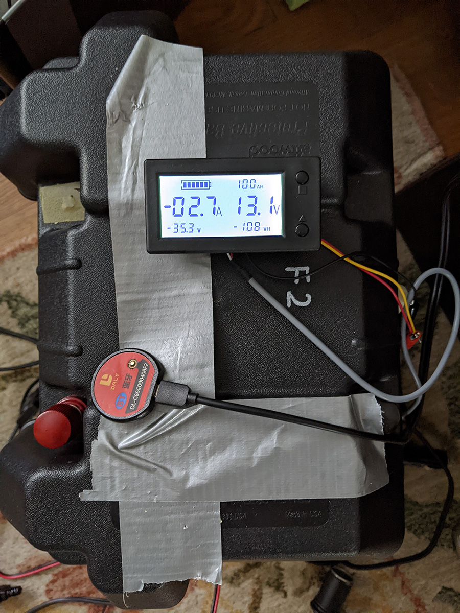 since we drained the LiFePo4 battery yesterday, my father has been recharging it back up. this time we went through the hale sensor meter, and could see the Wh decreasing into the negative territory (which is normal). the battery total however doesn't change - remains fixed at 100Ah - since we reset the meter before recharging.