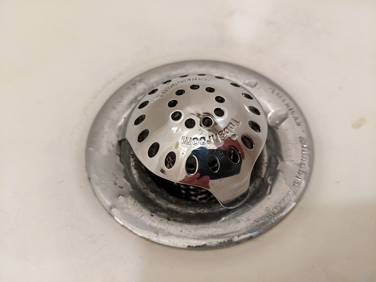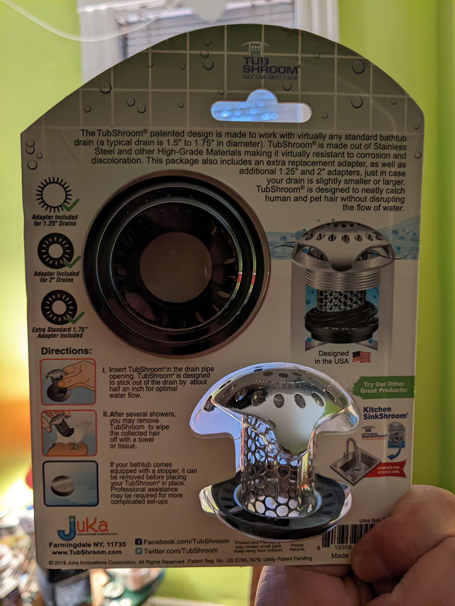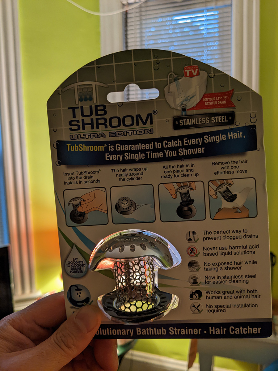 i returned home after dinner. i was eager to try out the tubshroom. it seemed to fit the tub okay, and the drain didn't clog after my shower - although ever since my haircut yesterday, i don't think i'll need to worry about clogging the drain with hair anytime soon. the design is pretty clever - and the shiny chrome makes it look like it's a part of the tub hardware.